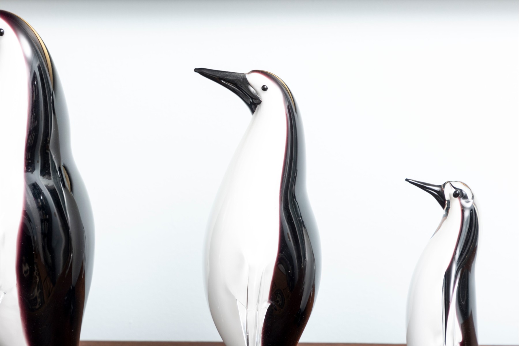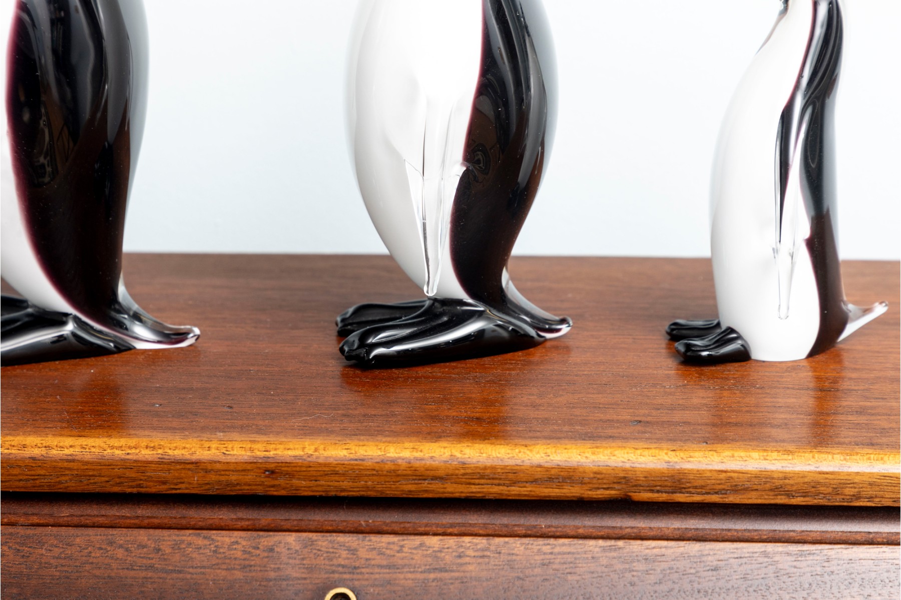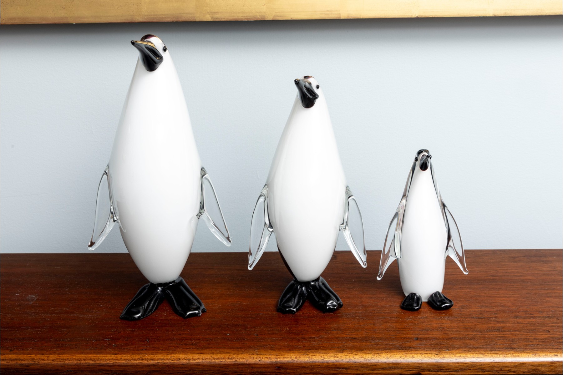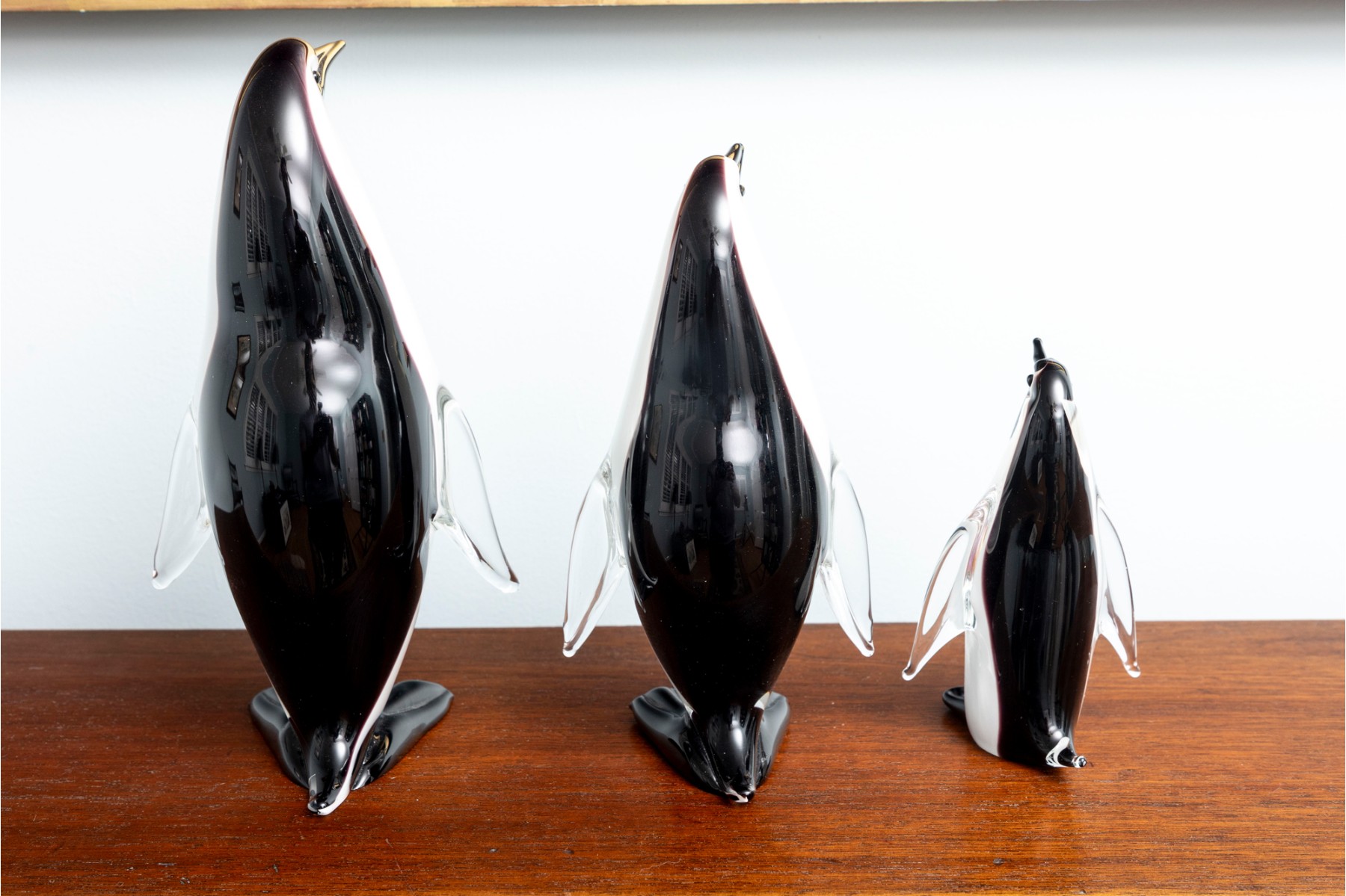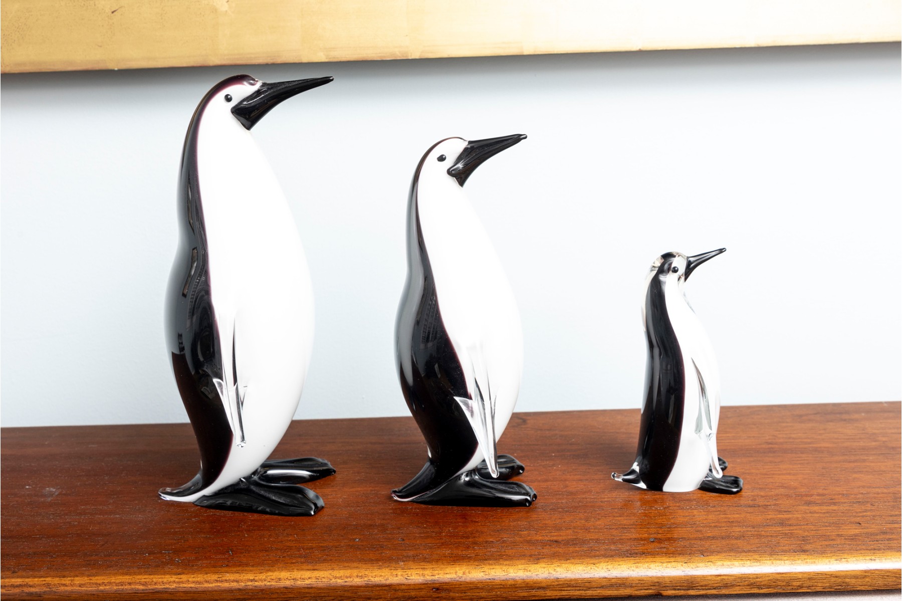 Three penguins of different sizes forming a group, in blown overlaid black and white Murano glass. Presumably crafted by Formia Vetri di or Formia Glass, Italy.
