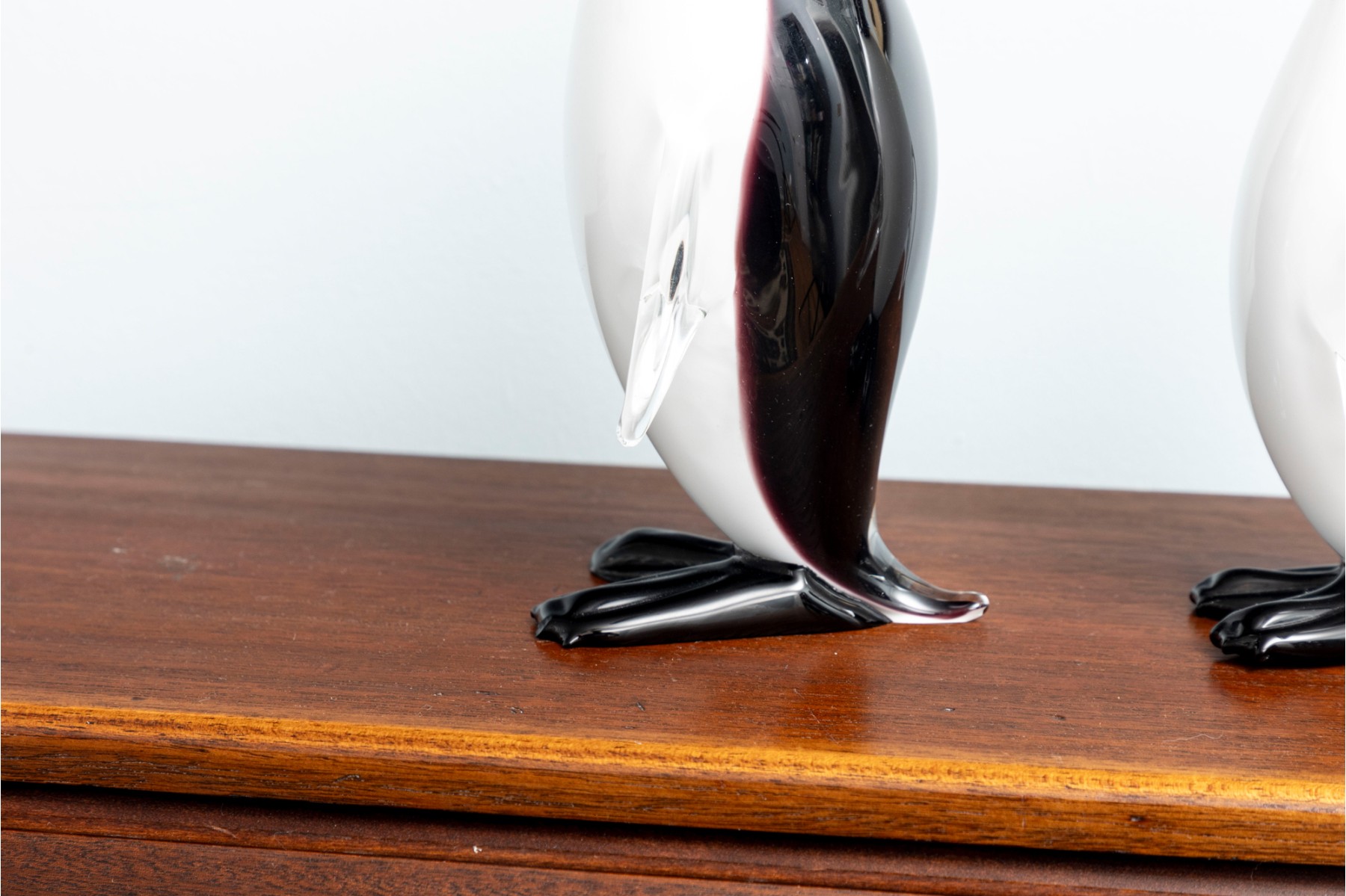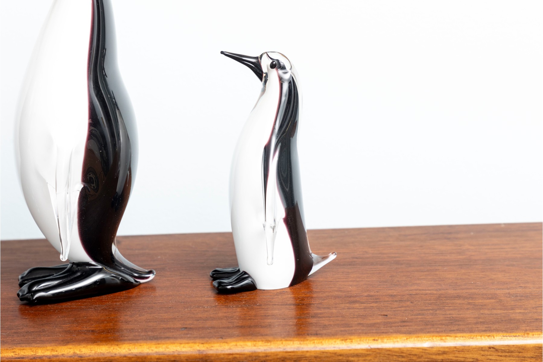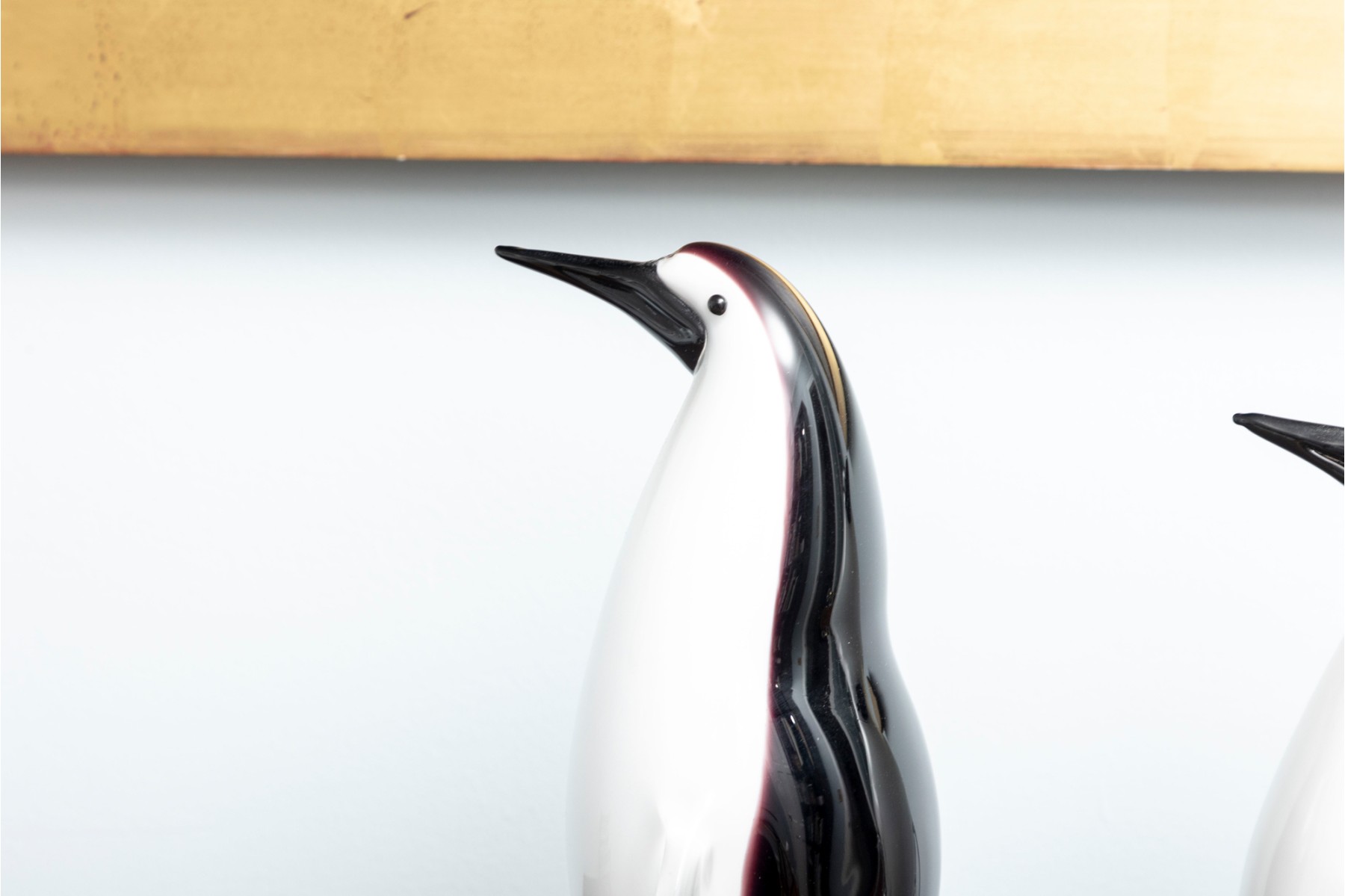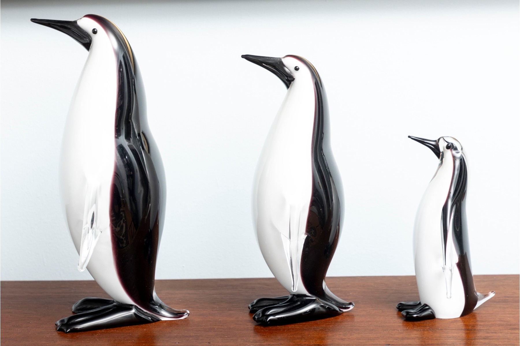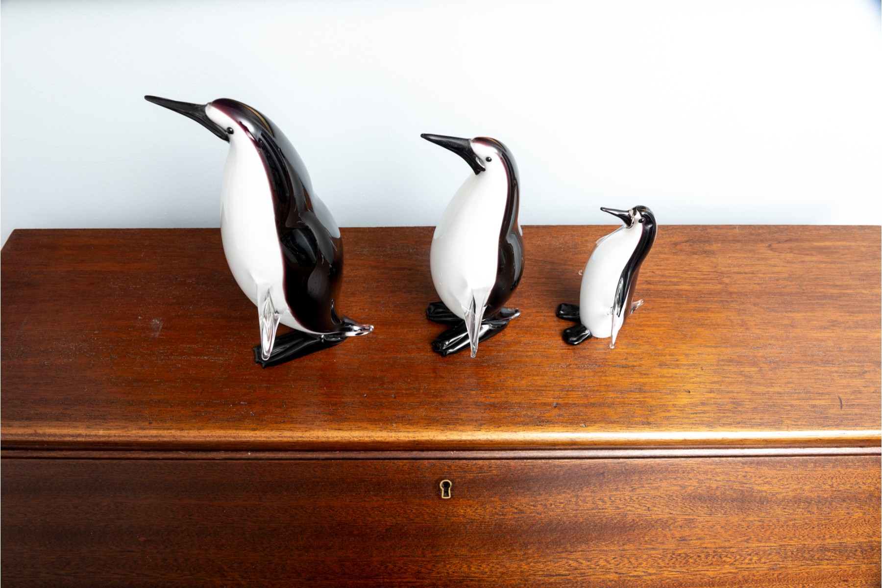 Three penguins of different sizes forming a group, in blown overlaid black and white Murano glass. Presumably crafted by Formia Vetri di or Formia Glass, Italy.