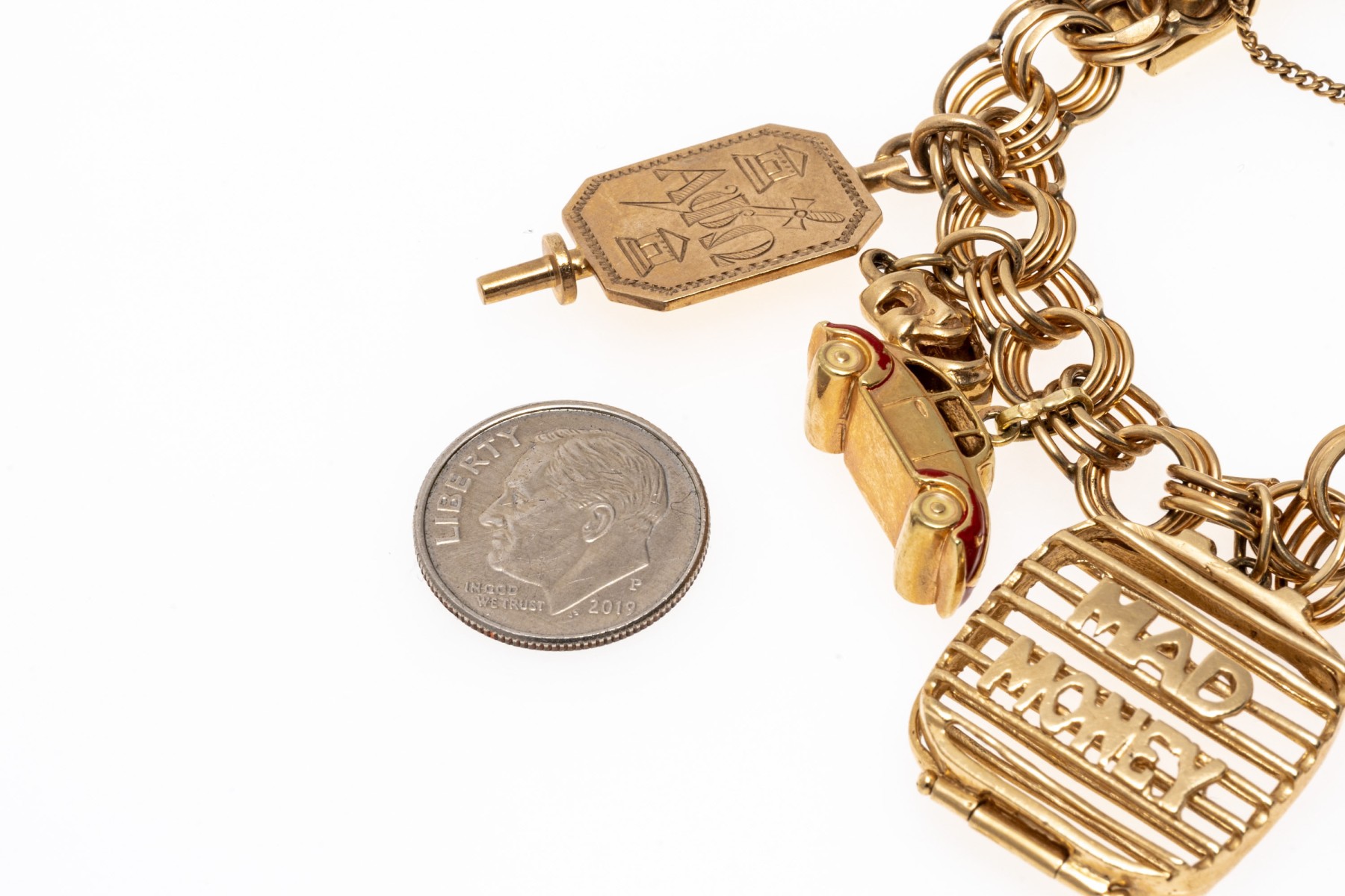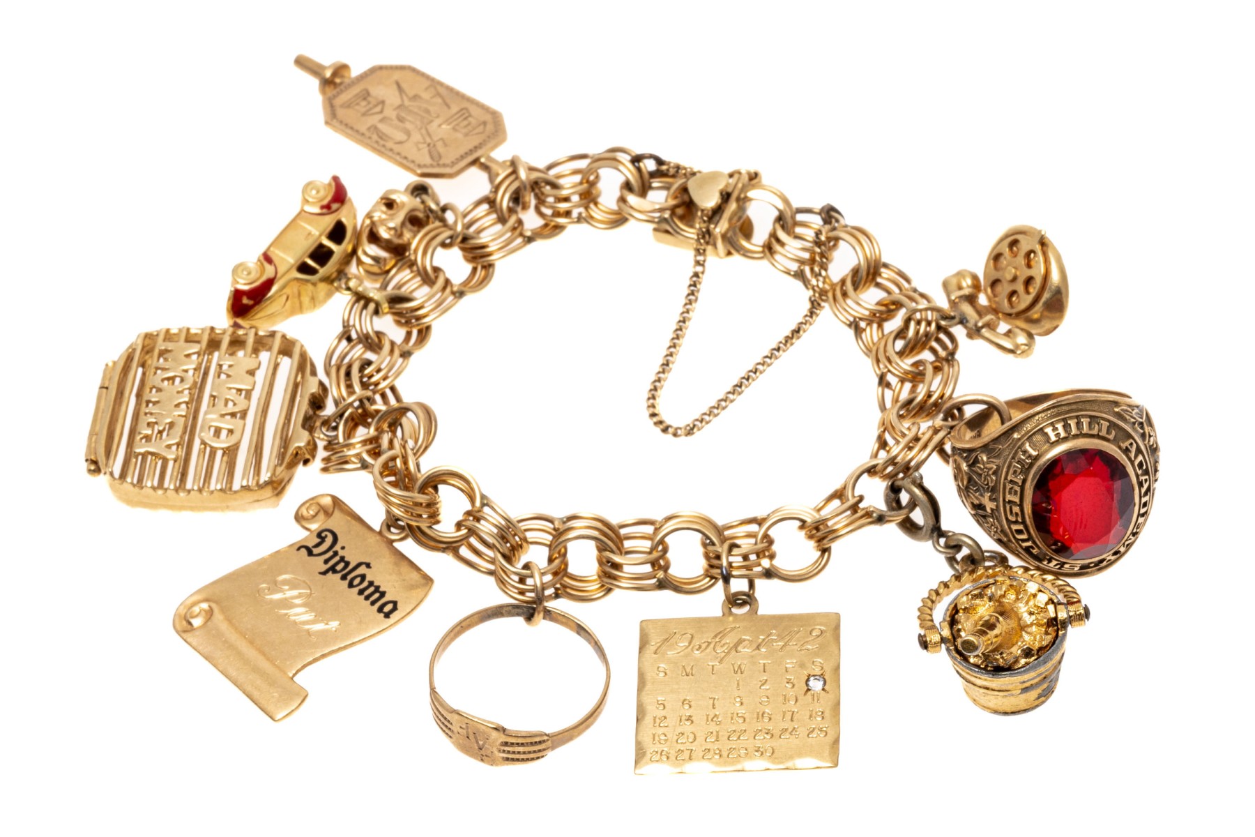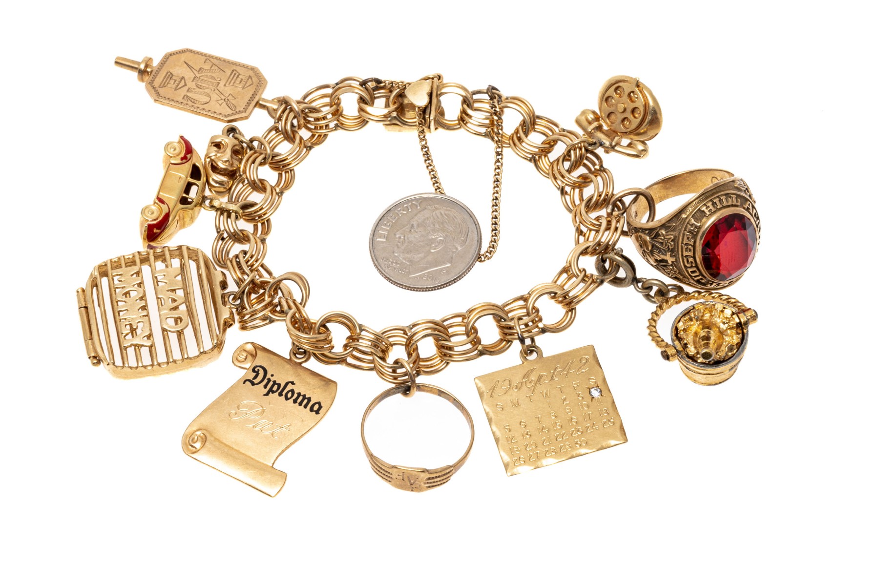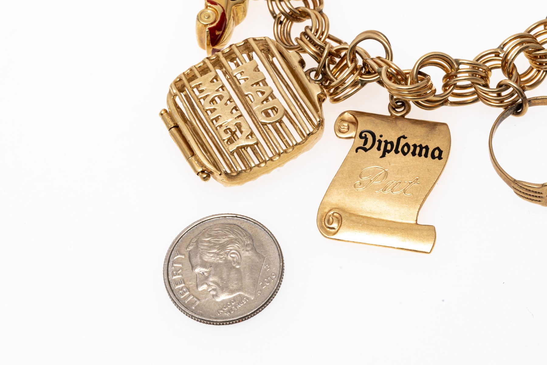 14K yellow gold chain charm bracelet. Displayed from the bracelet are various charms of 14K and 10K yellow gold. The 10K charms include key fob and two rings. The 14K charms are masks, 'Mad Money', diploma, car, phone and calendar. With the bracelet is one additional 14K heart shaped charm. Hidden box style clasp with safety chain.