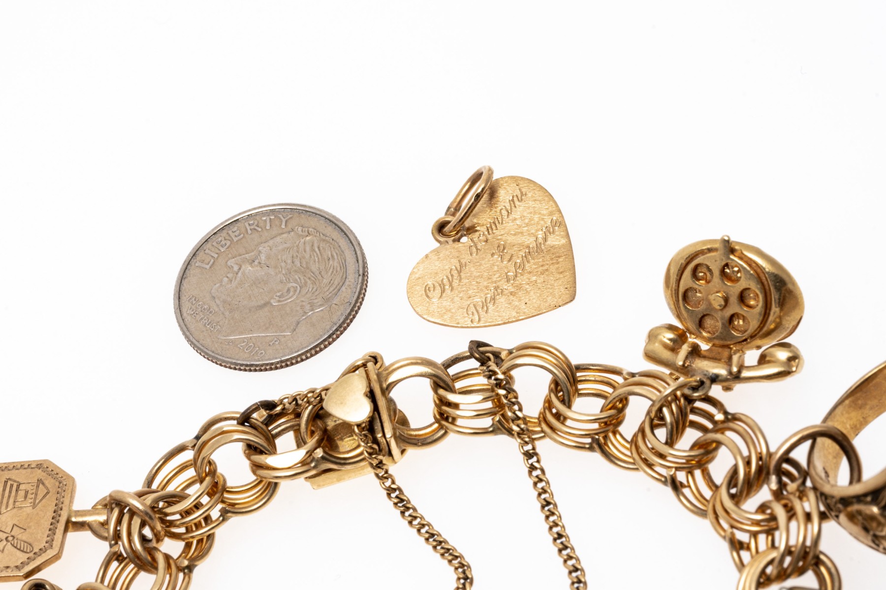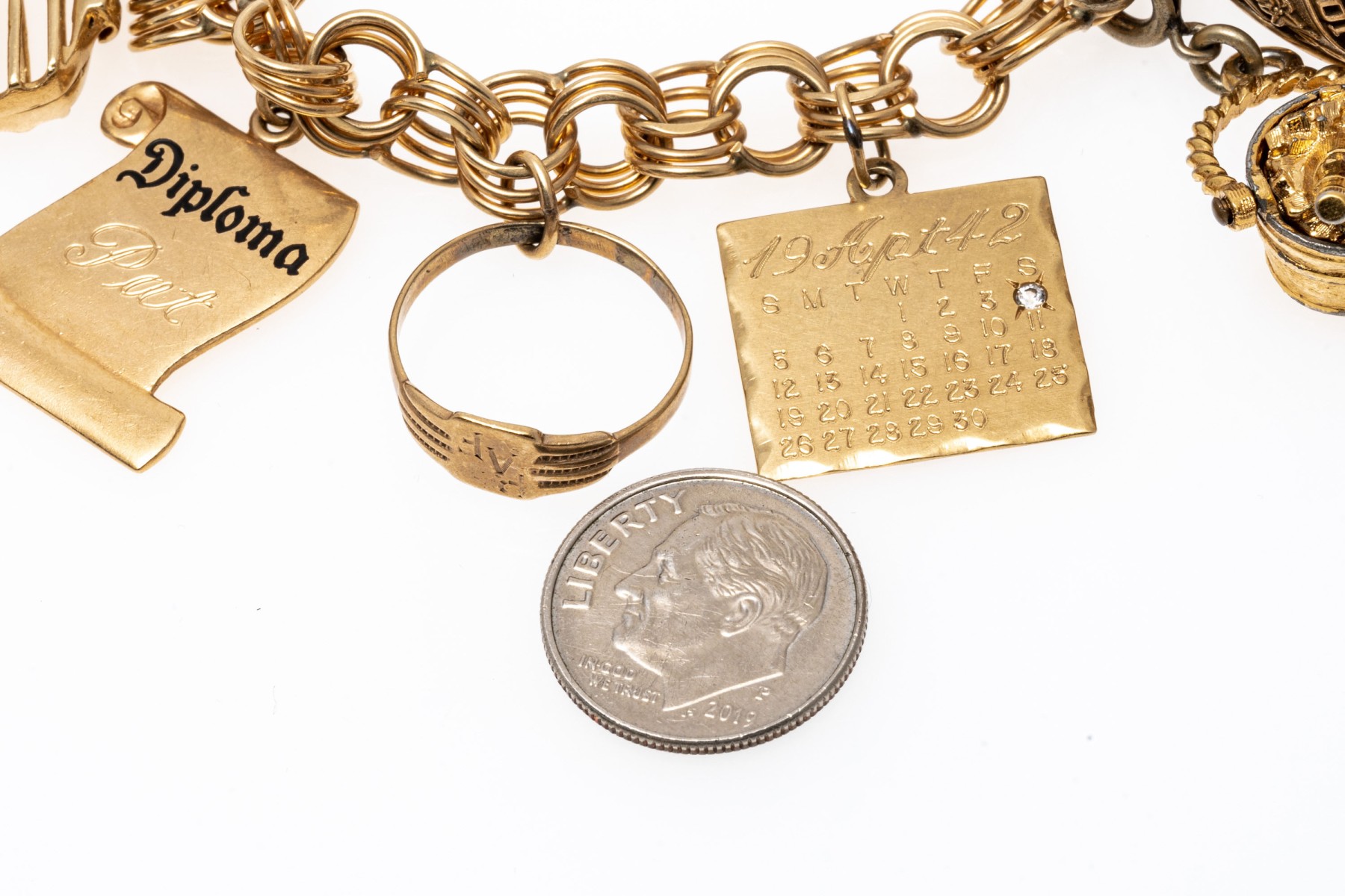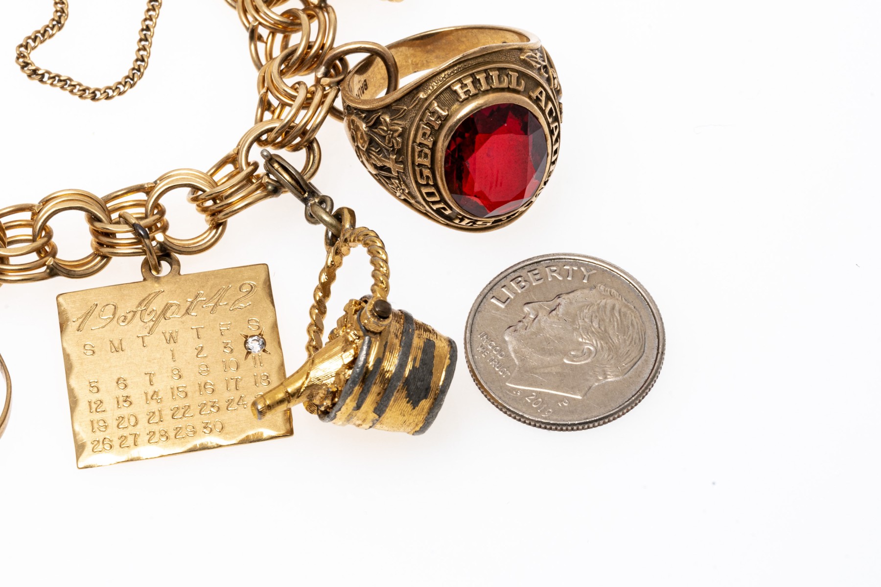14K yellow gold chain charm bracelet. Displayed from the bracelet are various charms of 14K and 10K yellow gold. The 10K charms include key fob and two rings. The 14K charms are masks, 'Mad Money', diploma, car, phone and calendar. With the bracelet is one additional 14K heart shaped charm. Hidden box style clasp with safety chain.