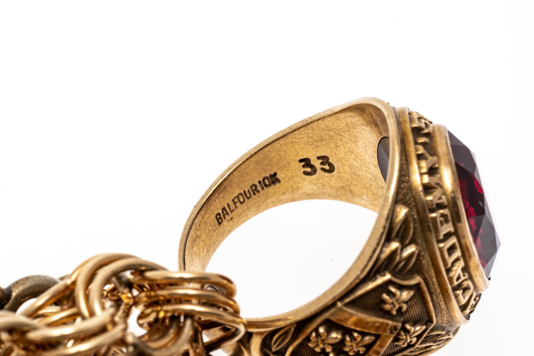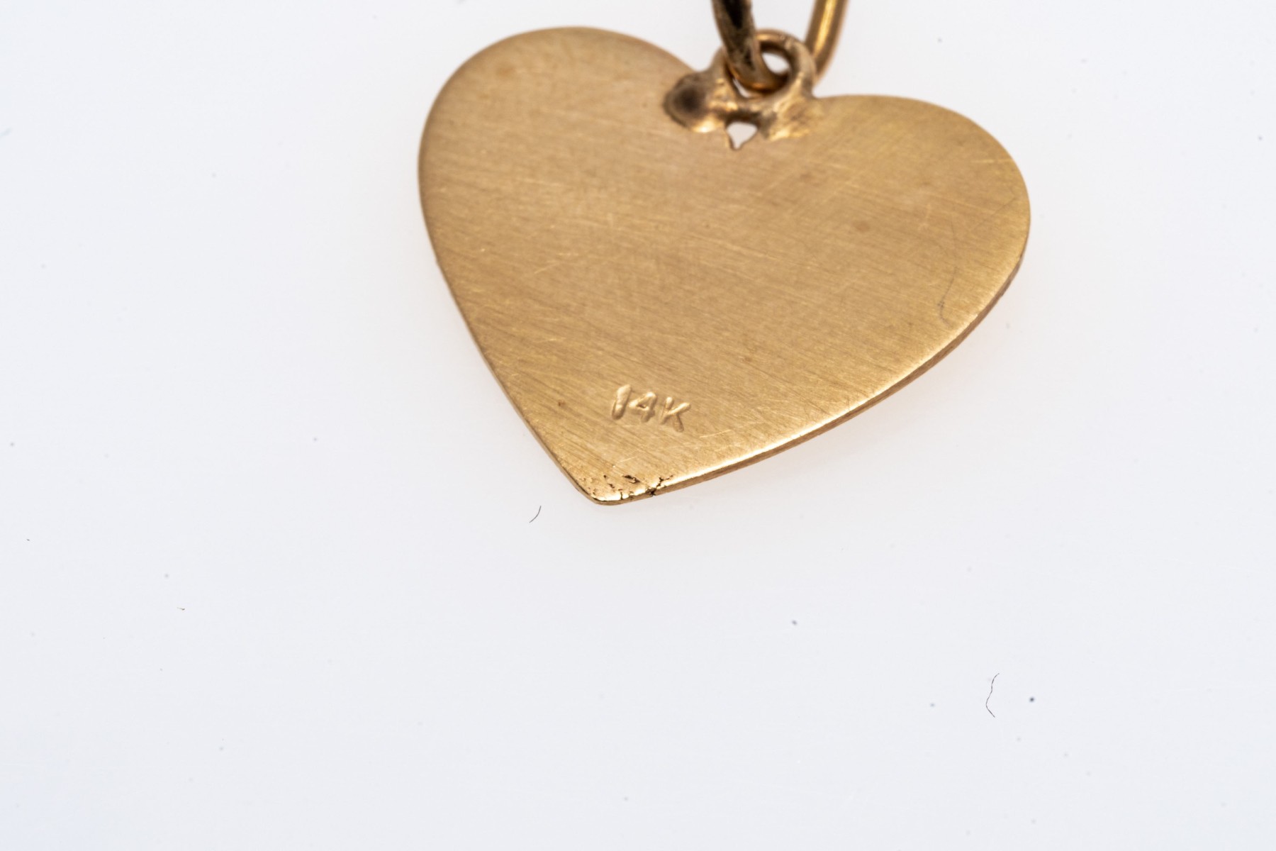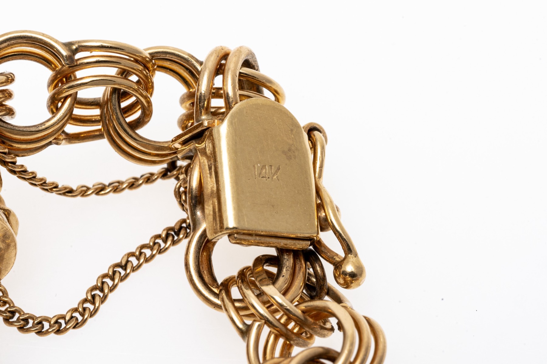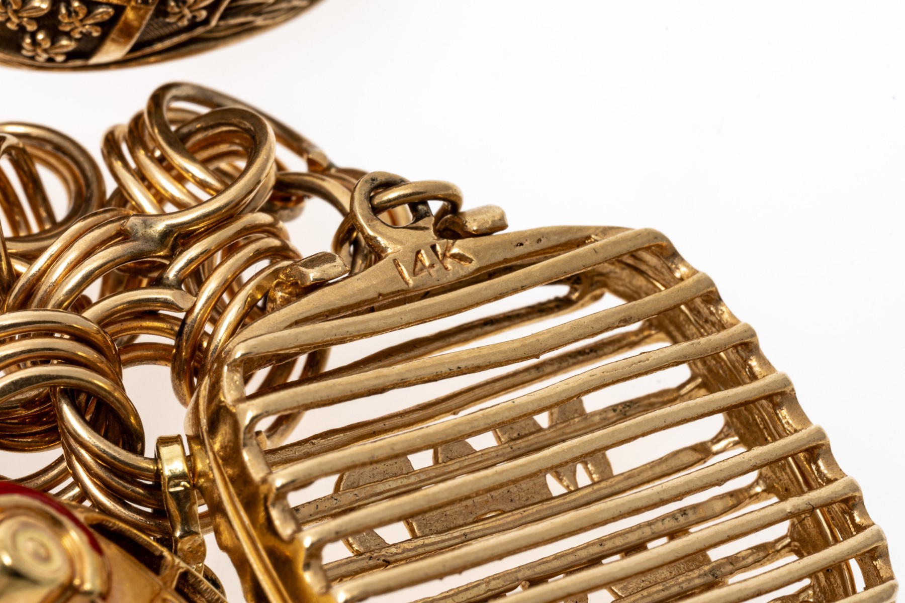 14K yellow gold chain charm bracelet. Displayed from the bracelet are various charms of 14K and 10K yellow gold. The 10K charms include key fob and two rings. The 14K charms are masks, 'Mad Money', diploma, car, phone and calendar. With the bracelet is one additional 14K heart shaped charm. Hidden box style clasp with safety chain.