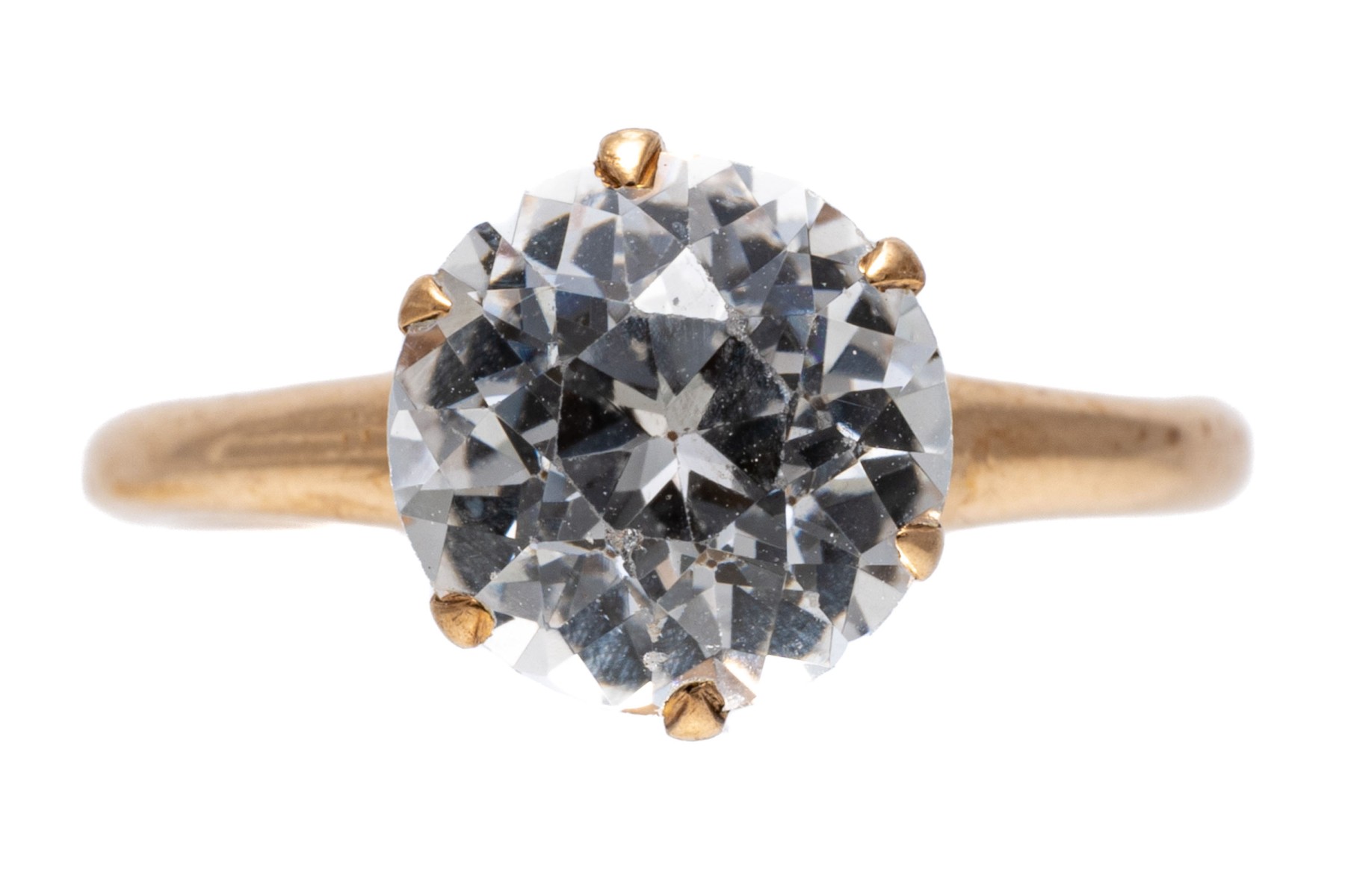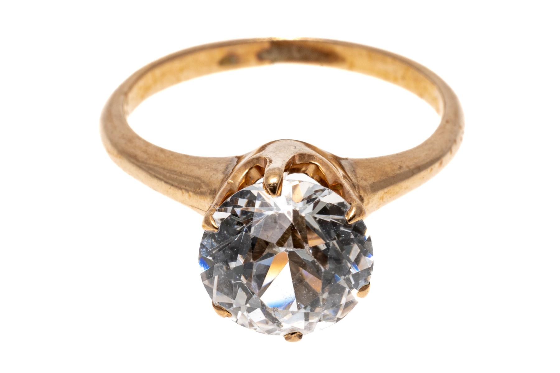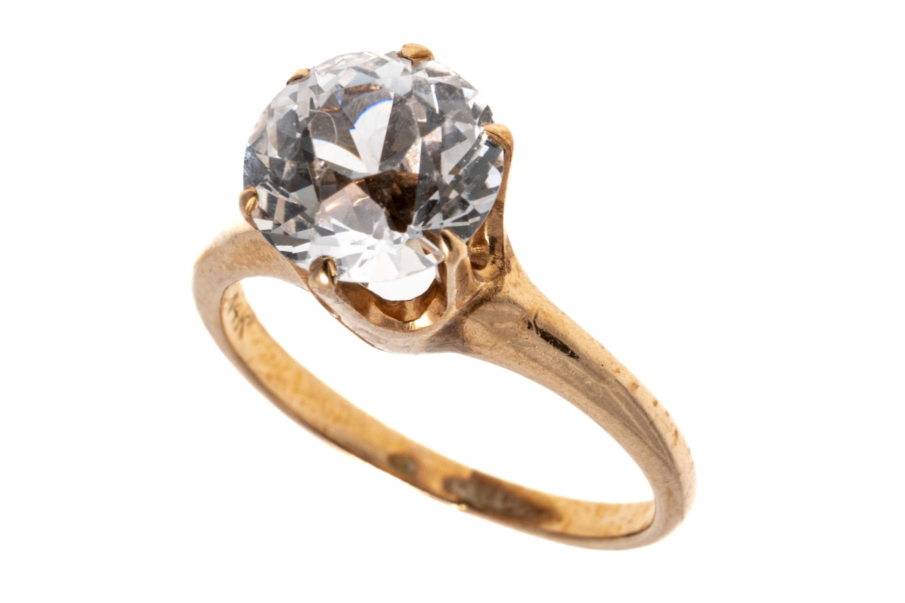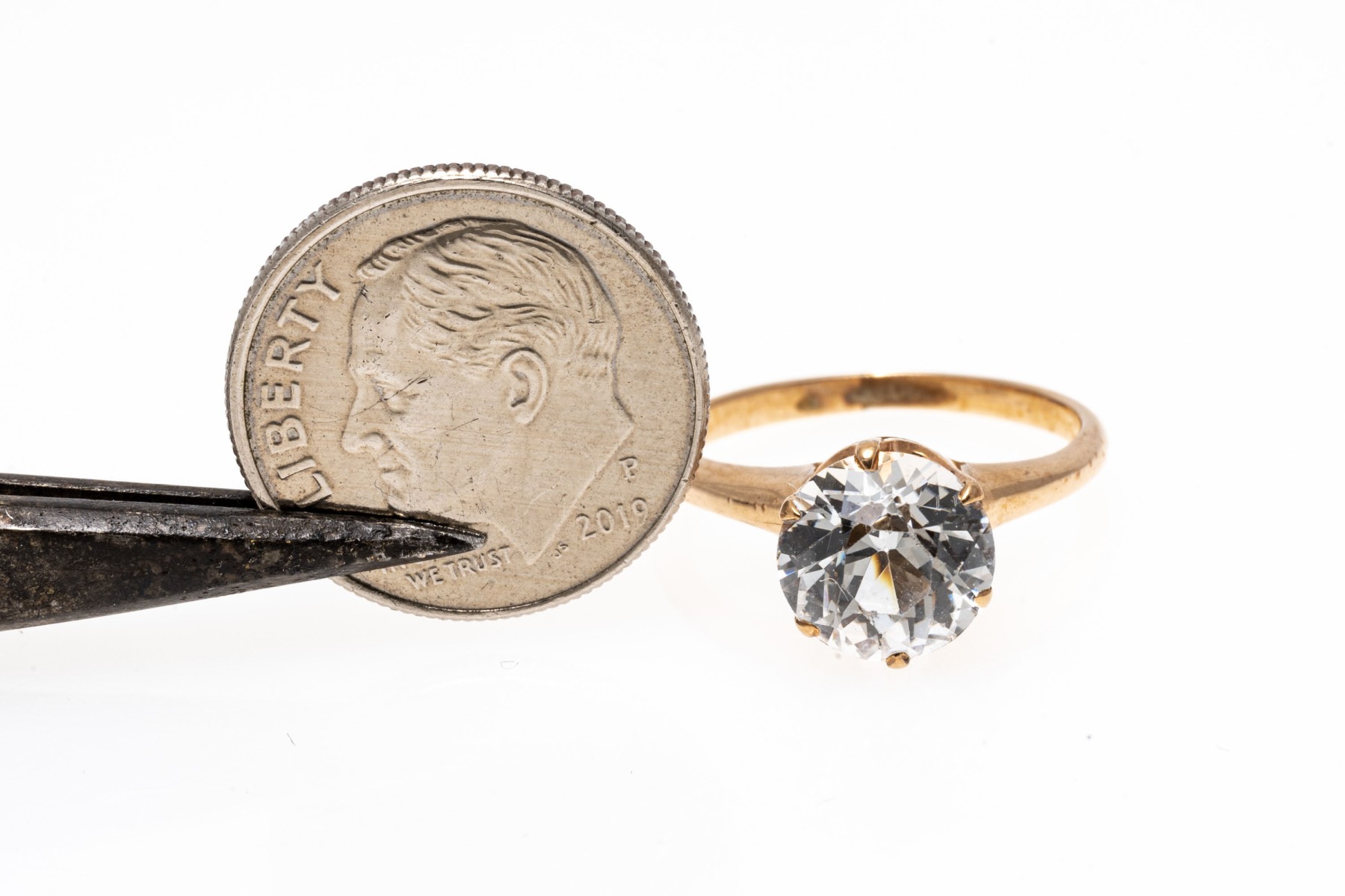 Fantastic 14K yellow gold ring. Prong set into the ring is a single round cut white sapphire, approximately 2.52 cts. Ring size 5-.