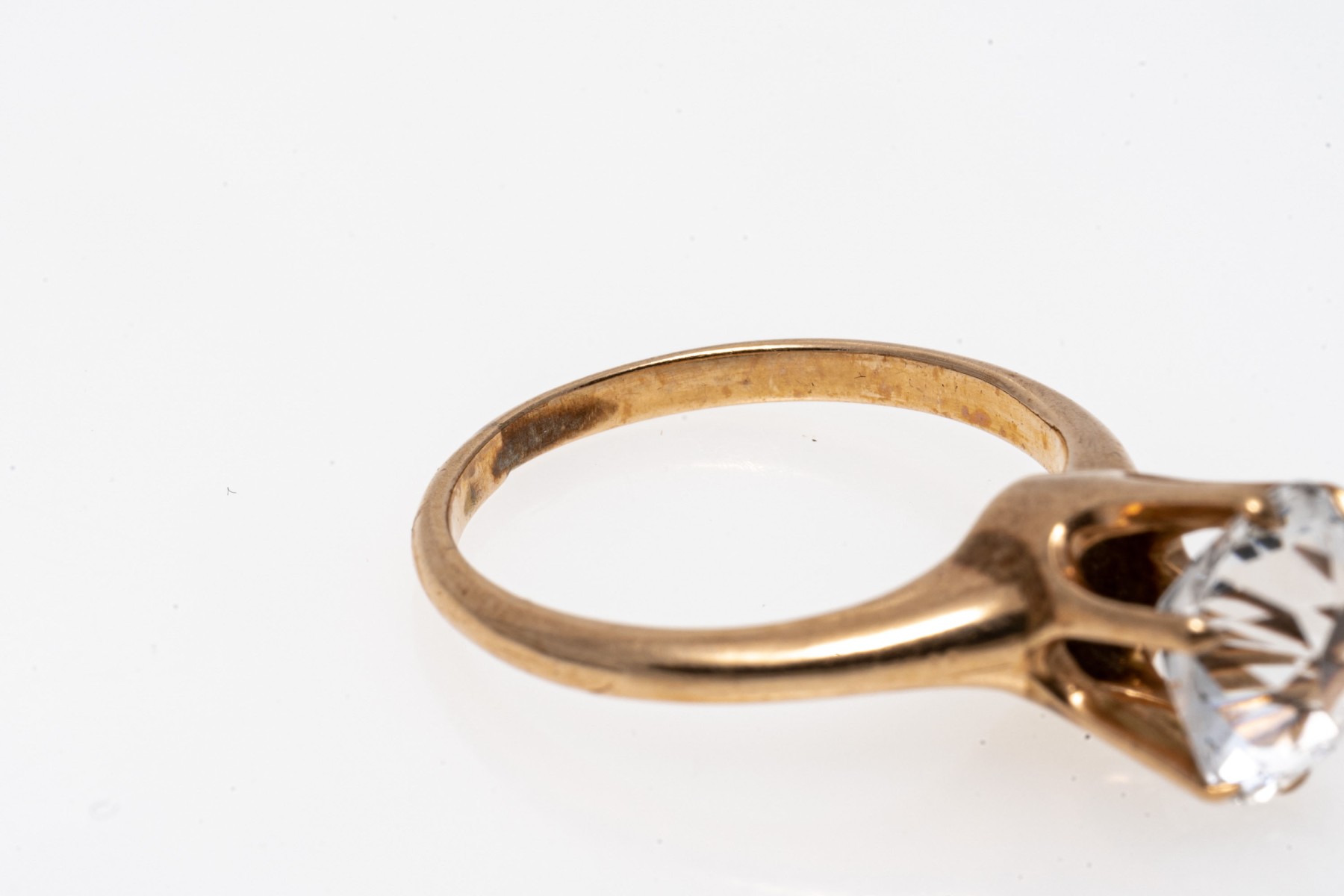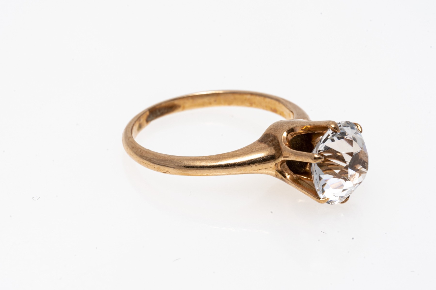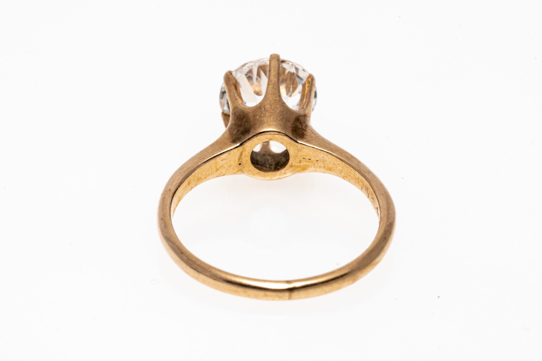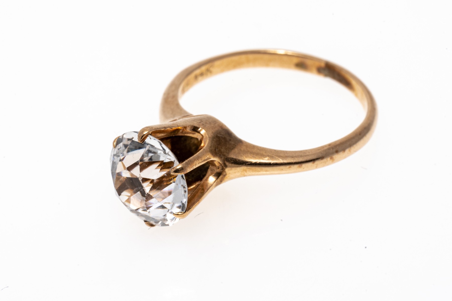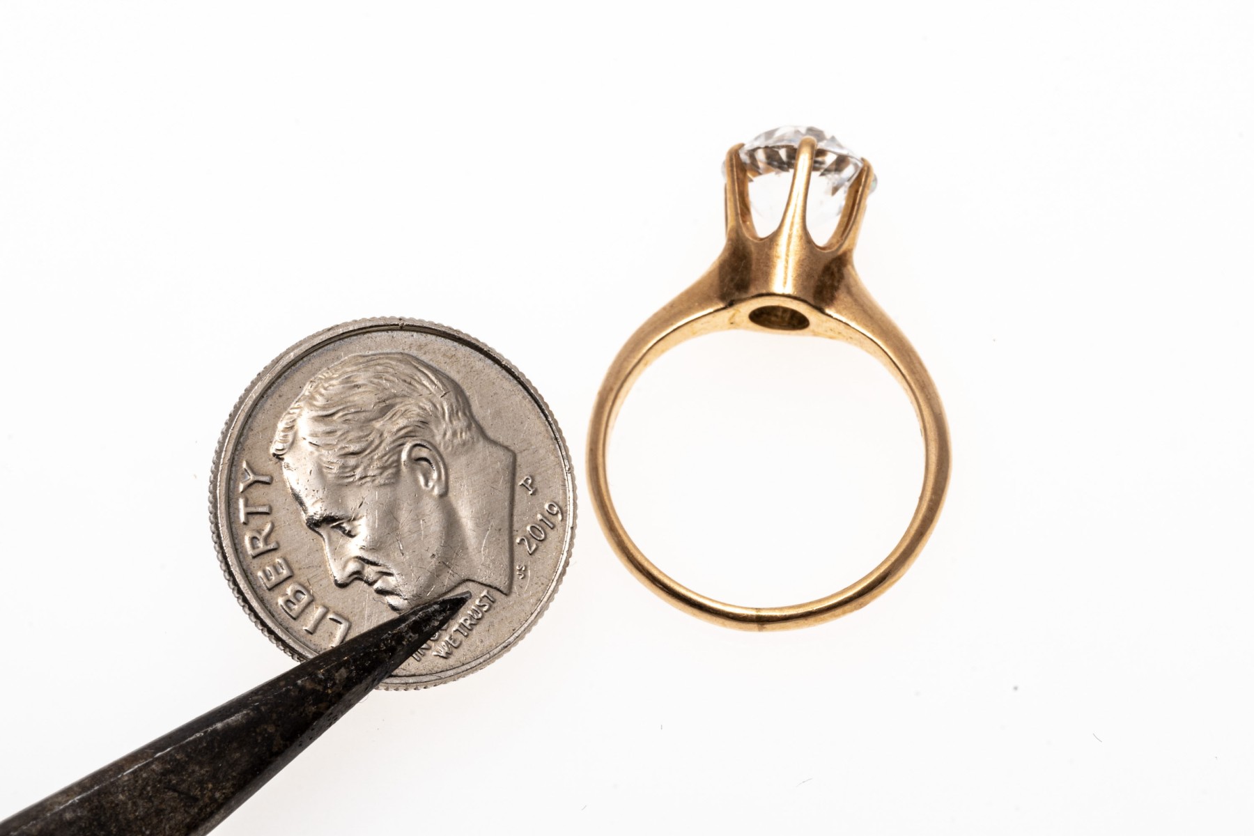 Fantastic 14K yellow gold ring. Prong set into the ring is a single round cut white sapphire, approximately 2.52 cts. Ring size 5-.