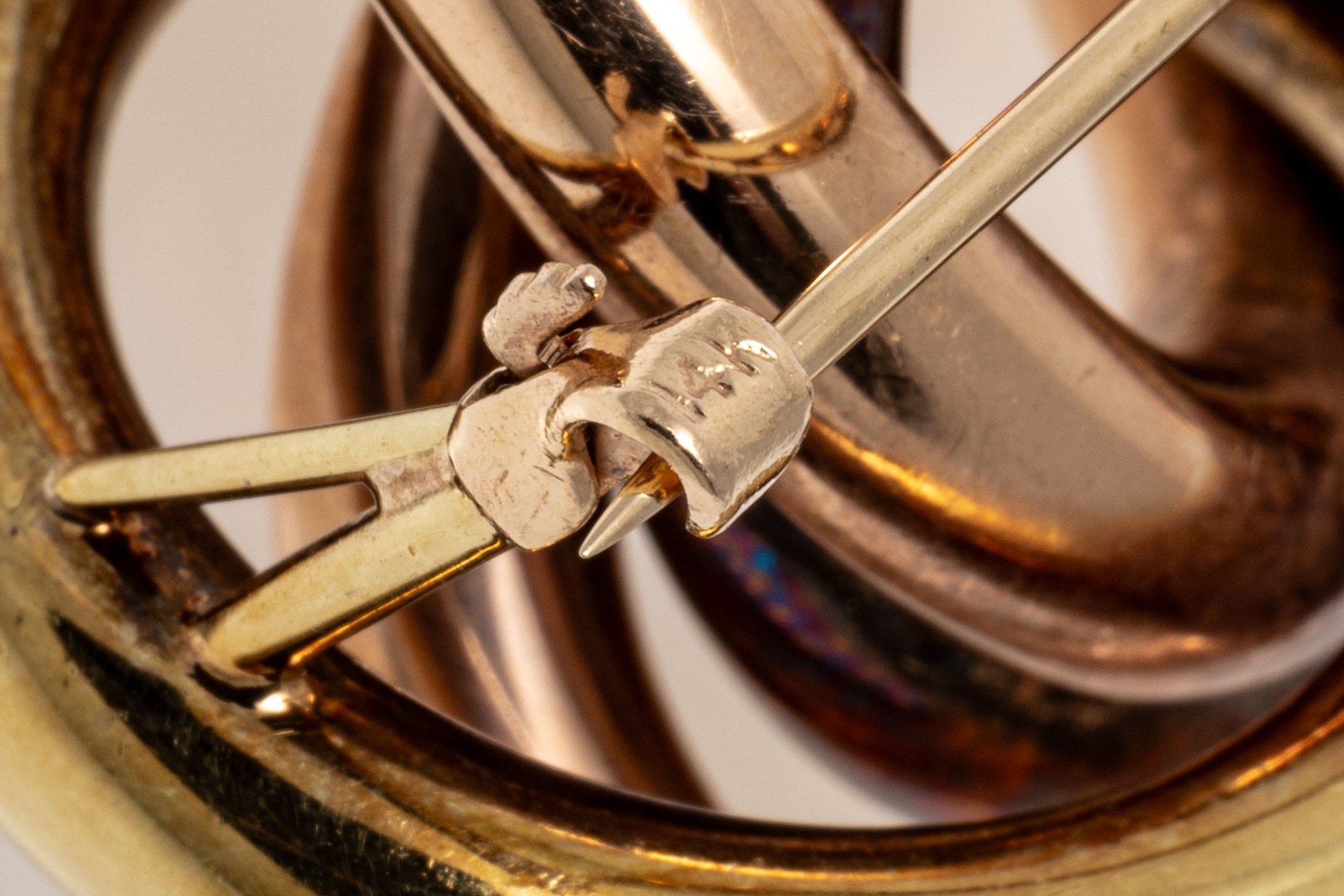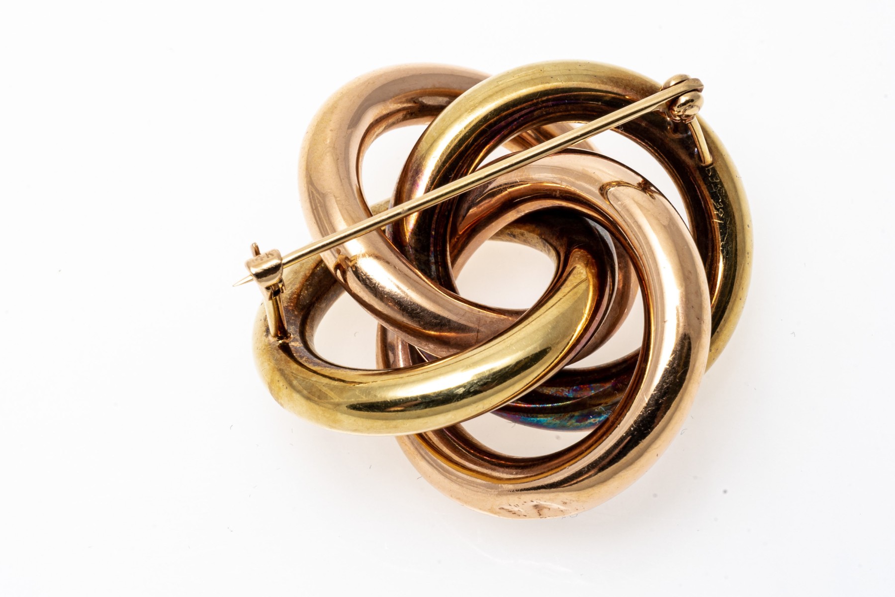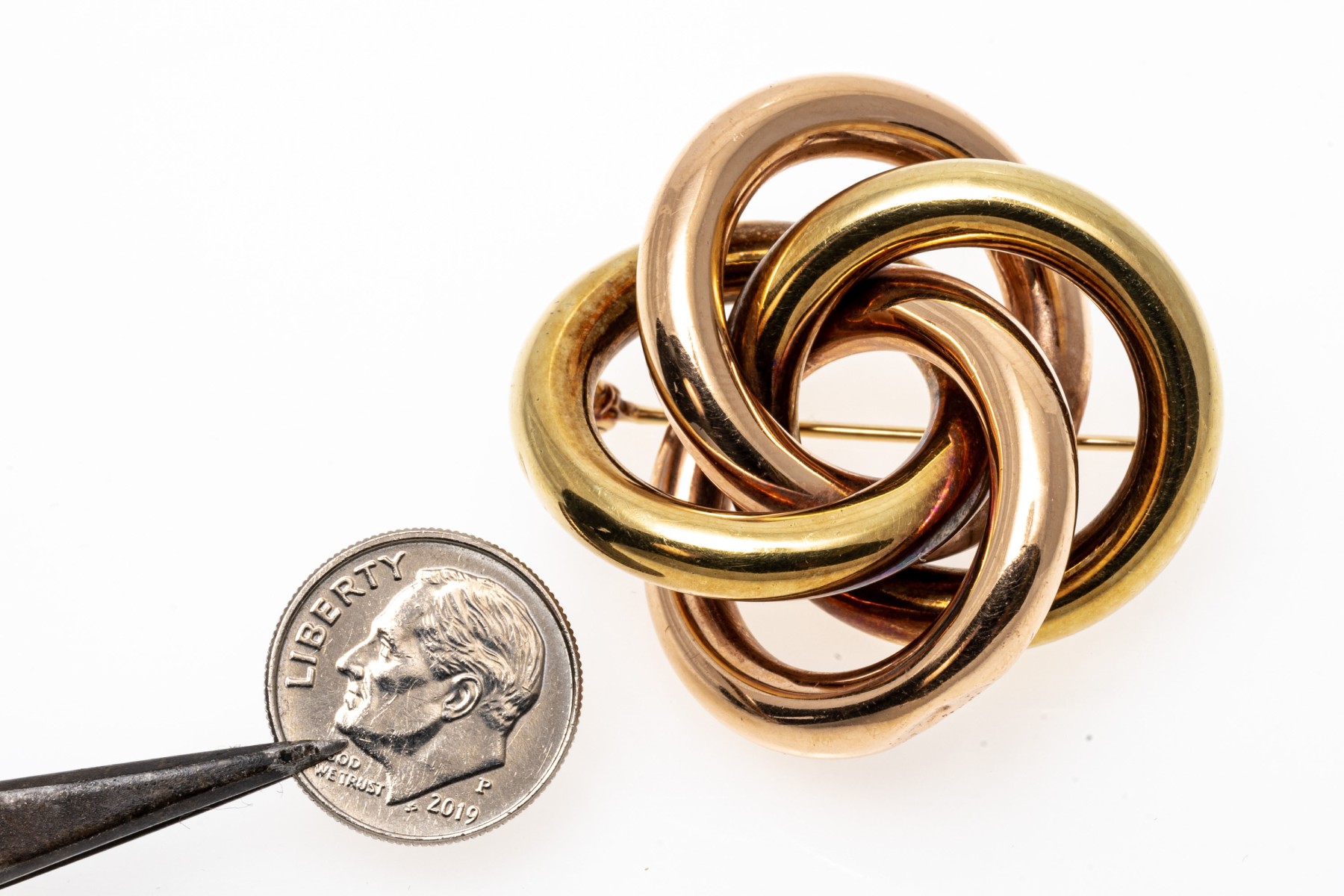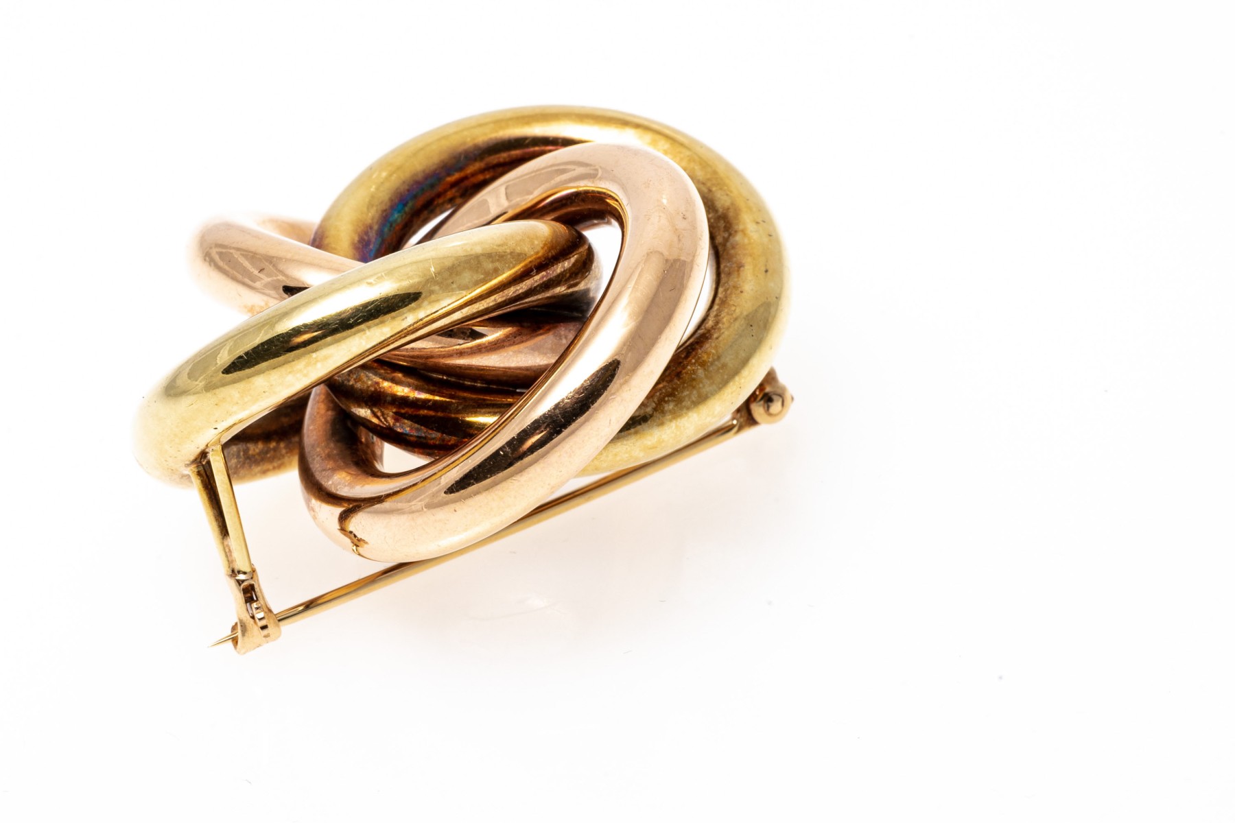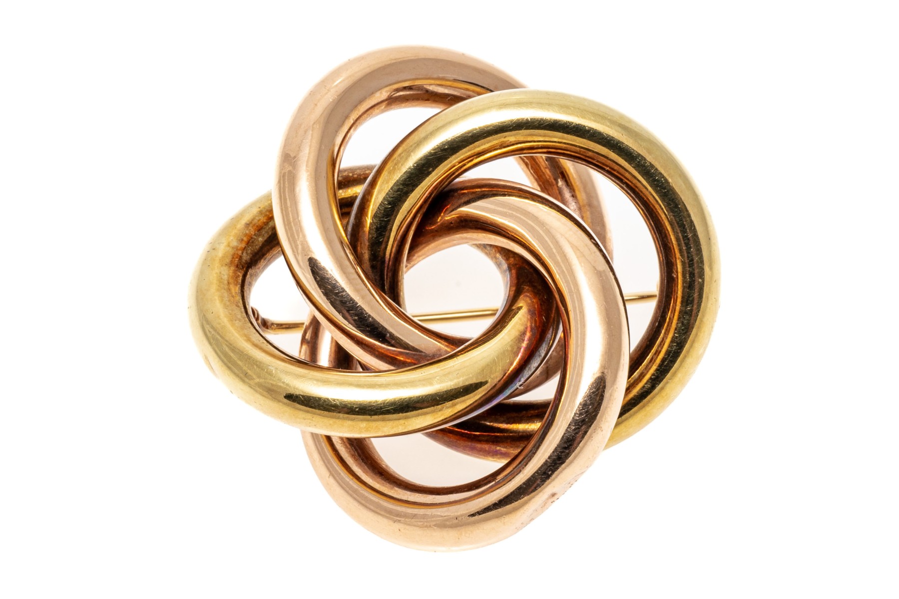Fantastic 14K gold knot style brooch. The concentric circles of the brooch are yellow and rose gold creating a subtle eye-catching contrast. Bright polished finish.