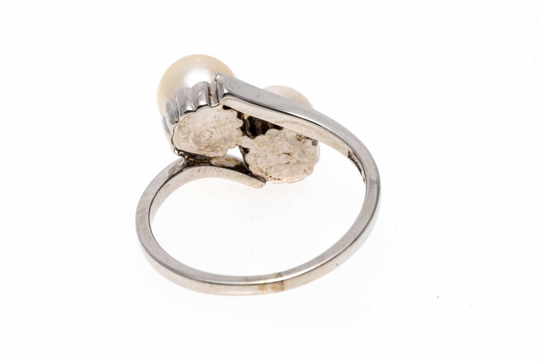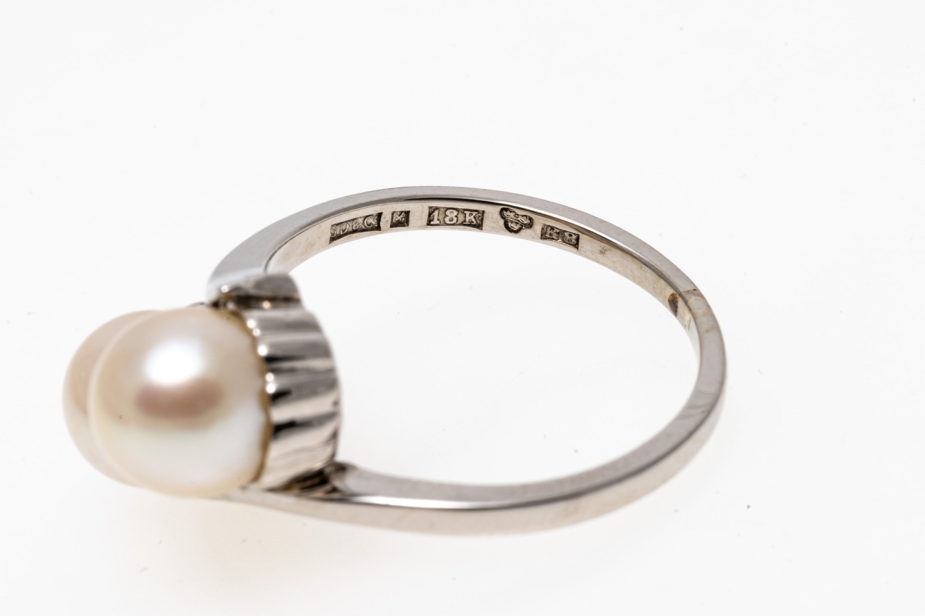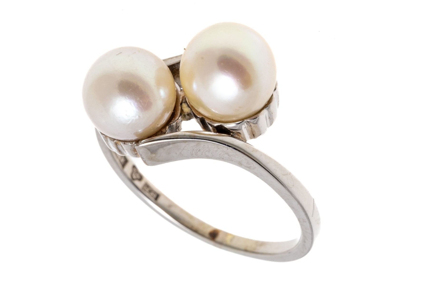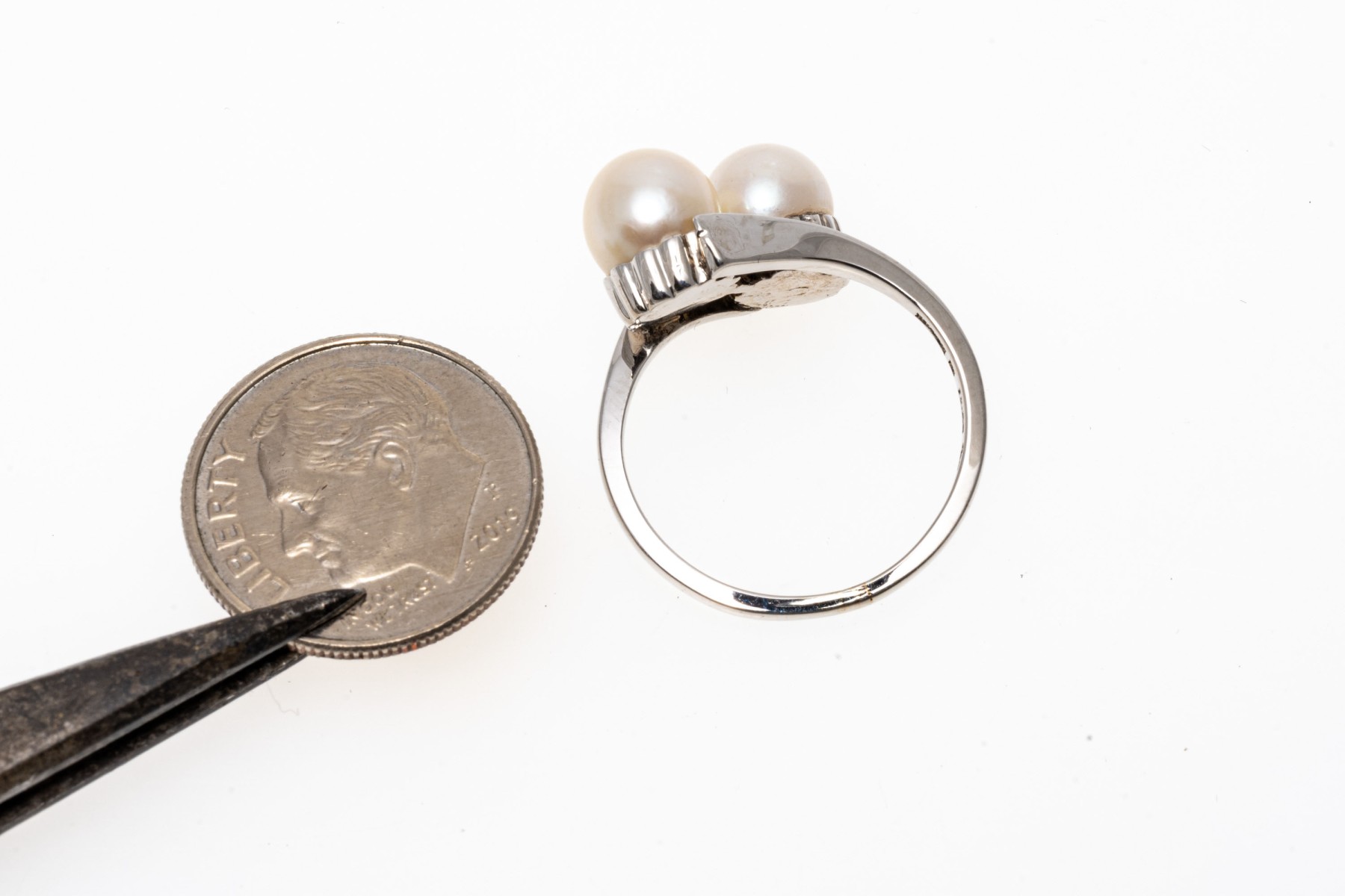 A stunning and simple 18K white gold twin pearl ring. These cultured pearls have a bright white color and very good luster., approximately 6.9mm. Ring size 6.25-.