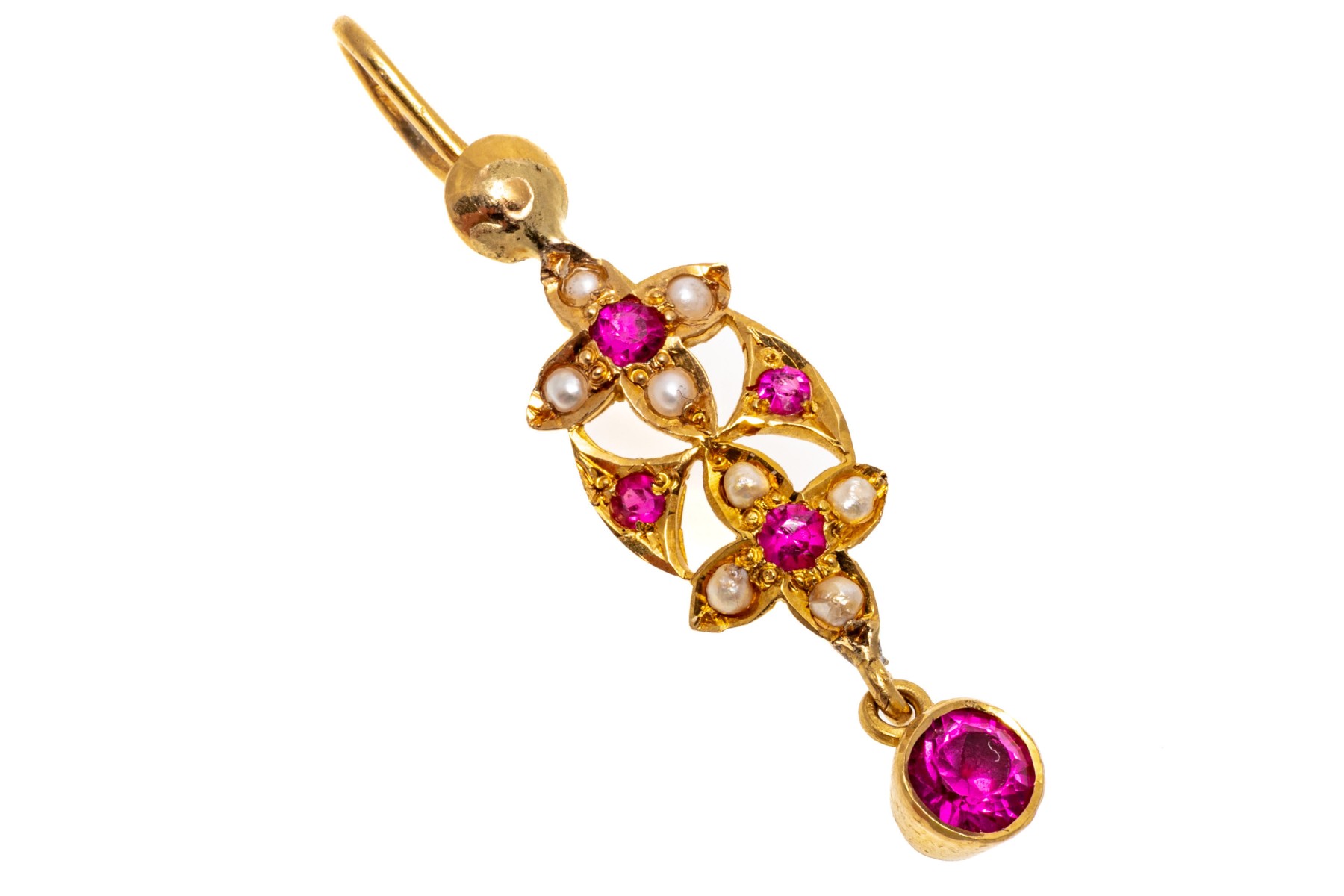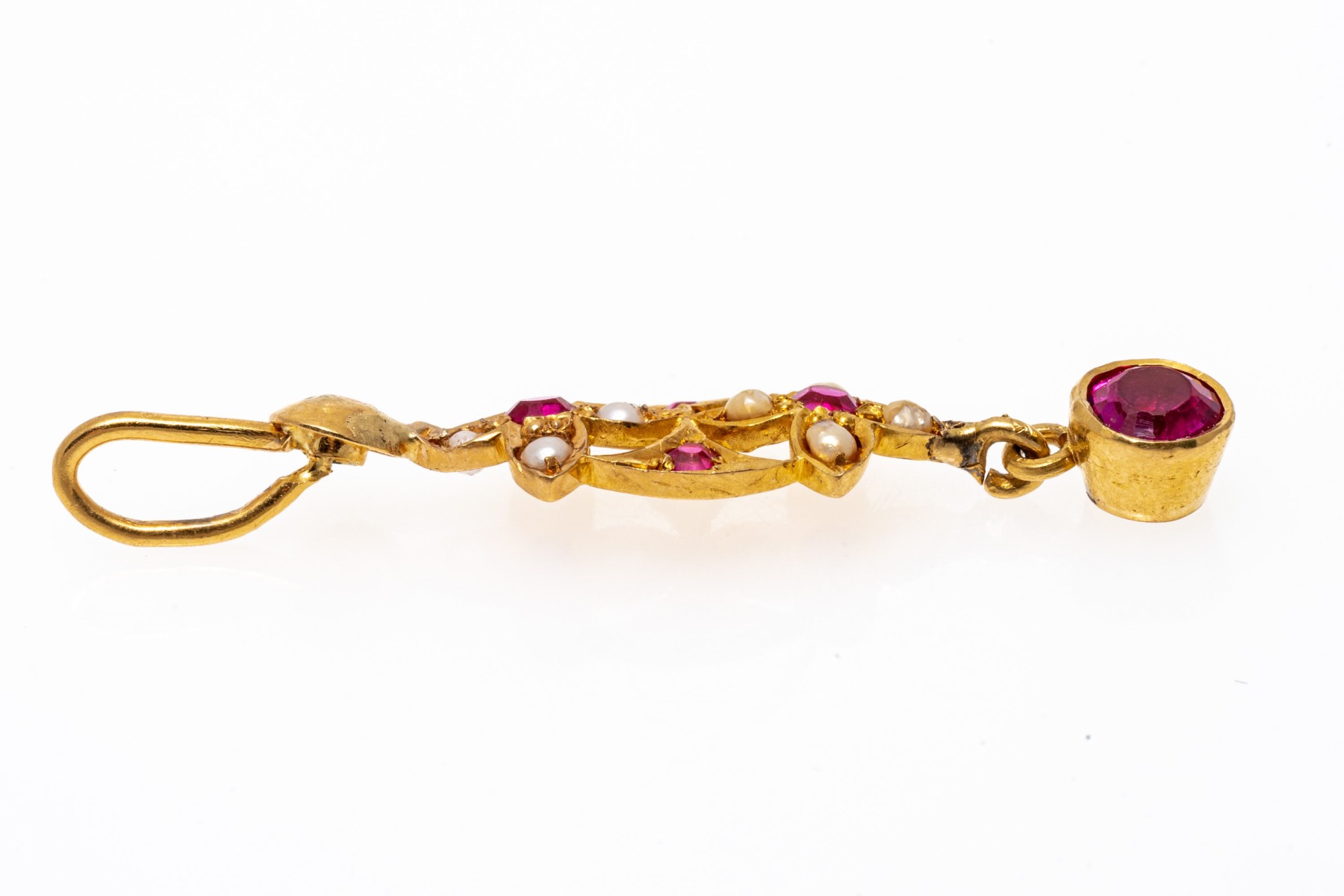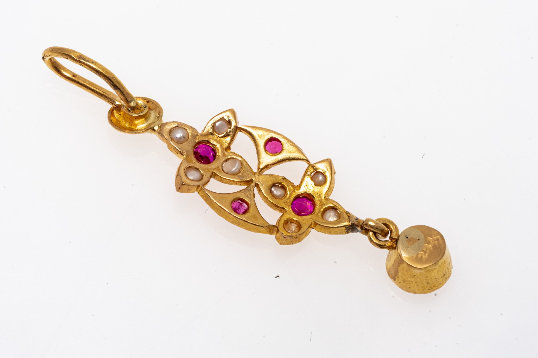 Fantastic 22K yellow gold drop style pendant. The pendant is set with dainty seed pearls and vibrant pink round cut synthetic sapphires.