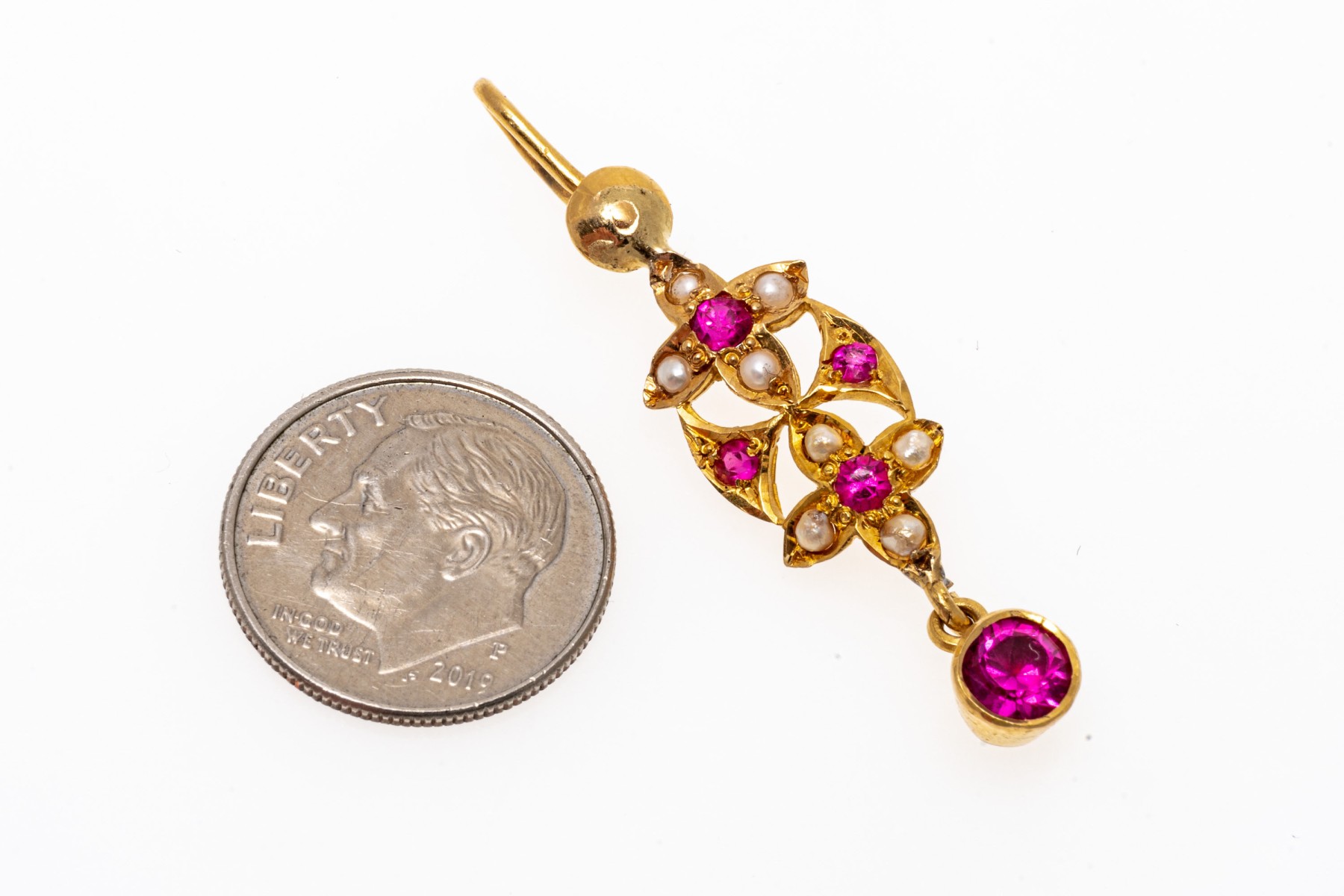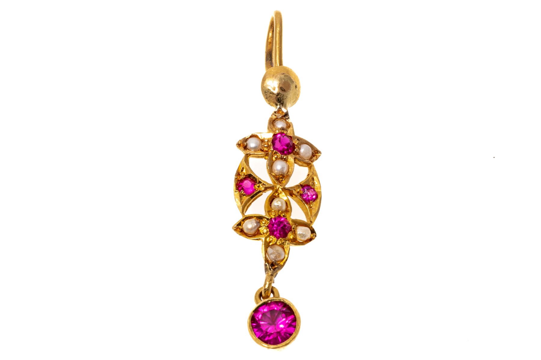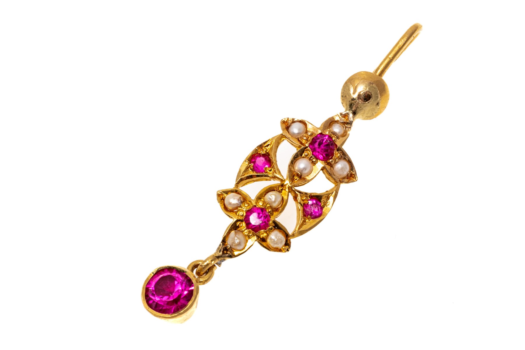 Fantastic 22K yellow gold drop style pendant. The pendant is set with dainty seed pearls and vibrant pink round cut synthetic sapphires.