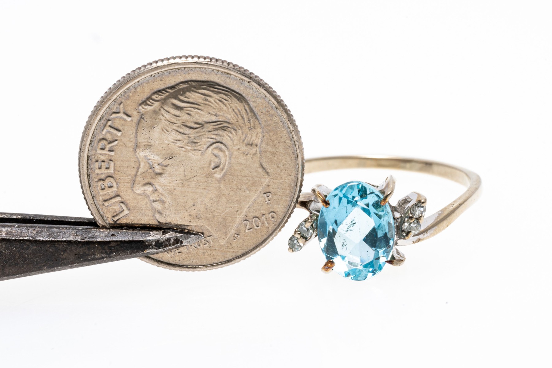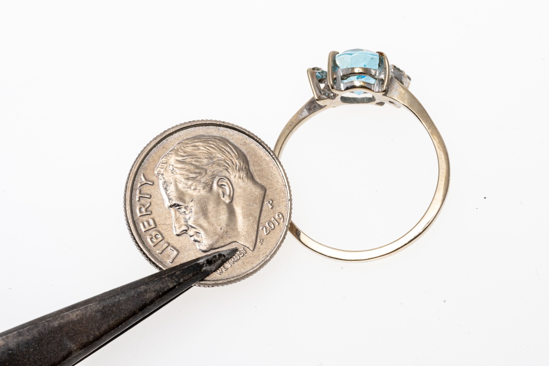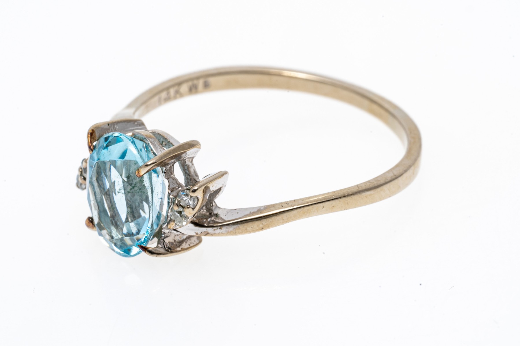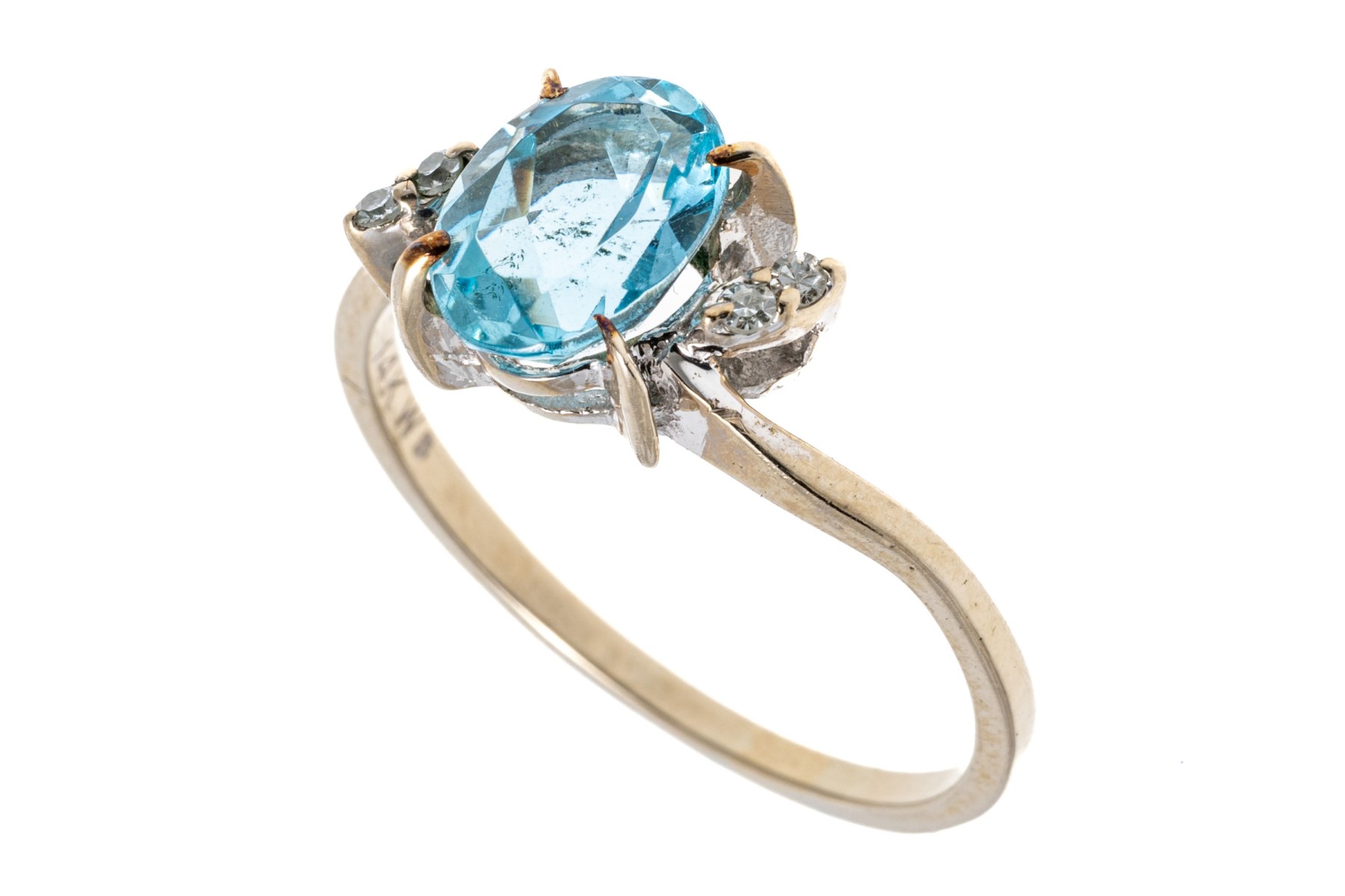Fantastic oval cut aquamarine stone, approximately 1.0 cts., set within a 14K gold ring. Flanking the aquamarine are pairs of round faceted diamonds, approximately 0.024 TCW. Ring size 7+.