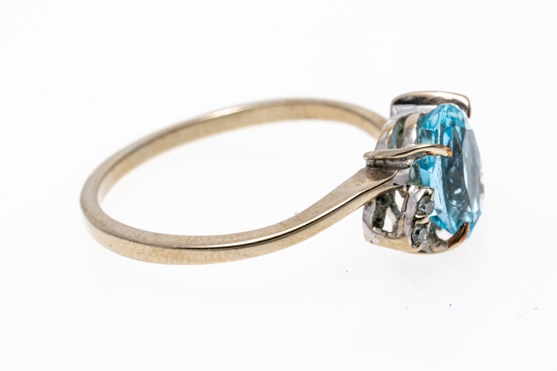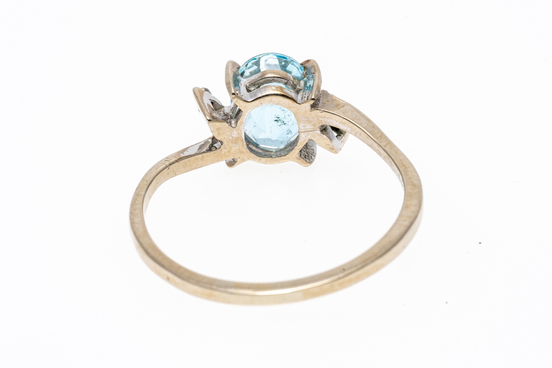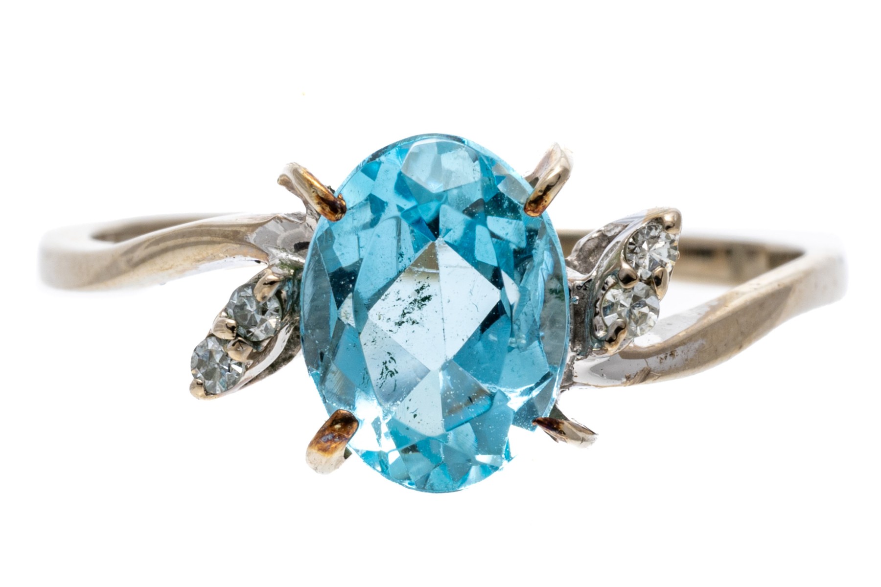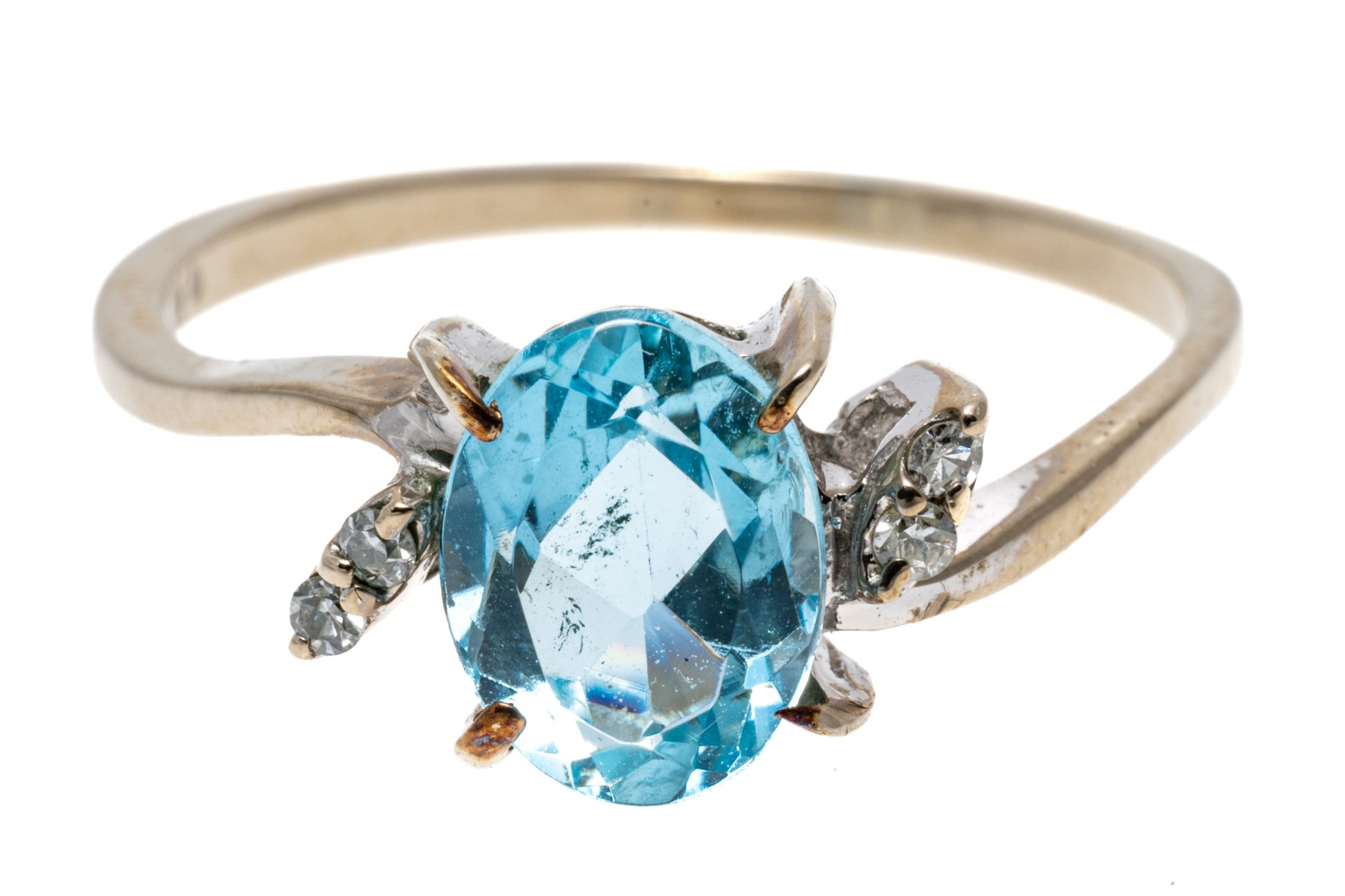 Fantastic oval cut aquamarine stone, approximately 1.0 cts., set within a 14K gold ring. Flanking the aquamarine are pairs of round faceted diamonds, approximately 0.024 TCW. Ring size 7+.