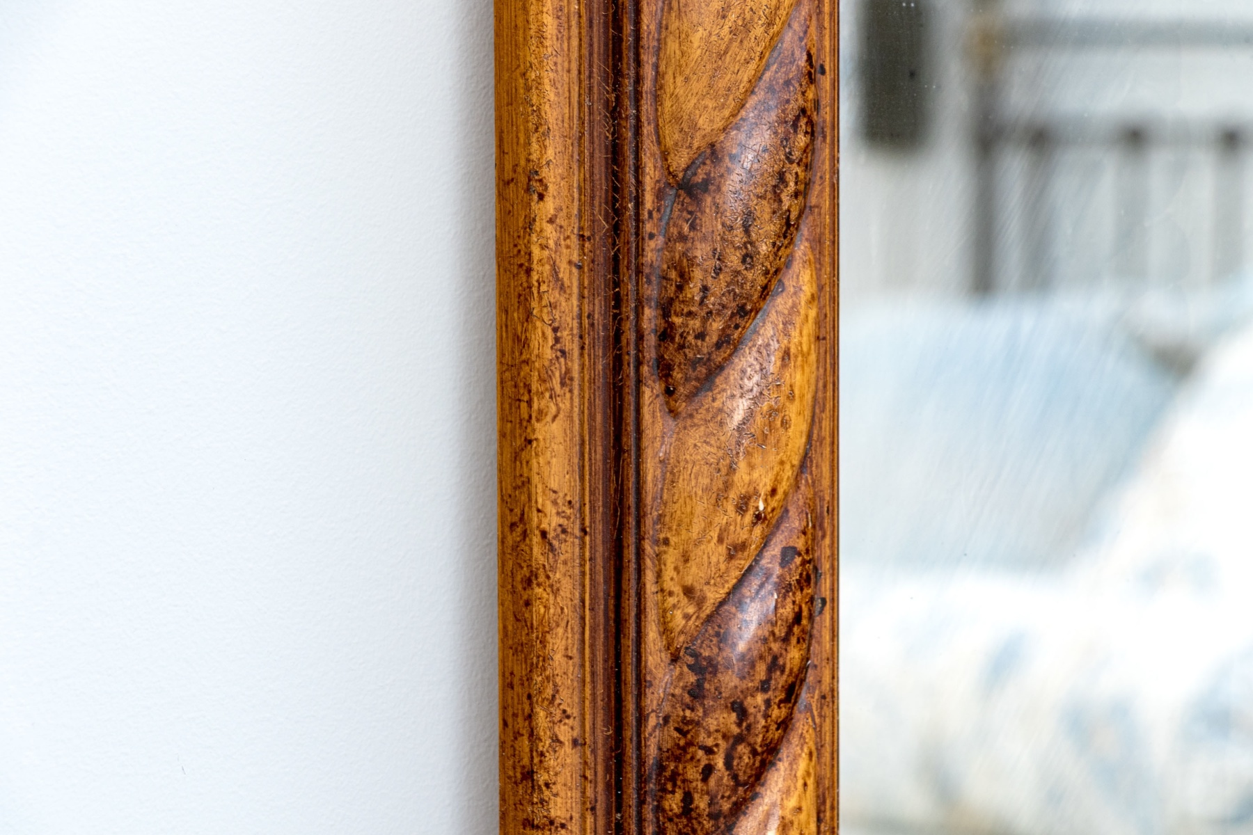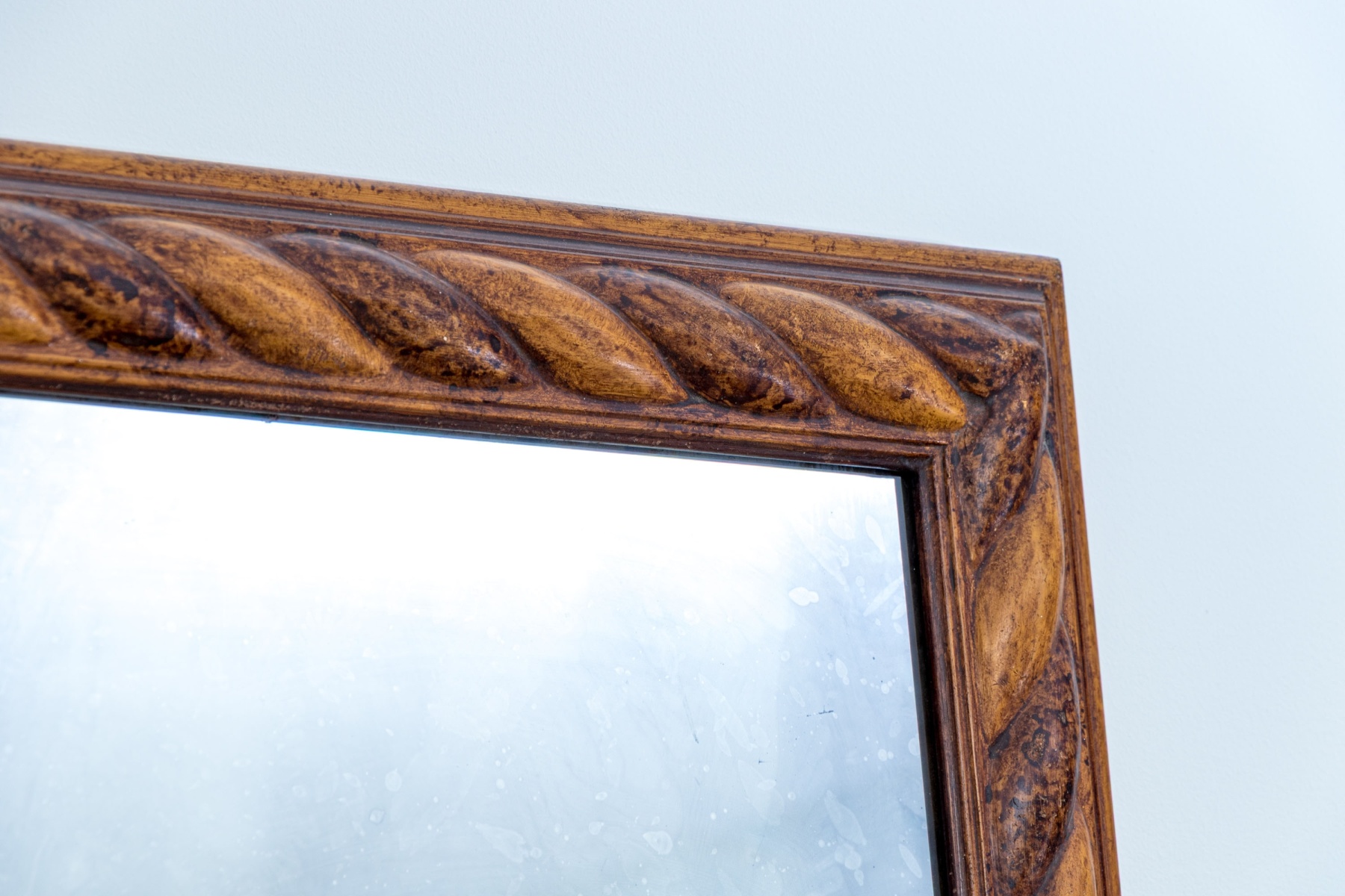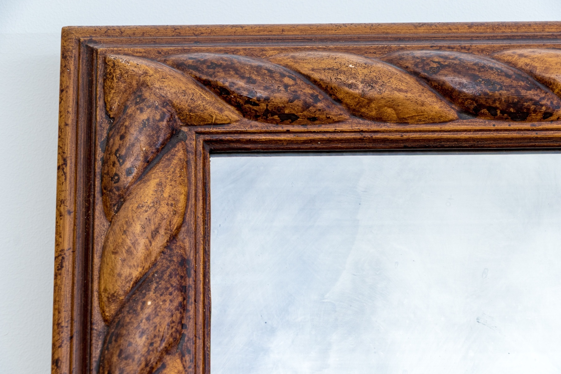 A wonderful rectangular mirror in a two-tone wood frame beautifully carved rope twist motif making for a handsome display fit for an array of aesthetics.