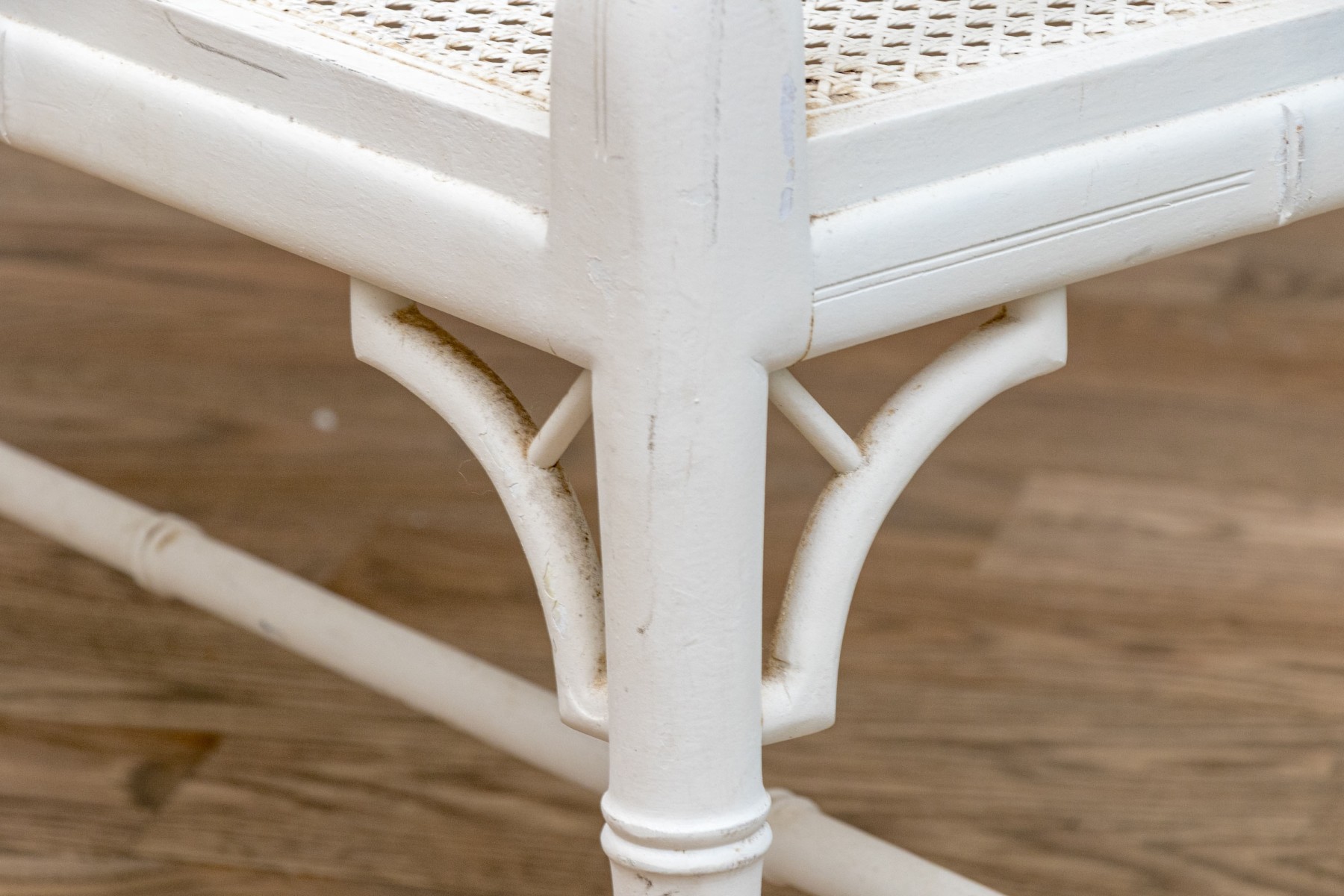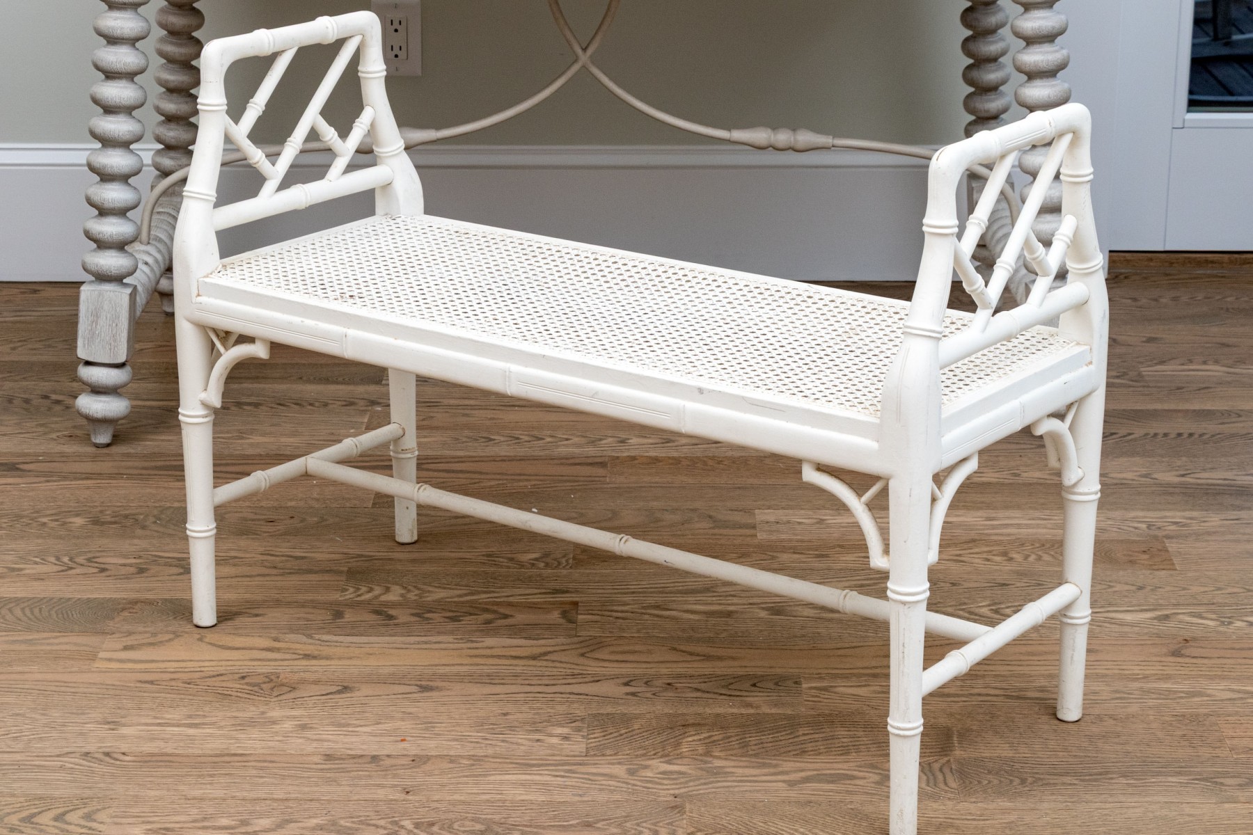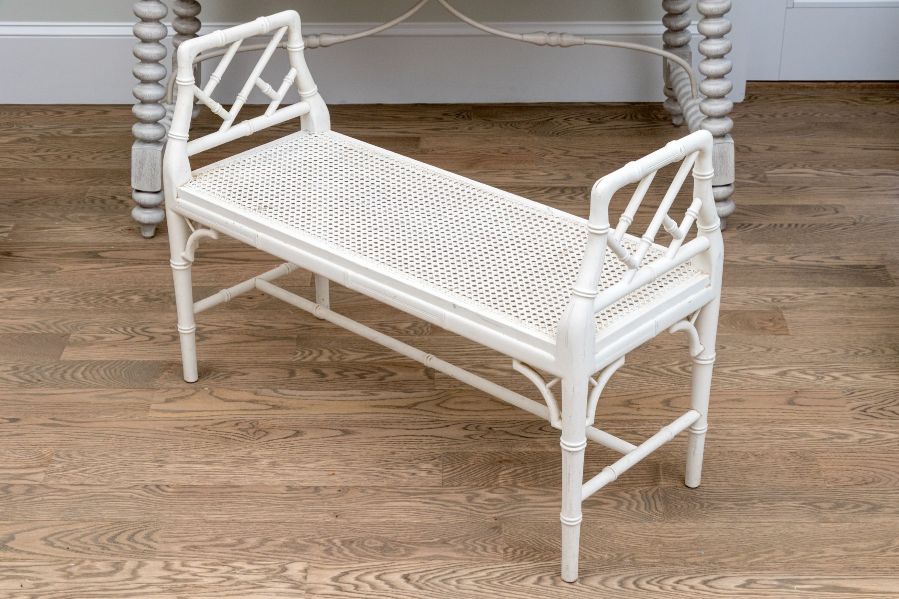 A fantastic chinoiserie bench with a carved faux bamboo frame raised on four straight legs with stretcher supports. Two carved and painted faux bamboo arms raise up to the sides, flanking a caned seat. All painted in a white finish.