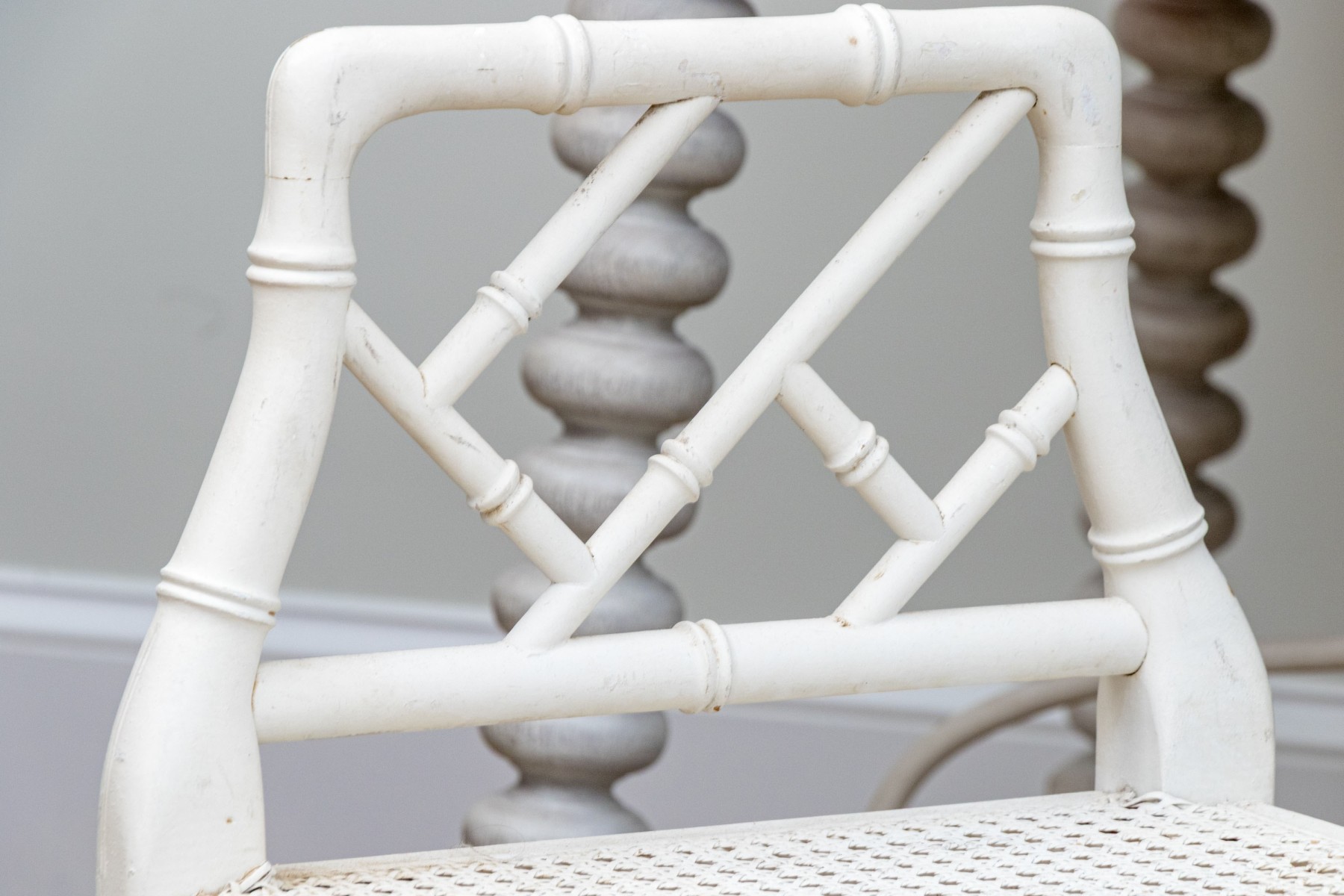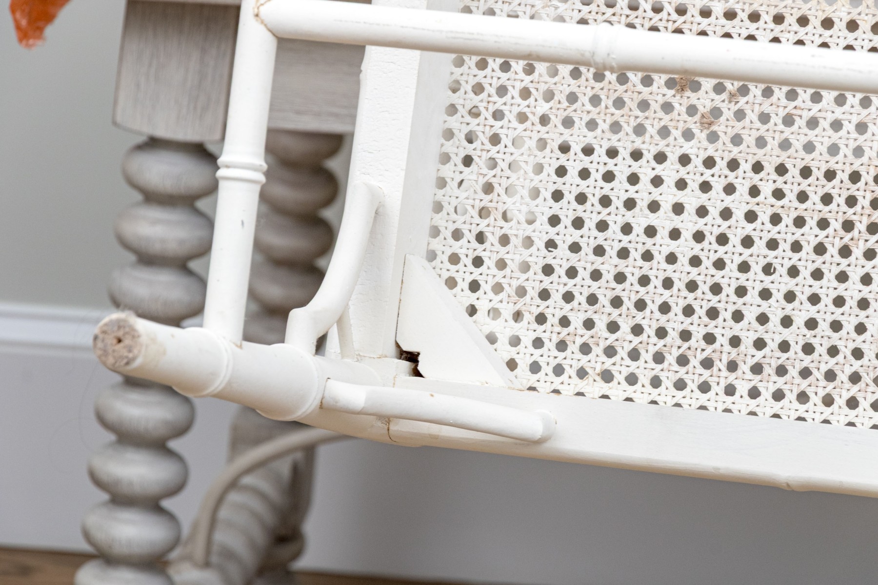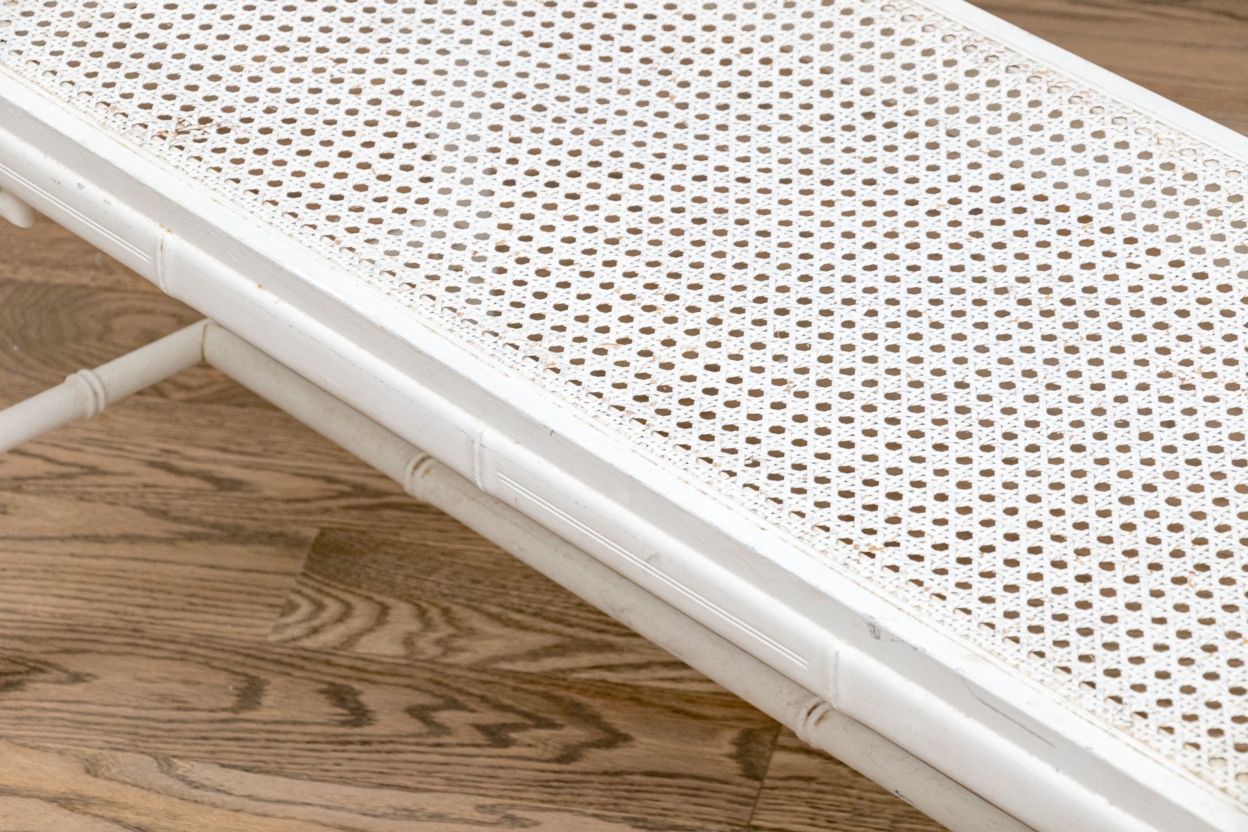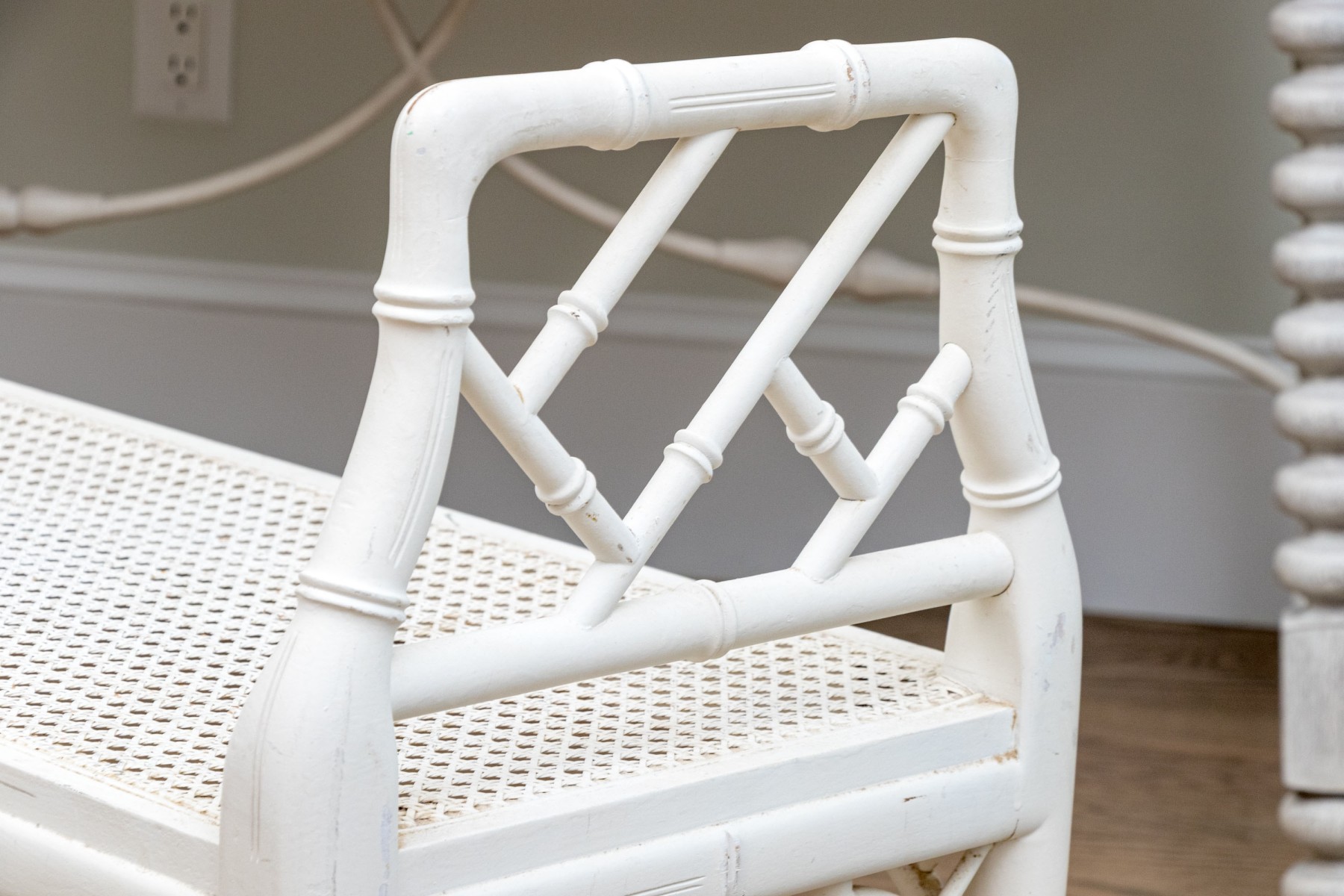 A fantastic chinoiserie bench with a carved faux bamboo frame raised on four straight legs with stretcher supports. Two carved and painted faux bamboo arms raise up to the sides, flanking a caned seat. All painted in a white finish.