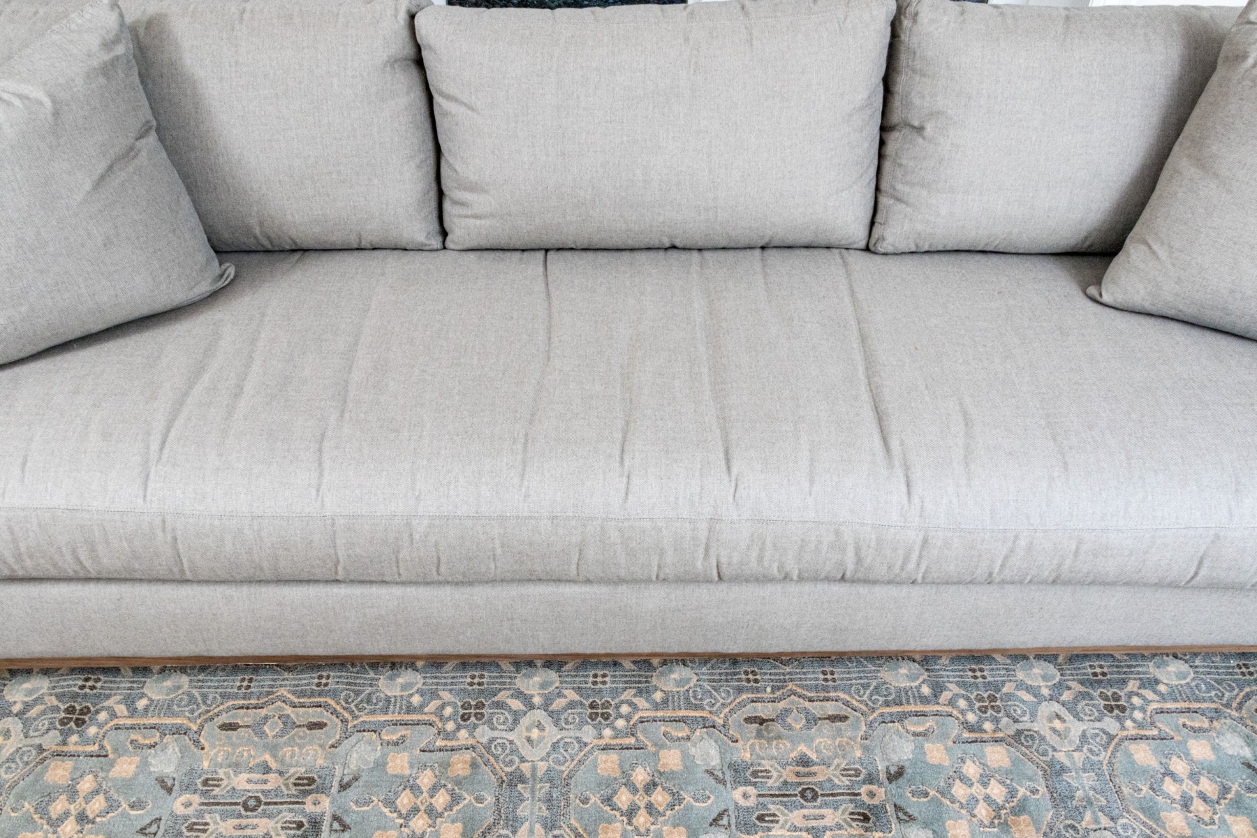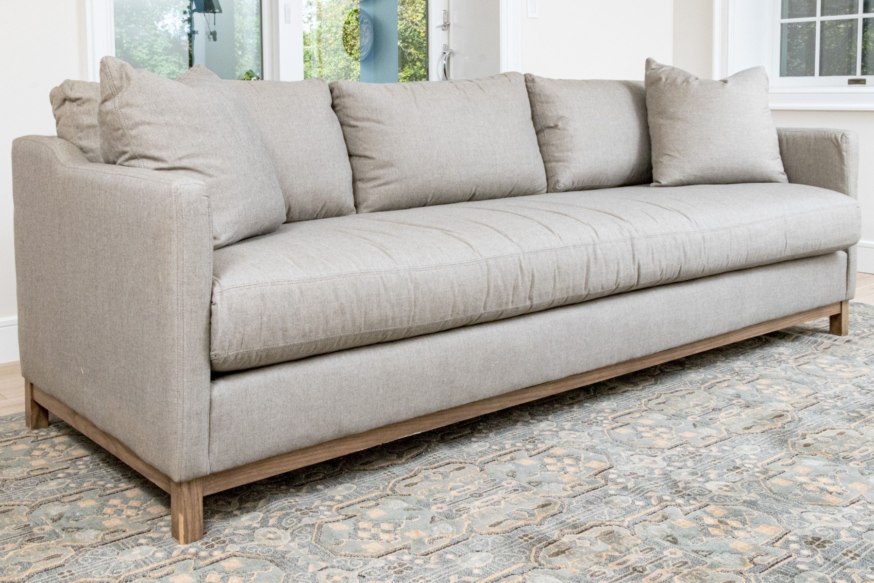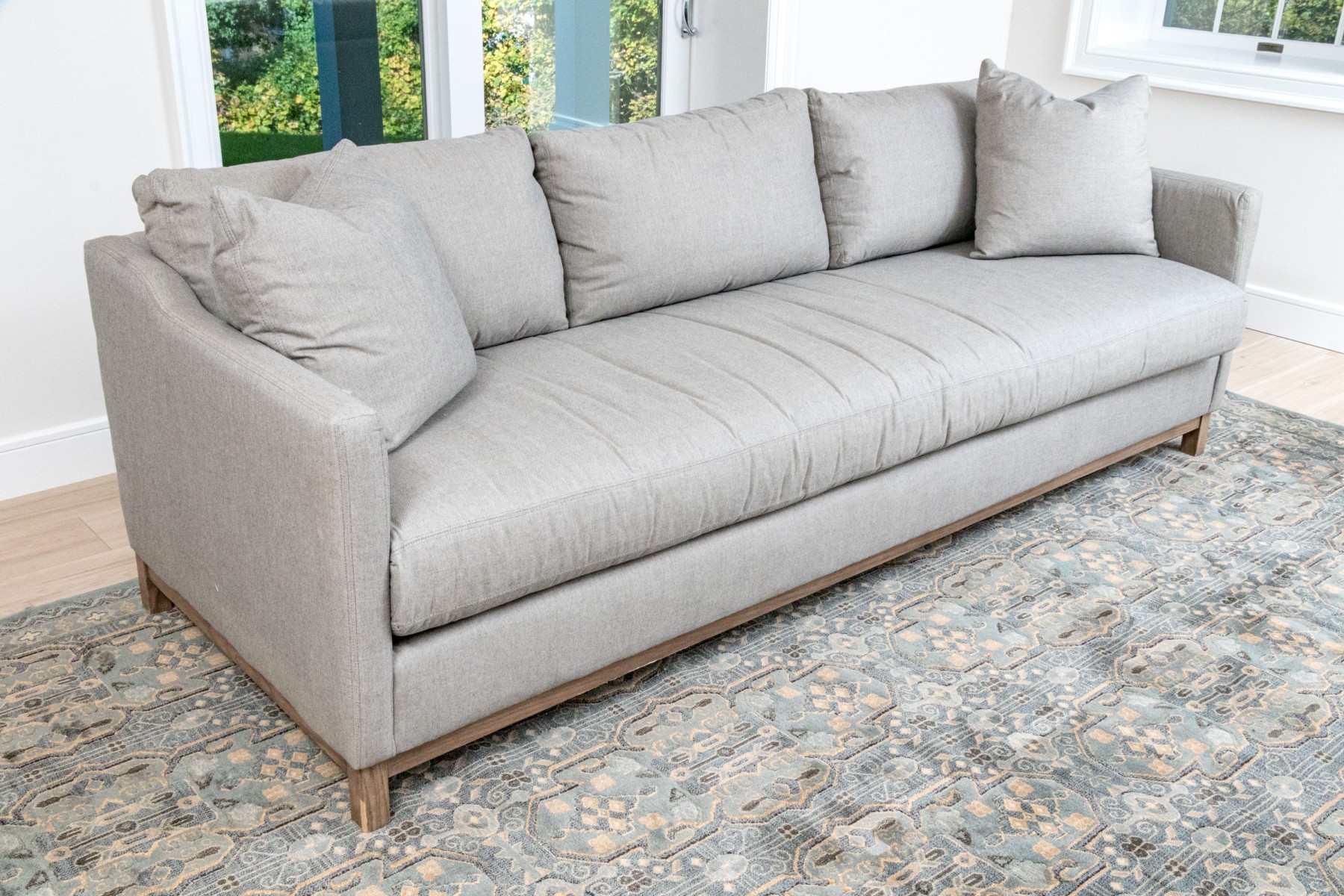 A fantastic CR Laine long sofa with contemporary, understated elegance. Upholstered in versatile gray Sunbrella fabric, suitable for both indoor and outdoor use. Features three loose back cushions and one long seat cushion, accompanied by matching accent pillows. Raised on a beautiful ashen brown wood base with stout rounded legs.