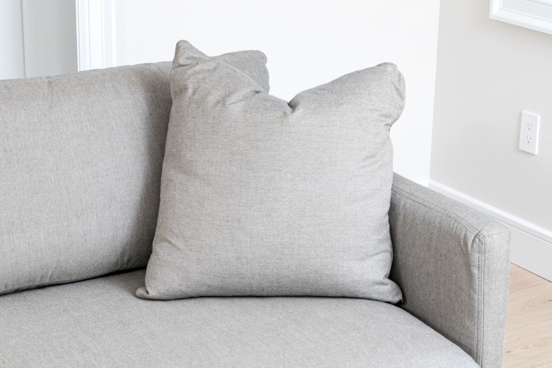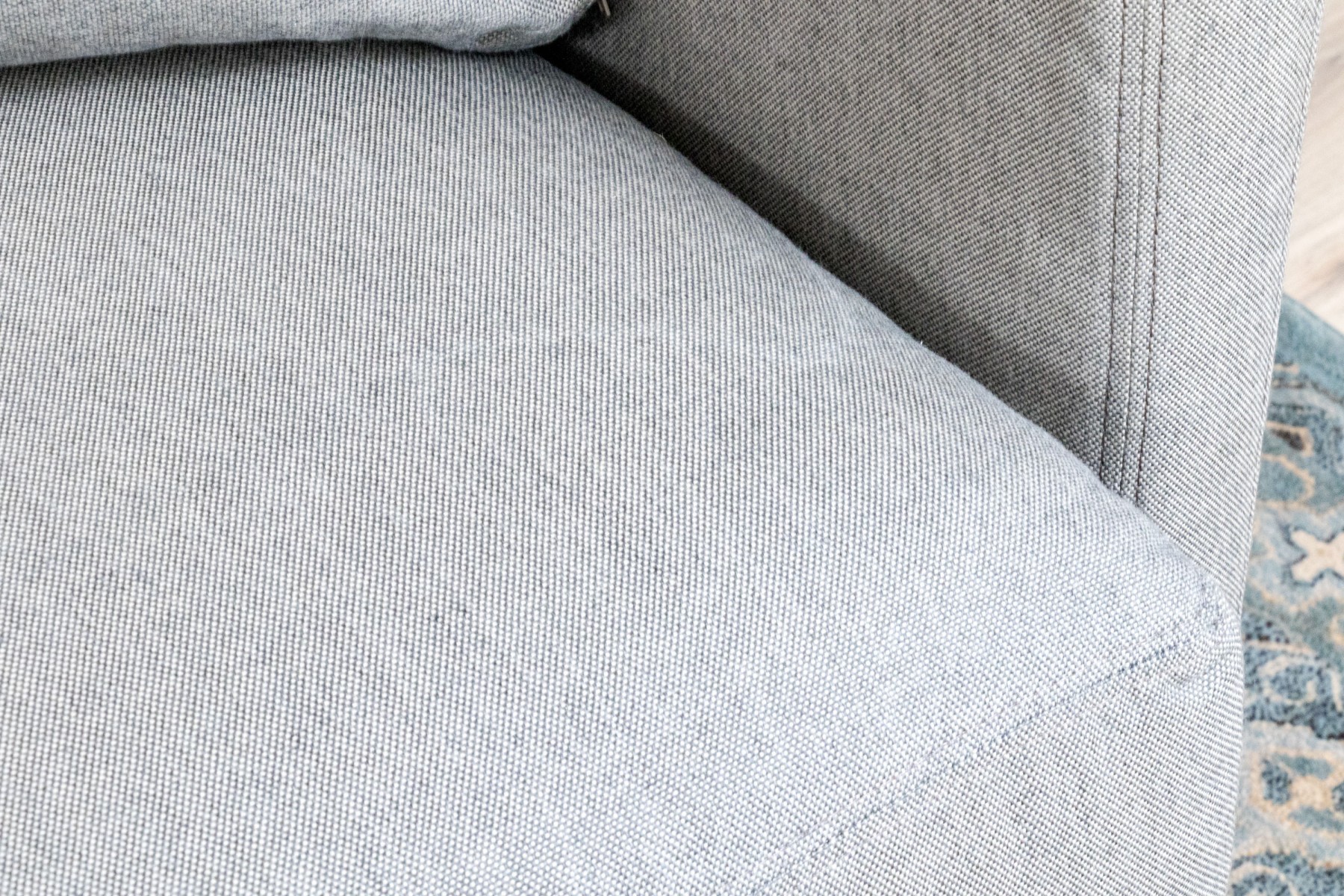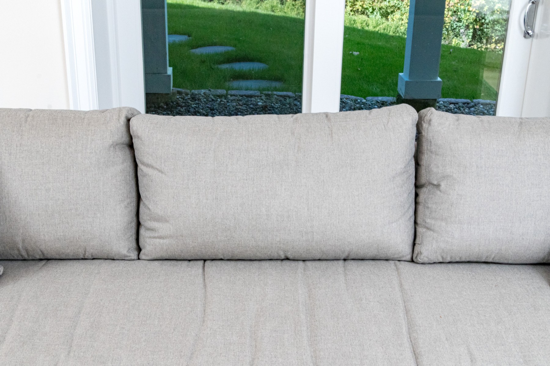 A fantastic CR Laine long sofa with contemporary, understated elegance. Upholstered in versatile gray Sunbrella fabric, suitable for both indoor and outdoor use. Features three loose back cushions and one long seat cushion, accompanied by matching accent pillows. Raised on a beautiful ashen brown wood base with stout rounded legs.