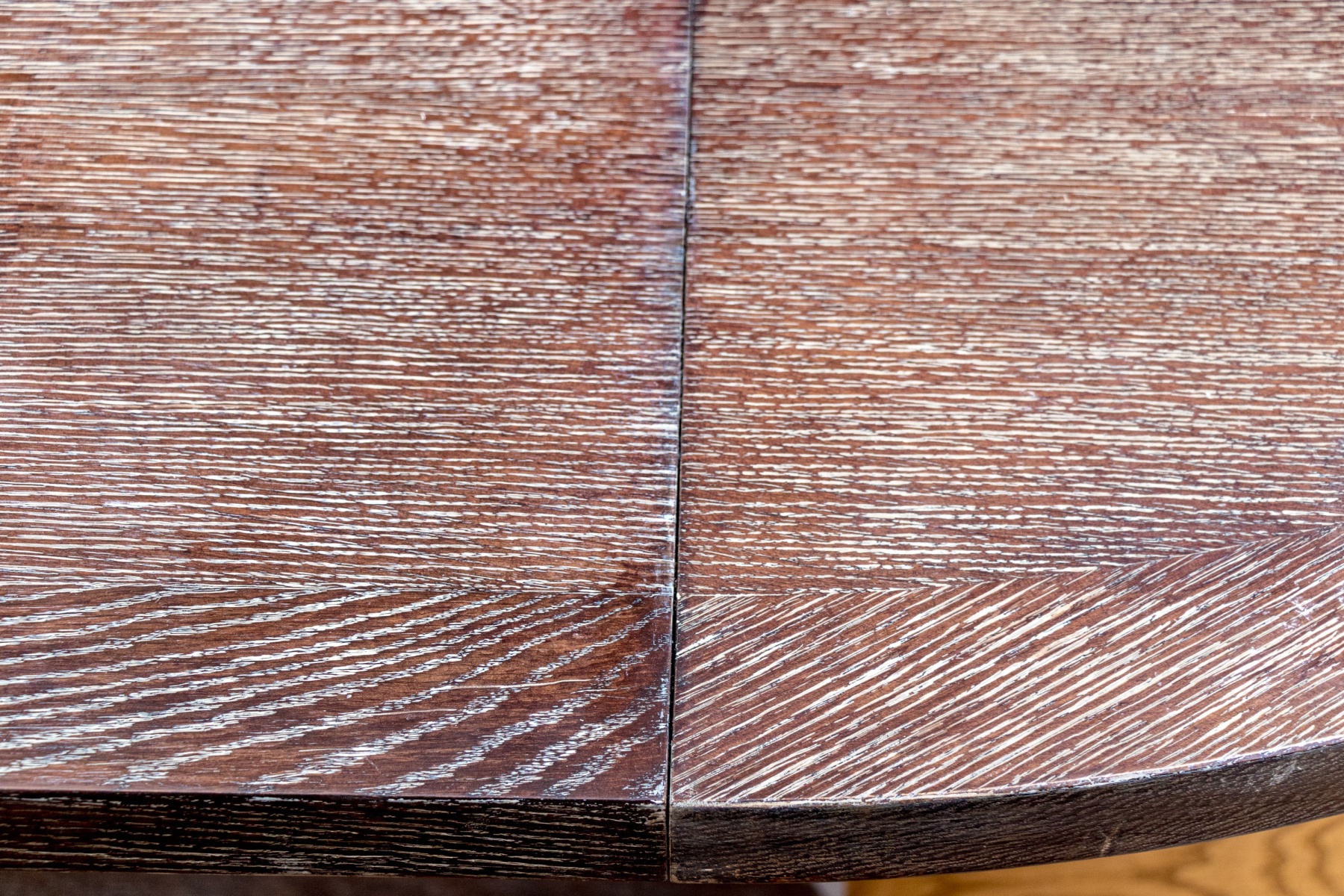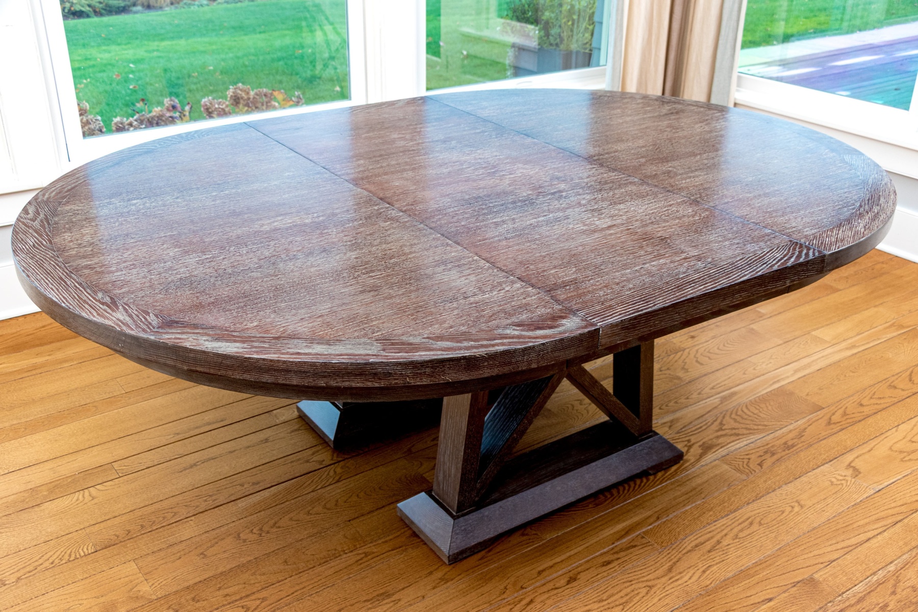 A fantastic extension table standing on two supports with four legs and X form stretchers on either end. The table top is 2” thick and can either be in circular form for use as a breakfast table, or an atrium table. Alternatively the 24” leaf can be inserted and used as a dining table.
