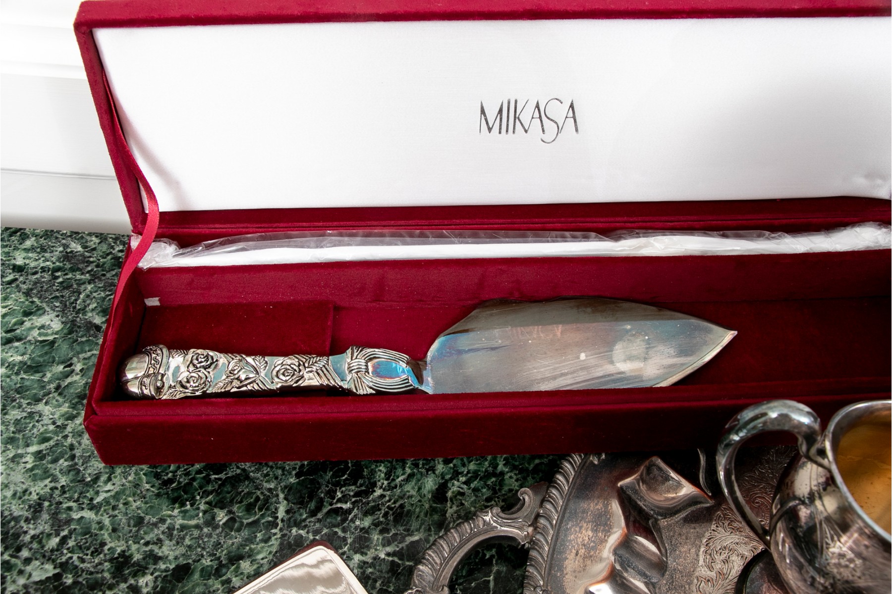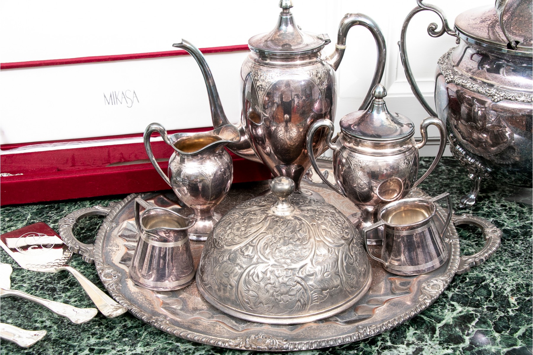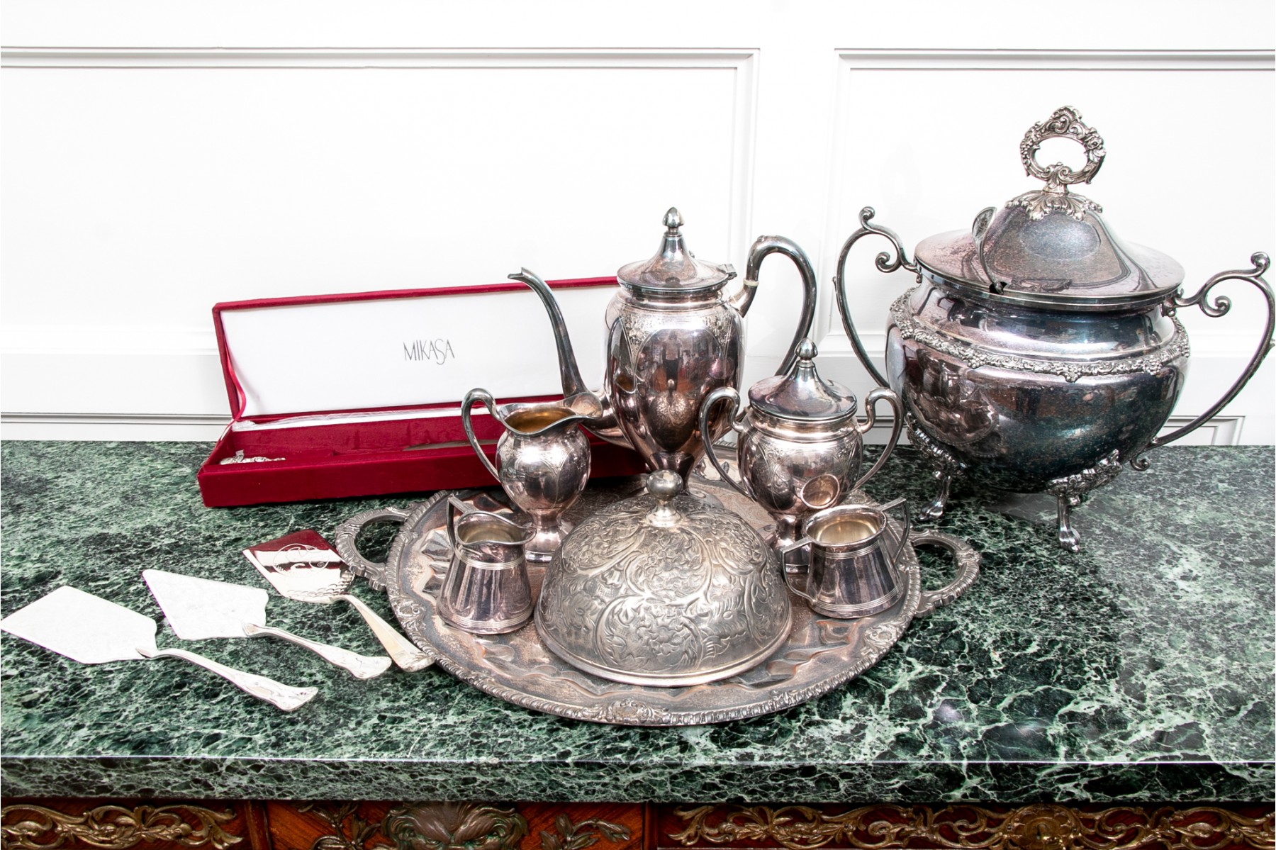 Fourteen-piece silverplate collection including tray, teapot, sugar and covered creamer by Wilcox and a smaller uncovered sugar and creamer, cheese dome, soup tureen with ladle, Mikasa cake server and knife in box and three flat servers.