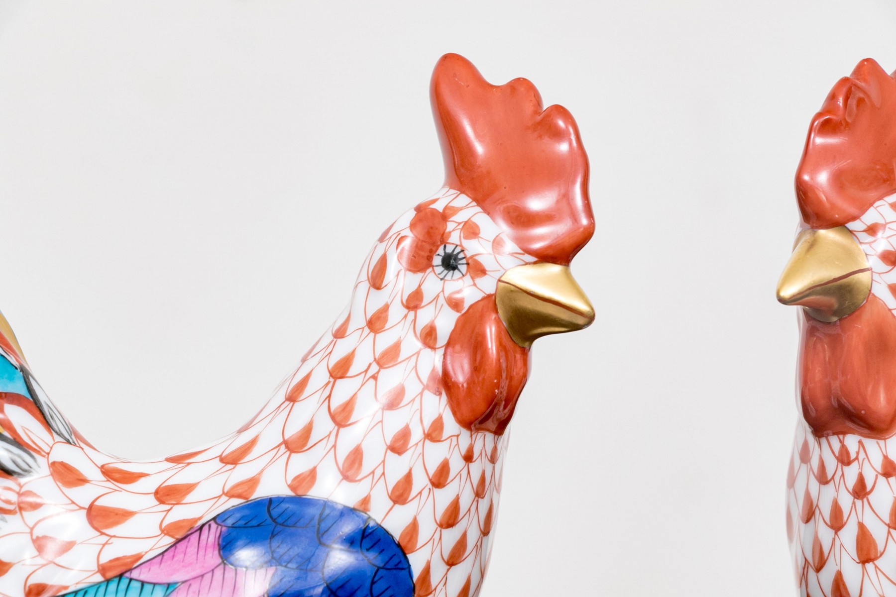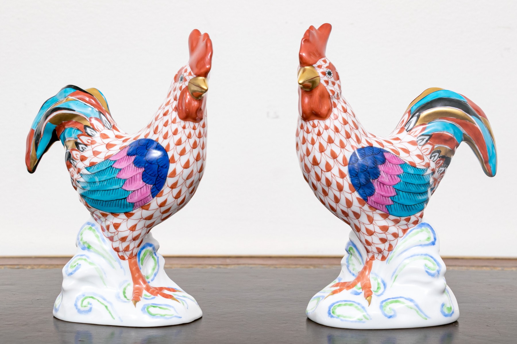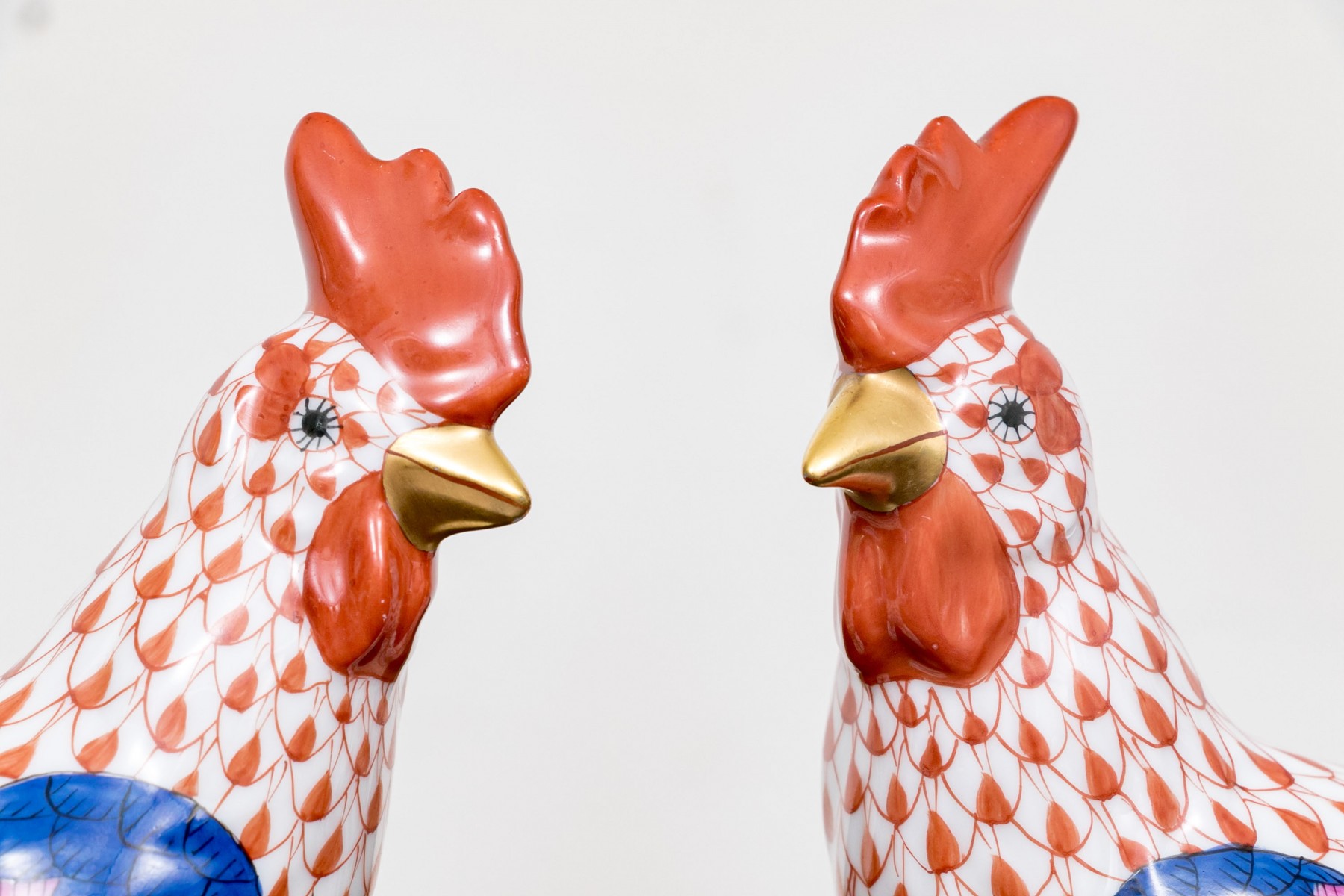 Fantastic pair of Herend, Hungarian hand painted porcelain roosters. Presented with classic fishnet decorative motif to the birds bodies with delightfully polychrome painted tail feathers, wings and majestic gilt beaks.