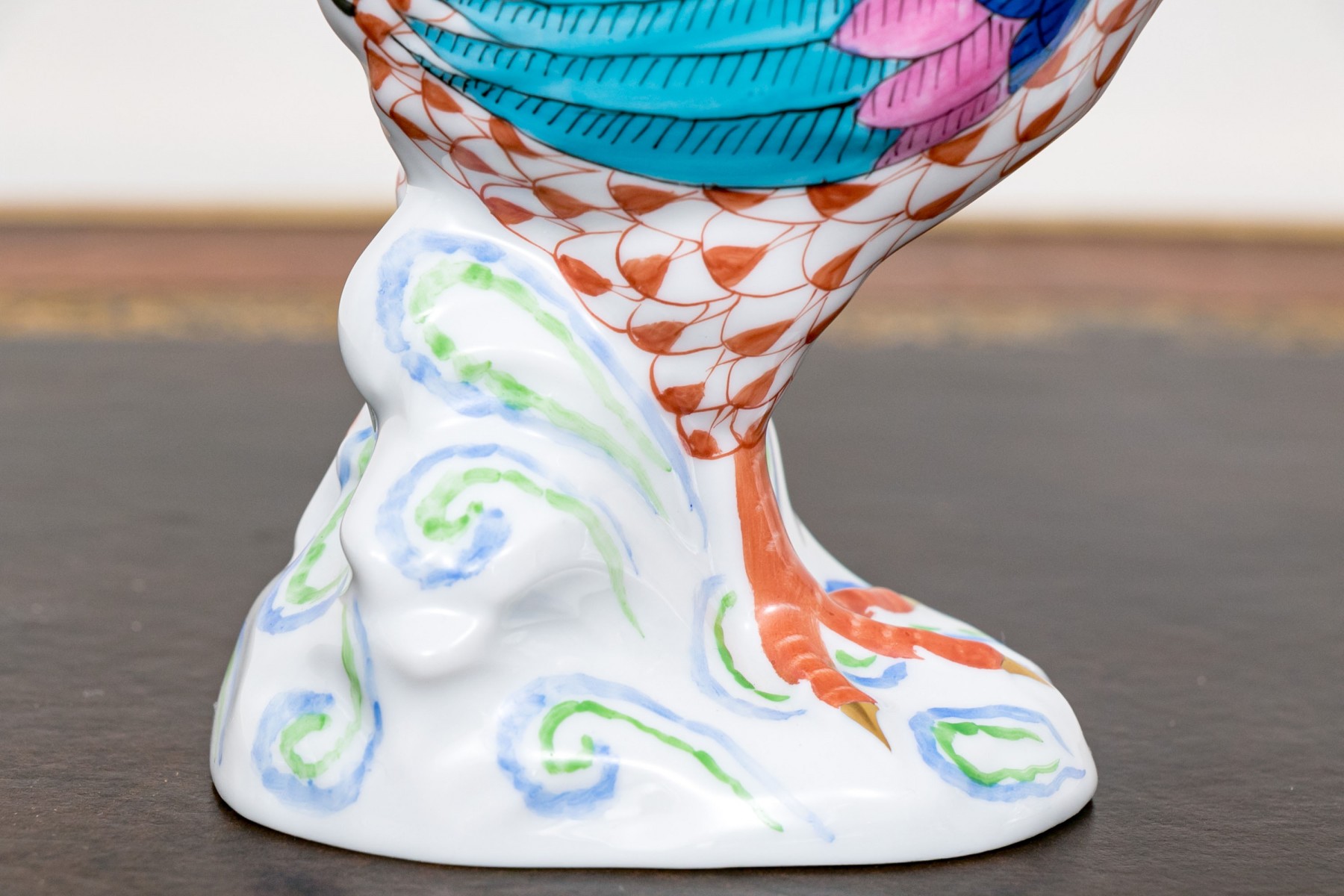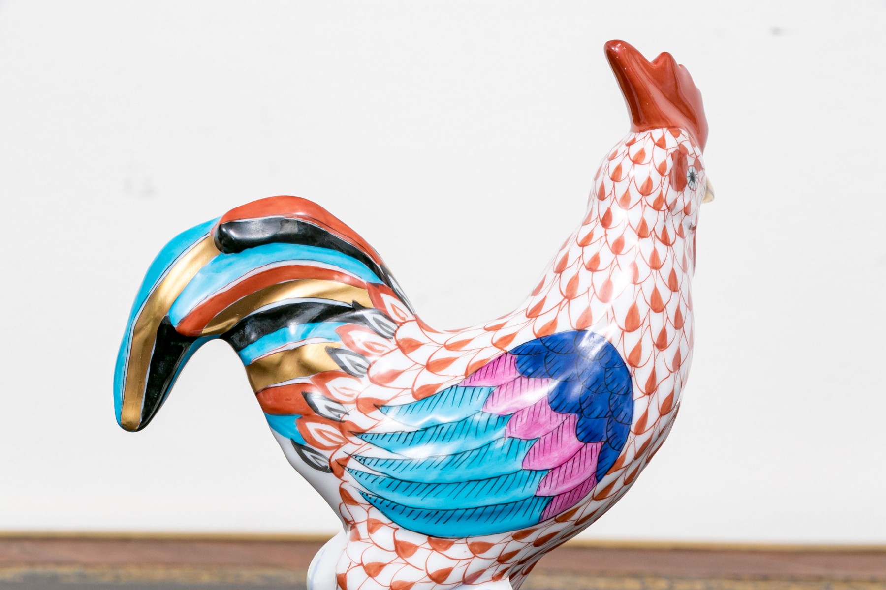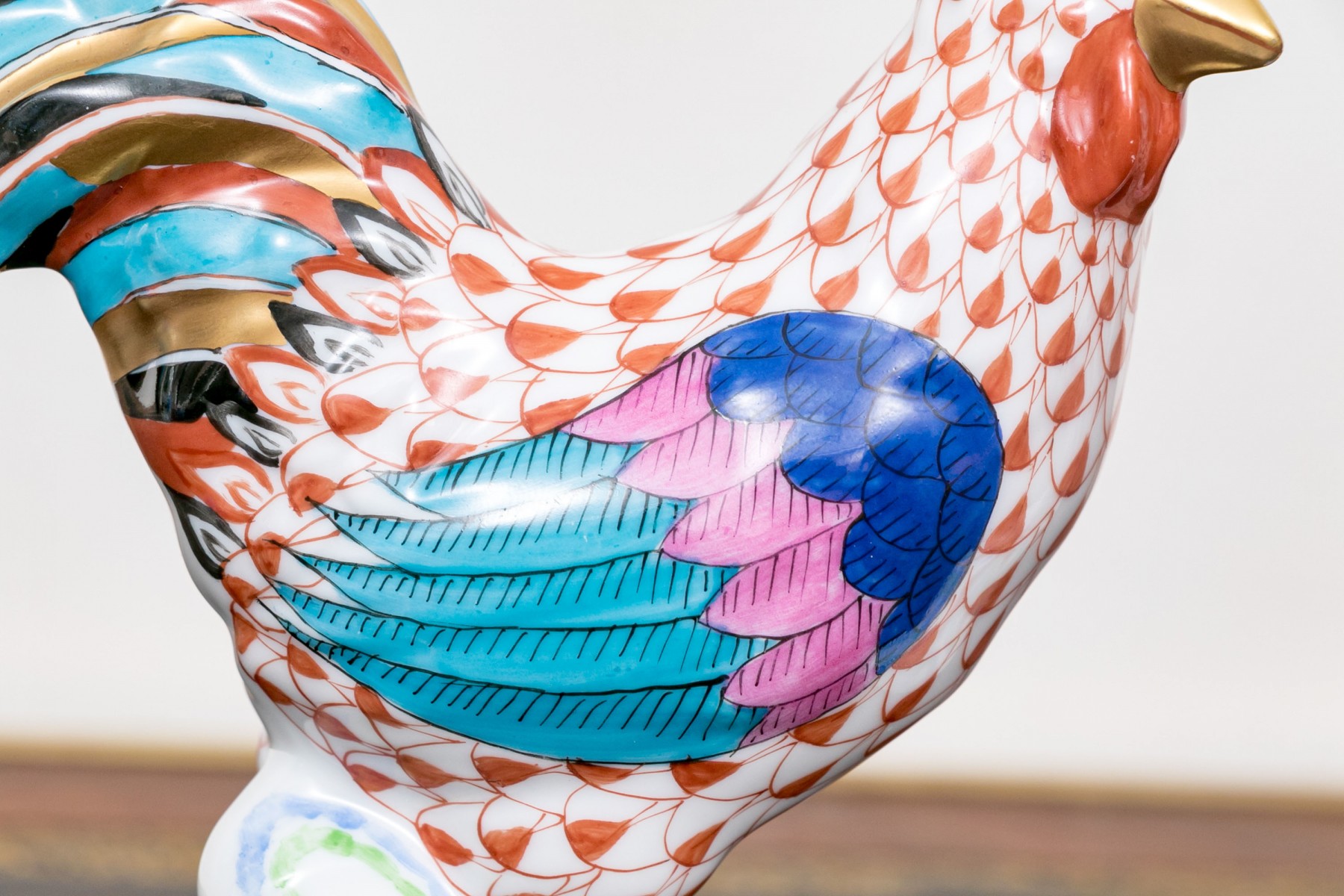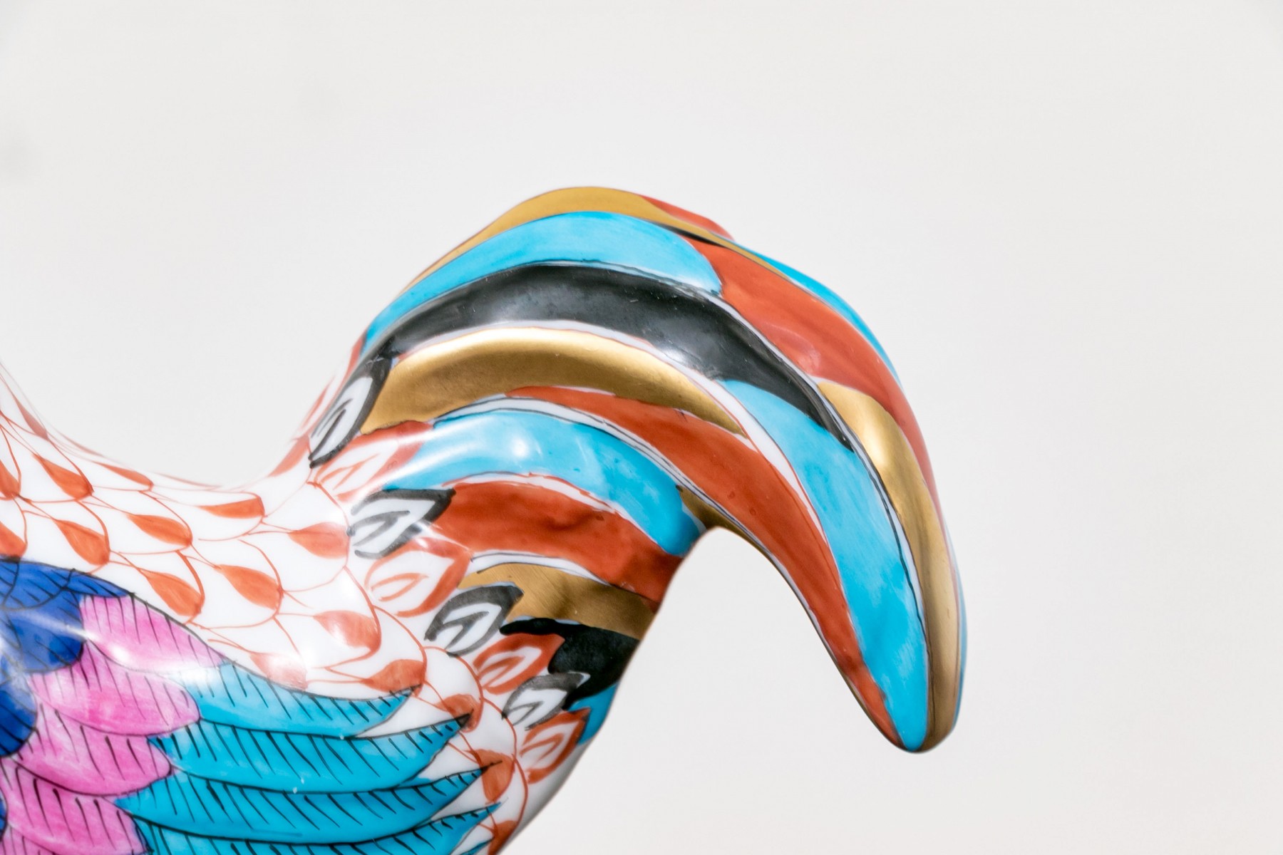 Fantastic pair of Herend, Hungarian hand painted porcelain roosters. Presented with classic fishnet decorative motif to the birds bodies with delightfully polychrome painted tail feathers, wings and majestic gilt beaks.