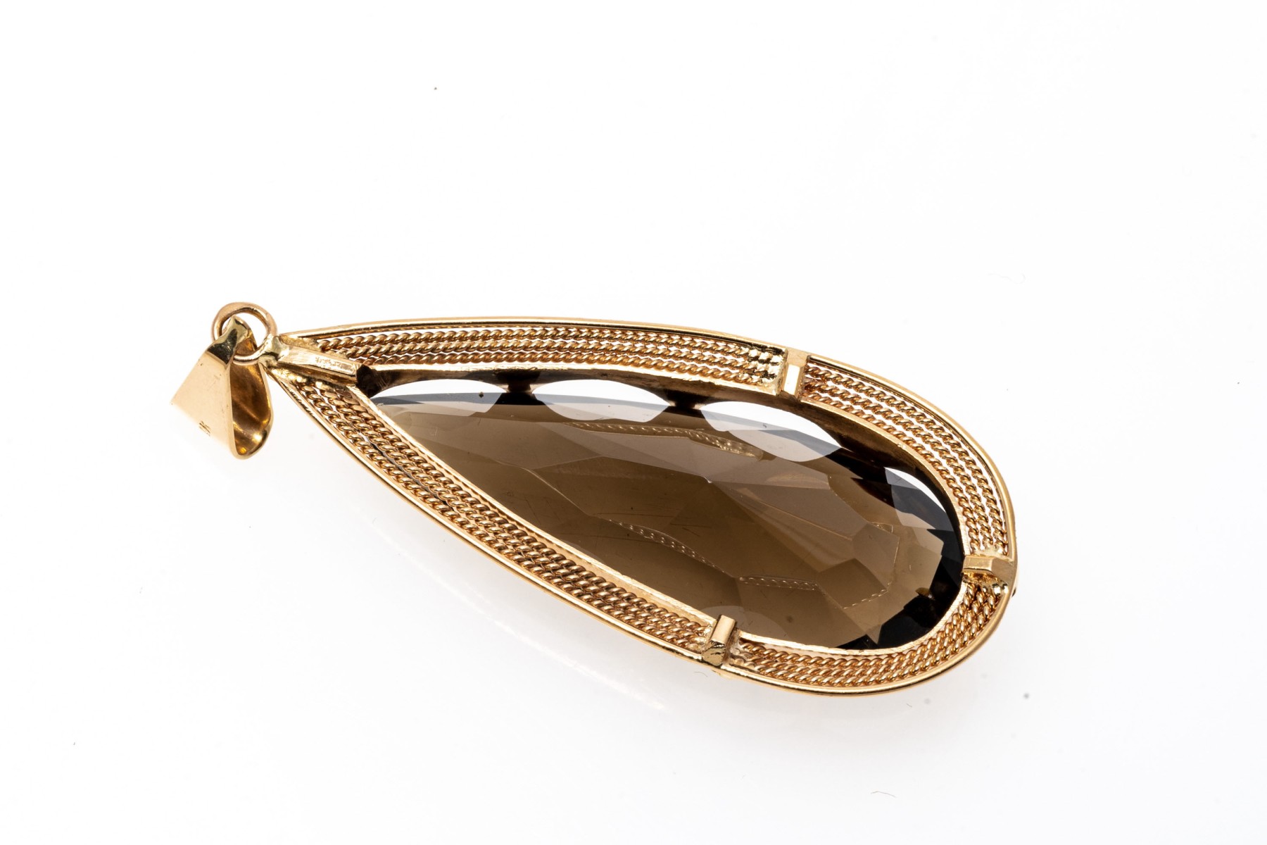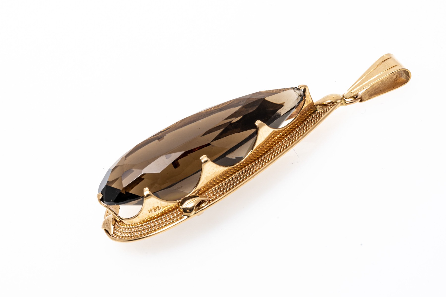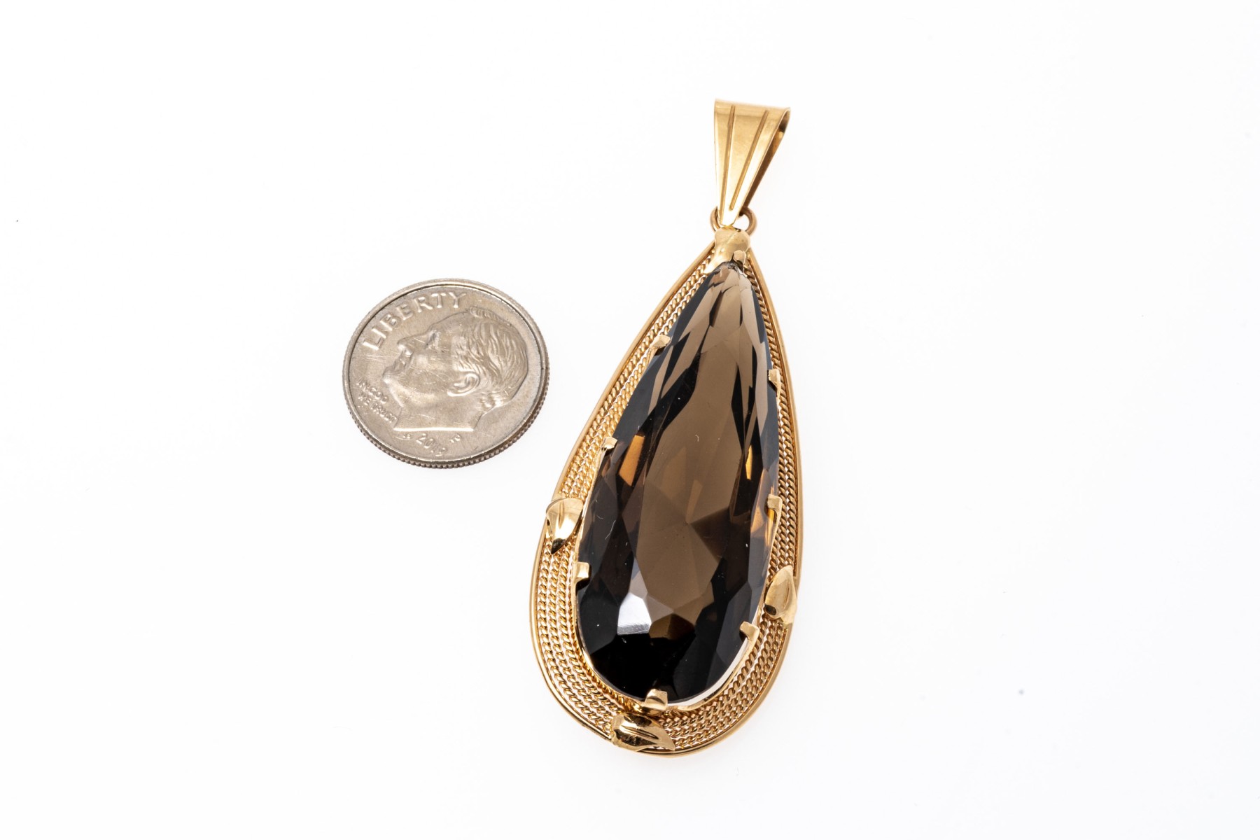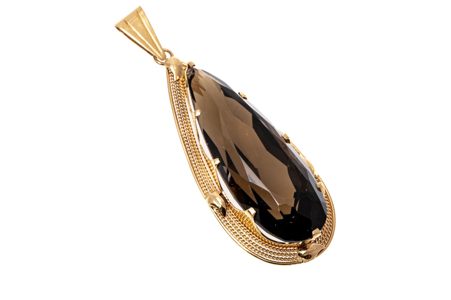 Fantastic pear cut smoky quartz stone displayed in a 14K yellow gold pendant with a twist frame and leaf accents. The stone is approximately 29.49 cts.