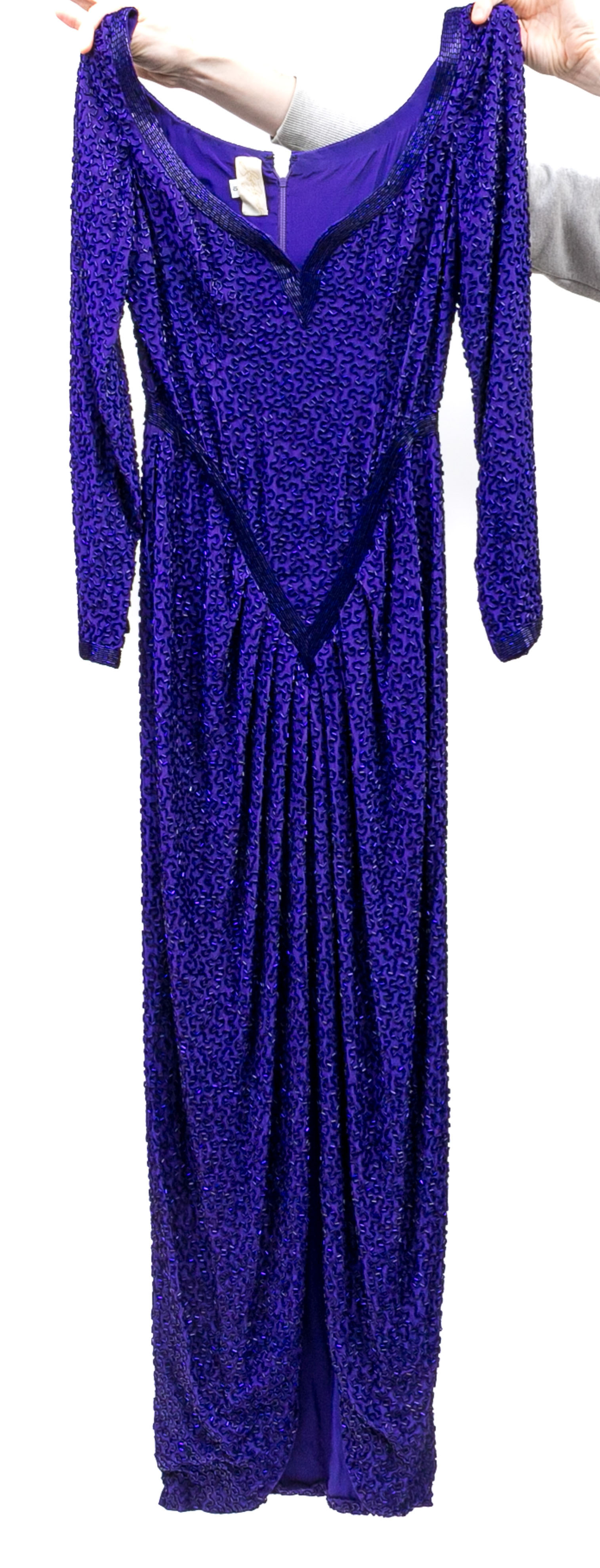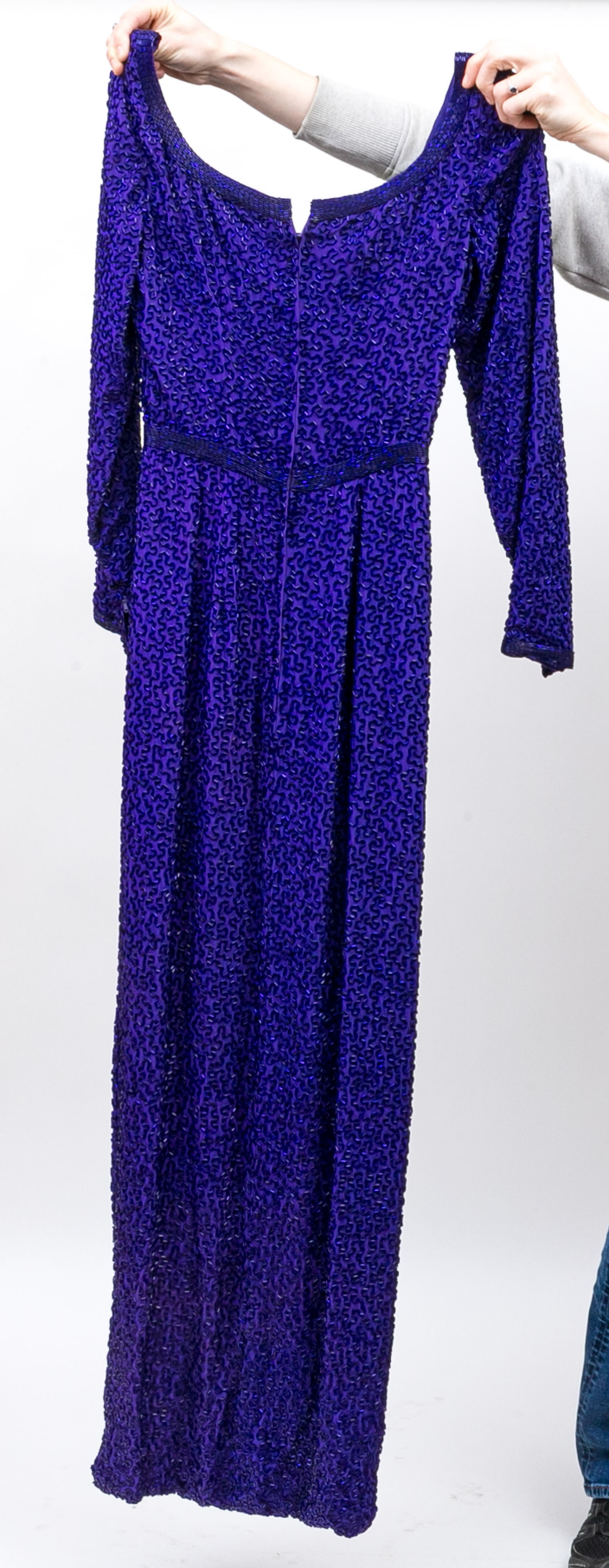 Fantastic long purple beaded retro evening gown. Zipper closure in the back