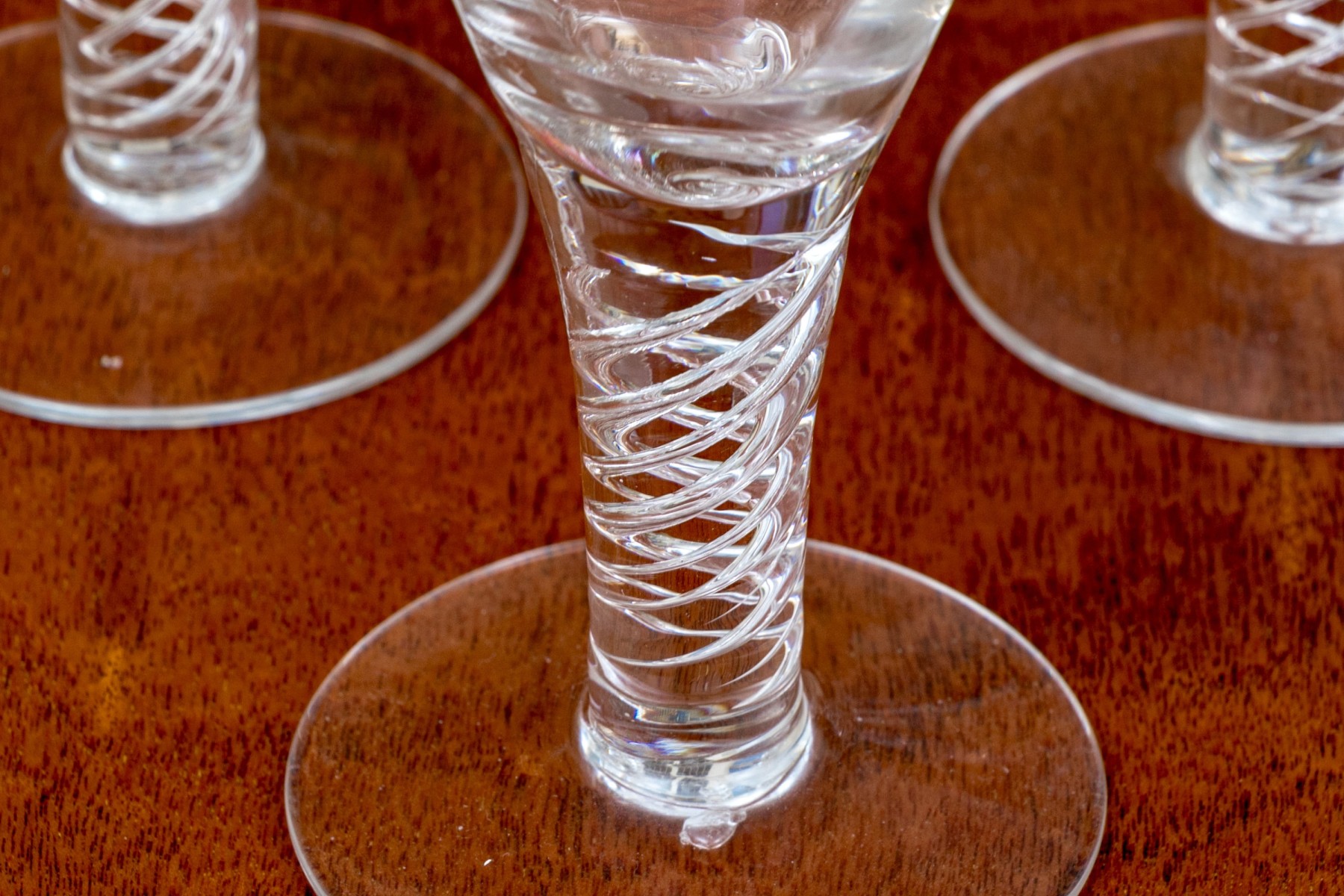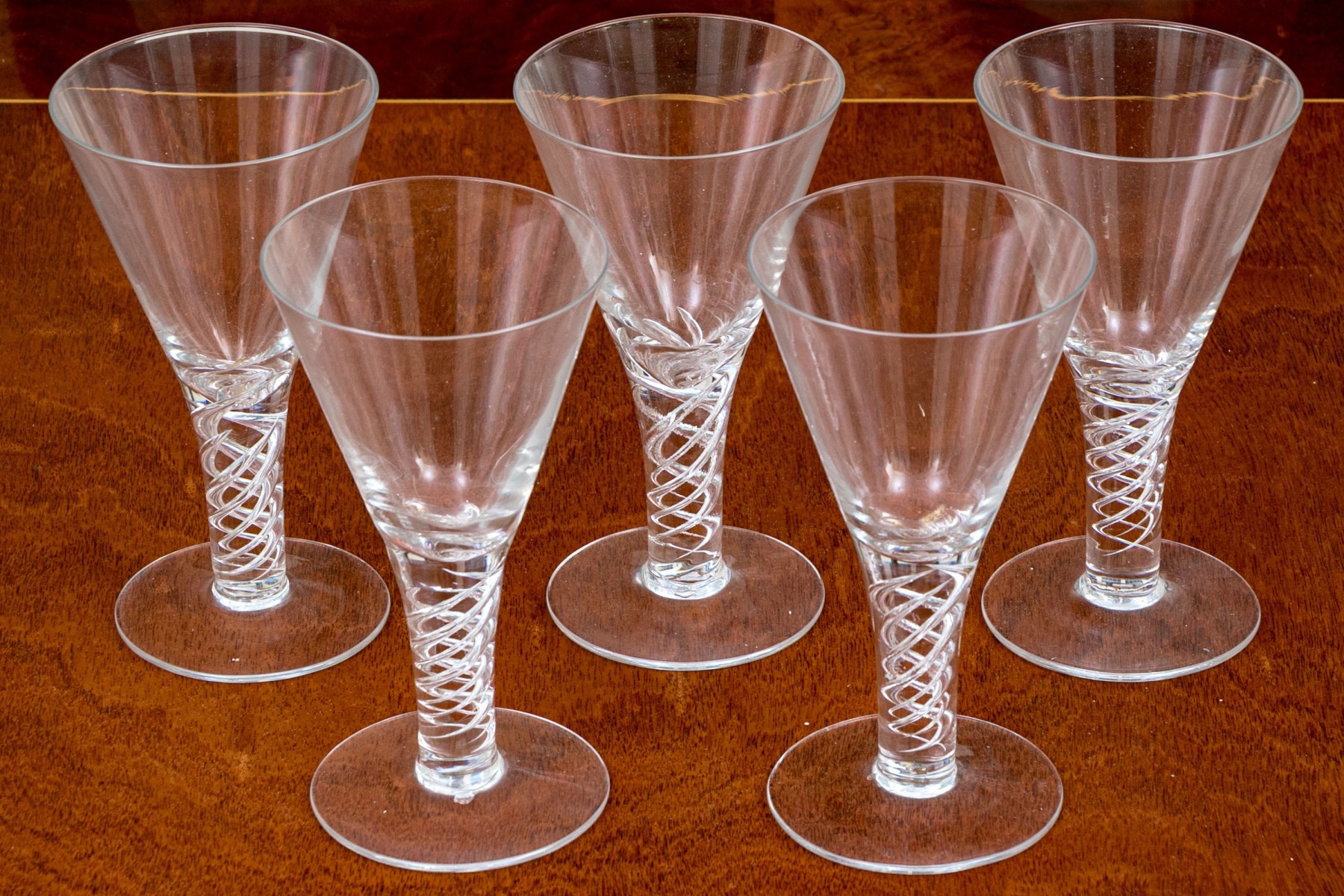 The stems wonderfully blown with a double air twist decorative motif to the stem and flared bowls.