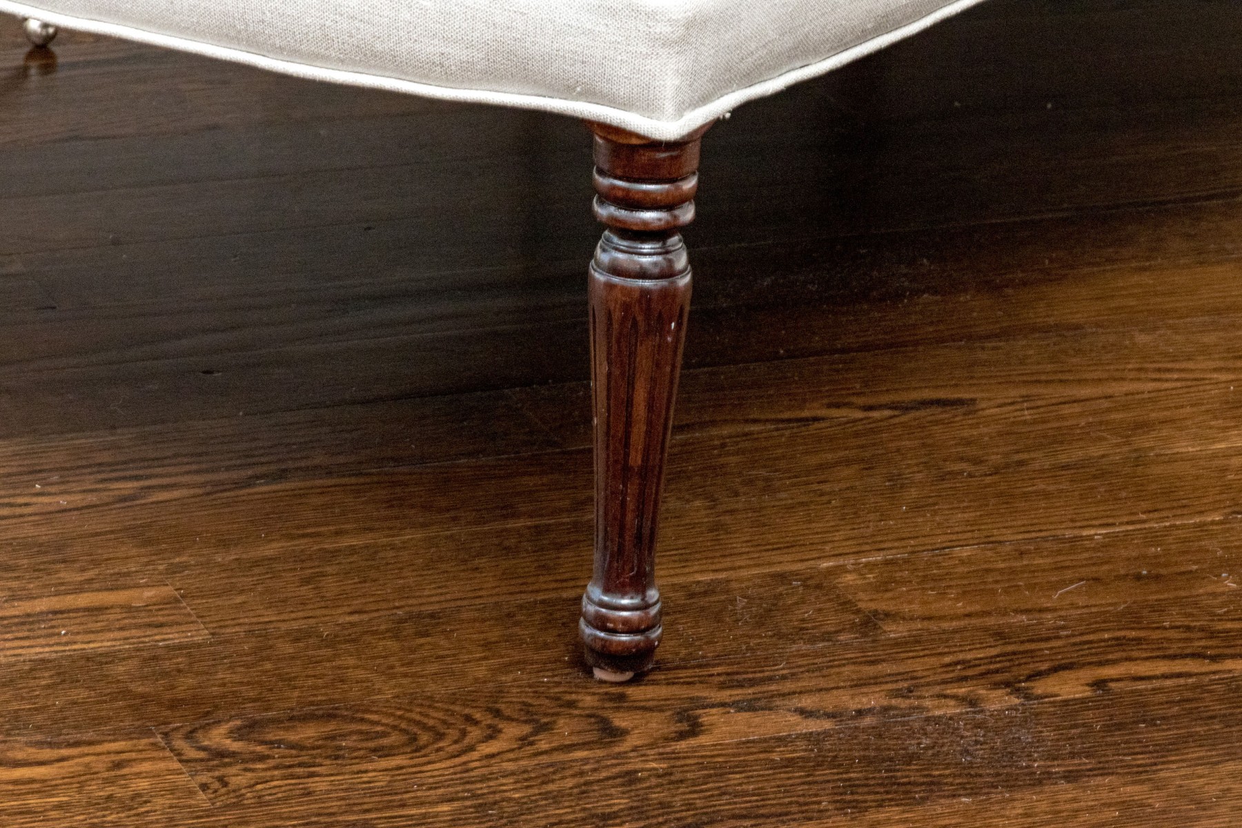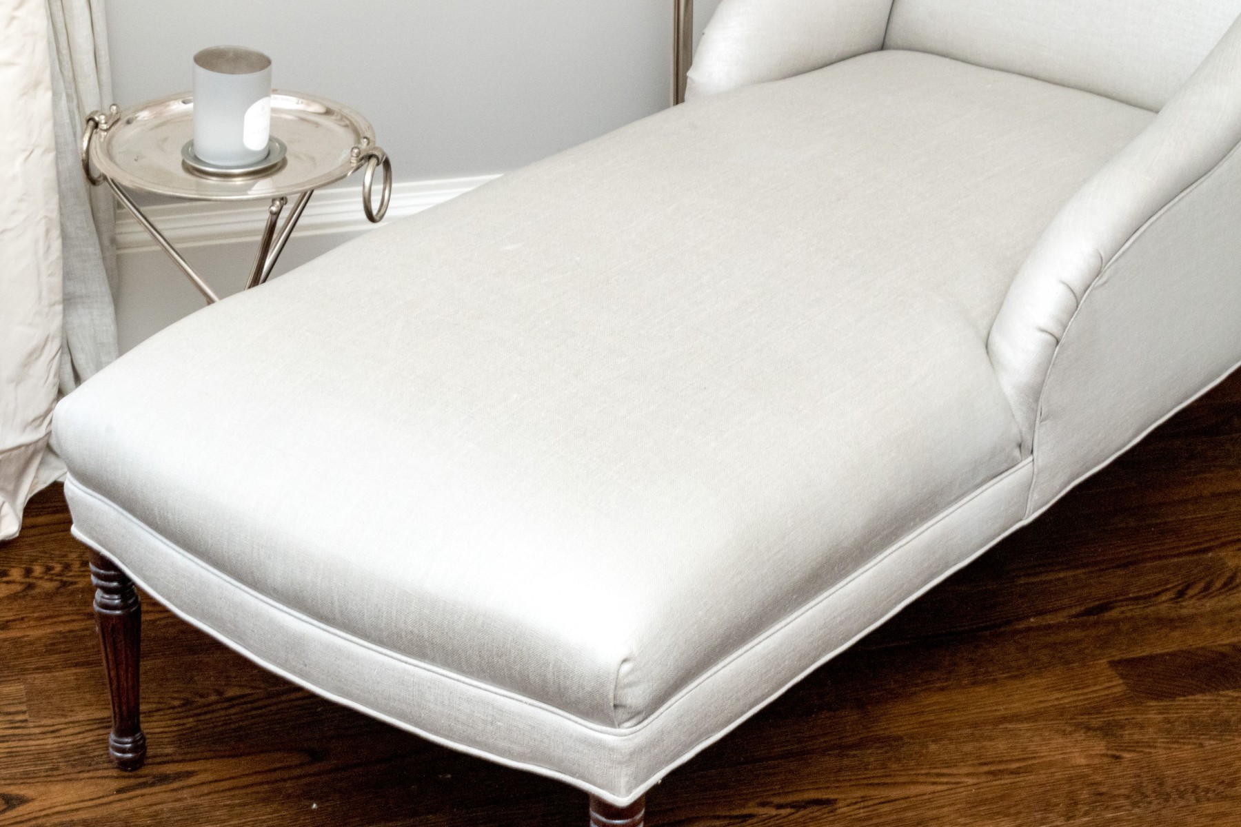 On carved and finished, footed wooden legs, the upholstered chaise presents wonderfully.