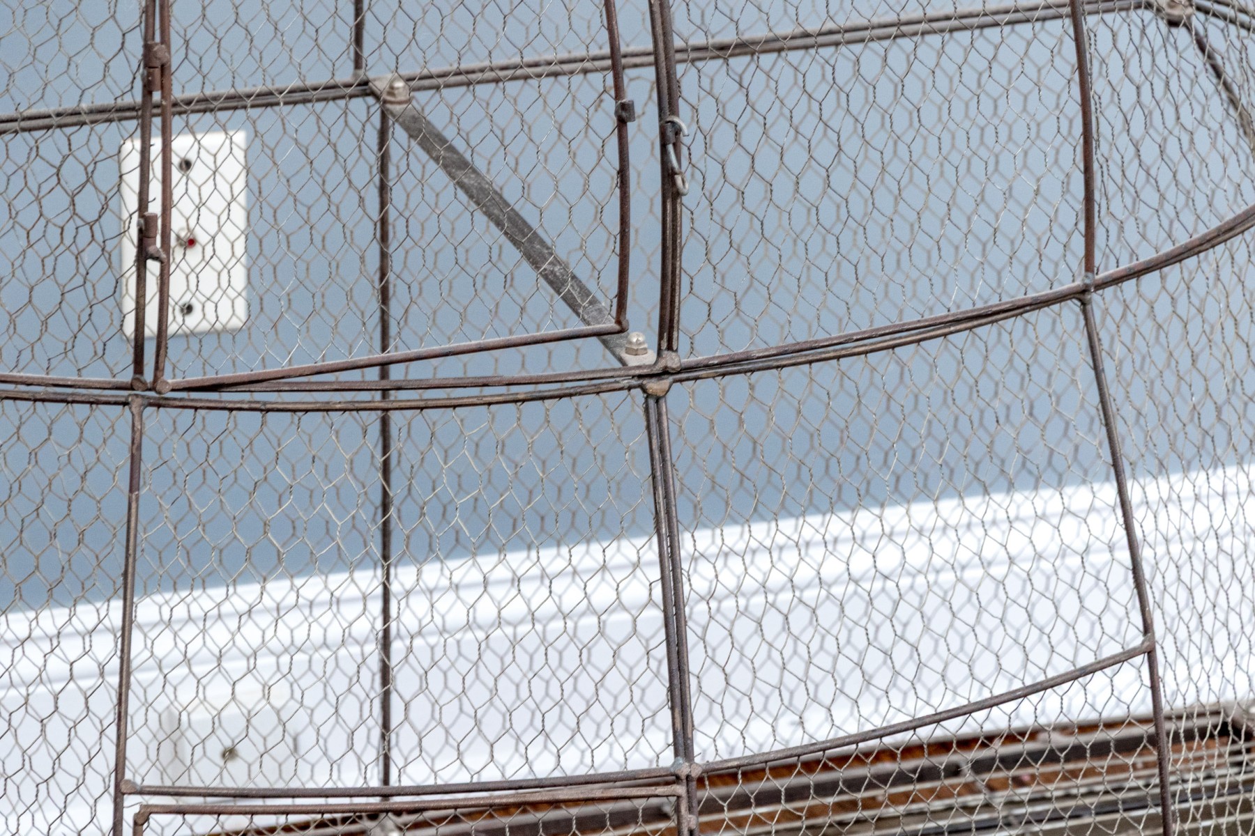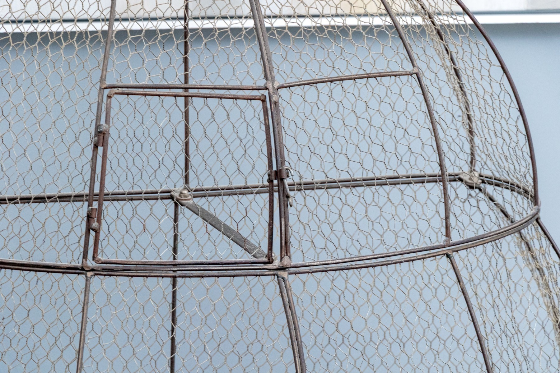 Raised on three feet, the birdcage has a flat back with a tiered form. At the bottom are two removable trays for ease of cleaning. The metallic frame with wire mesh has a lavish overall aesthetic.