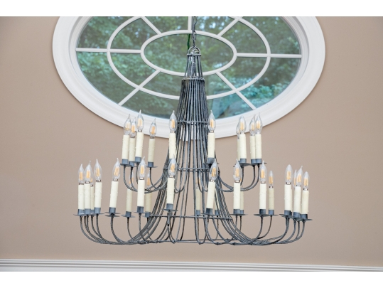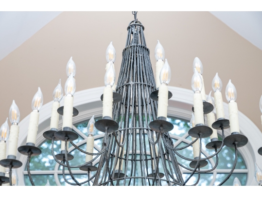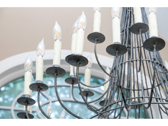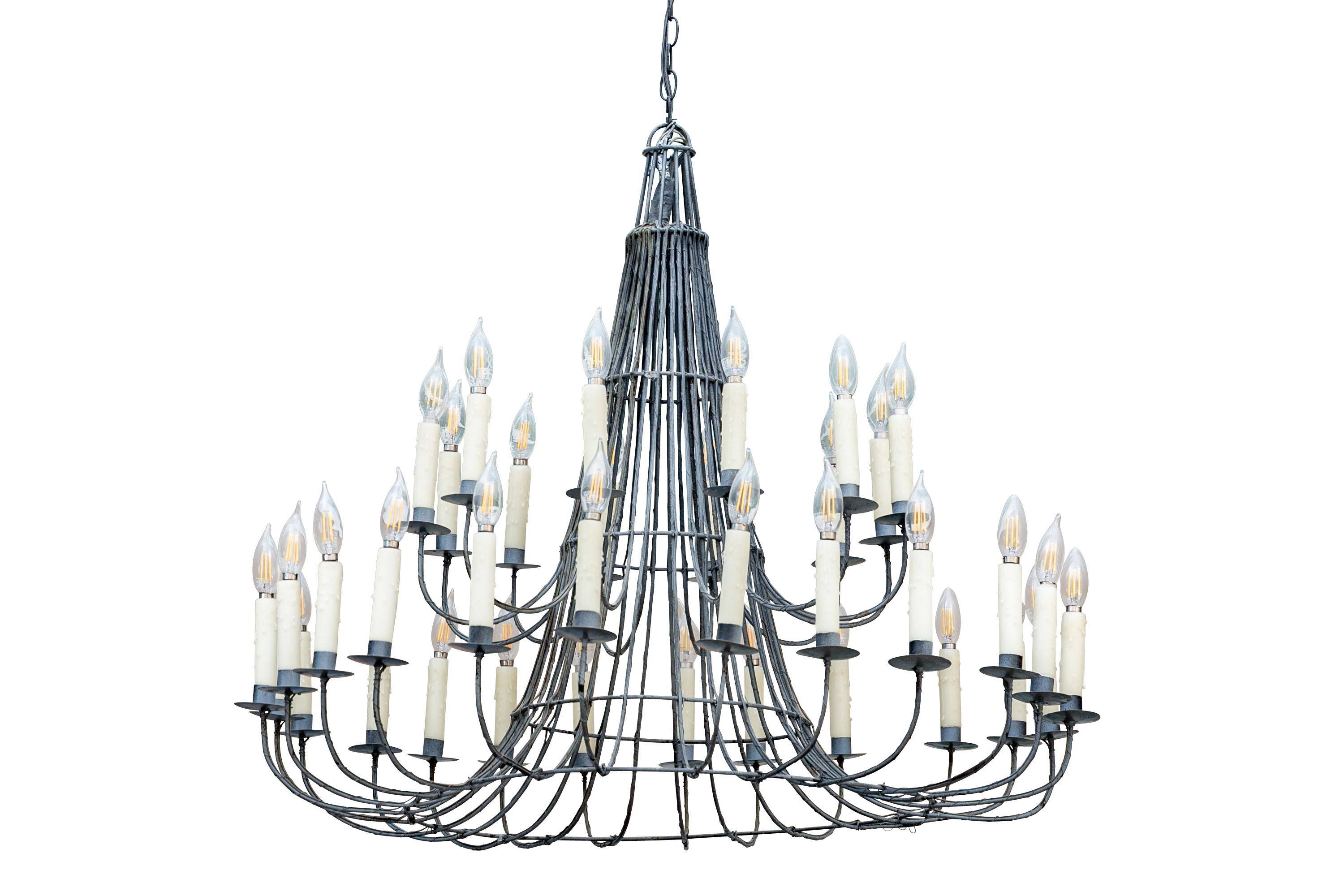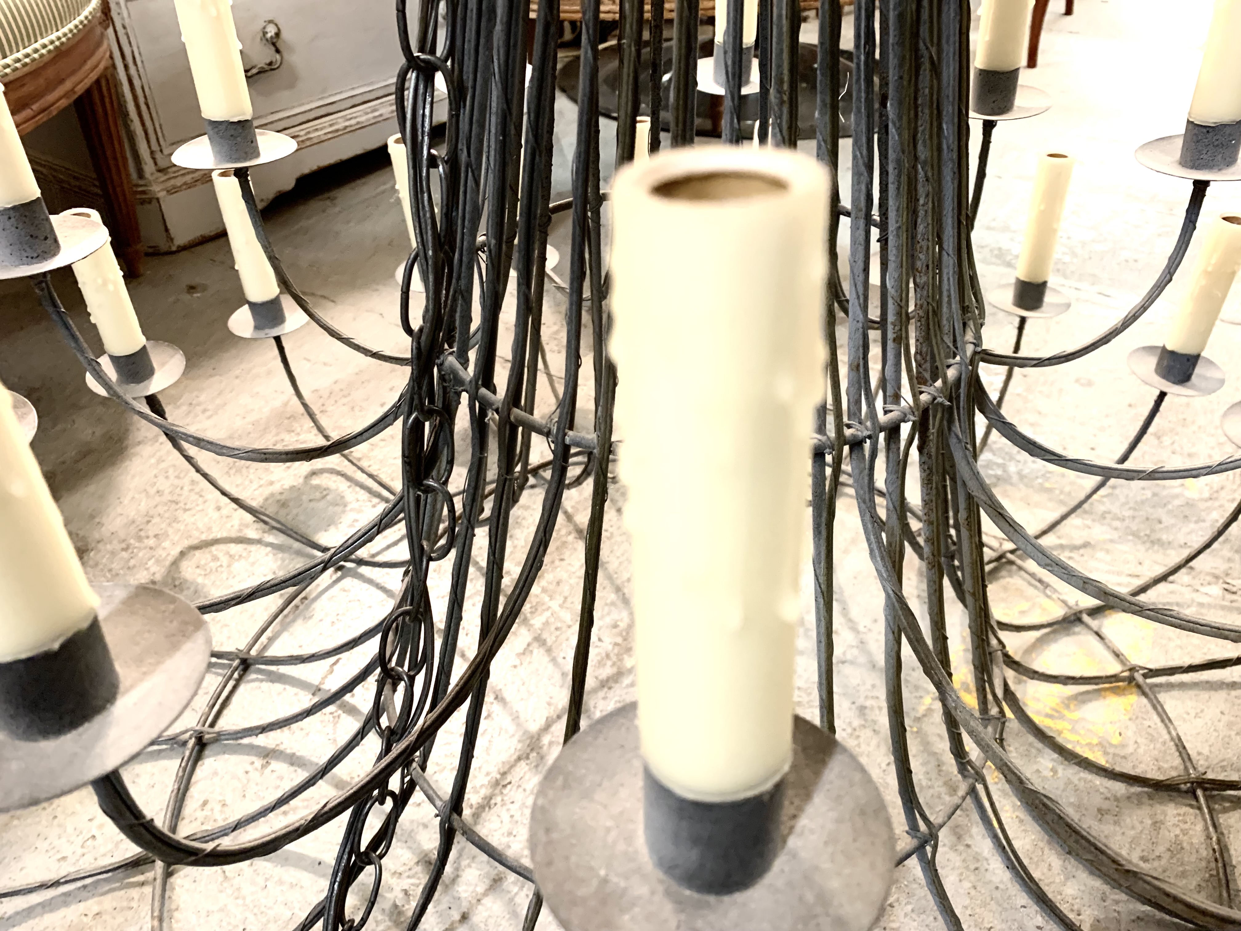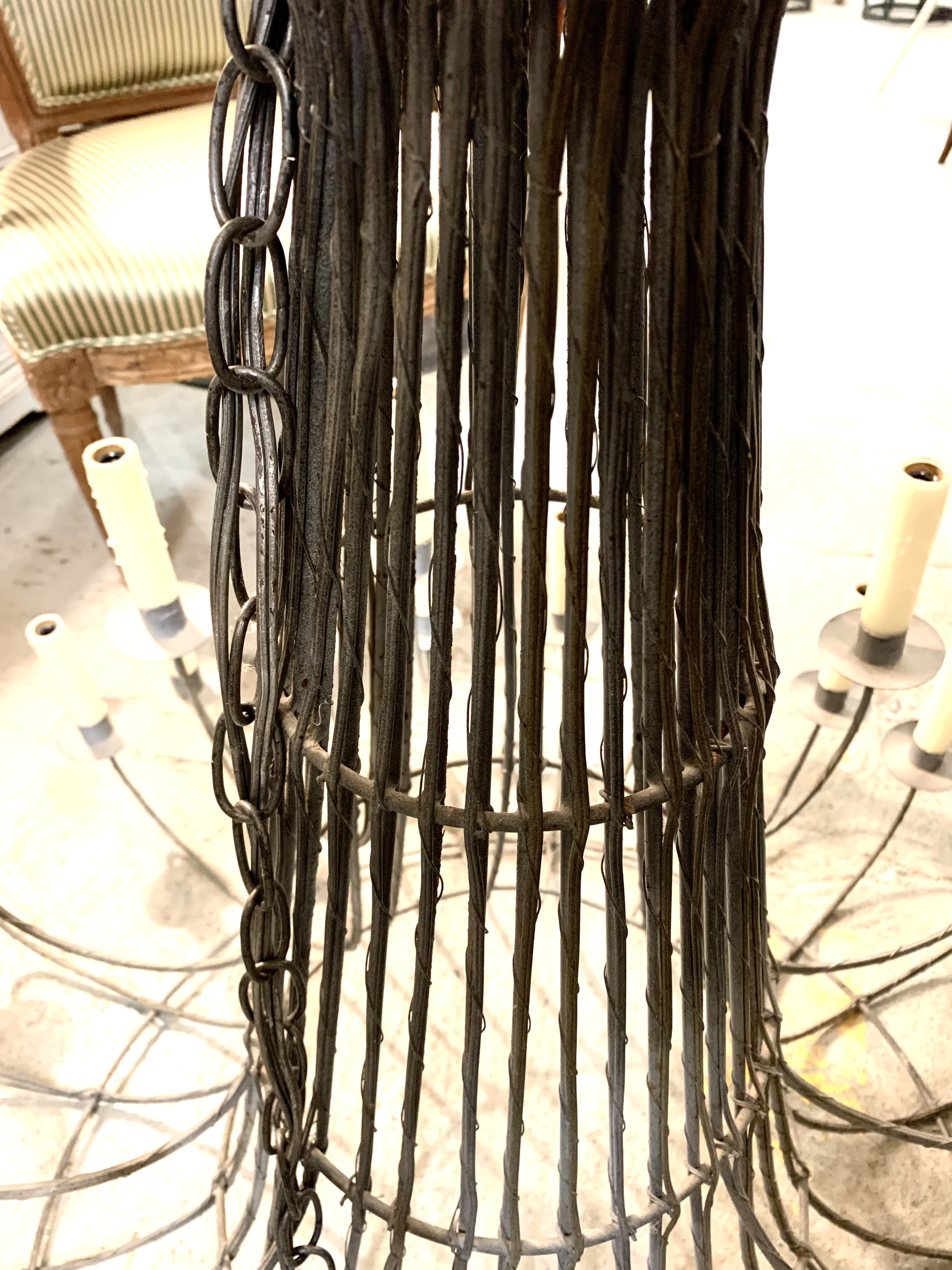 Wire and iron chandelier with 12 lights over 24 lights with wax candles on tiers of swan-necked iron stems.. Perfect for large rooms with high ceilings, this would be the ultimate solution for providing both amazing illumination and enchanting style.
