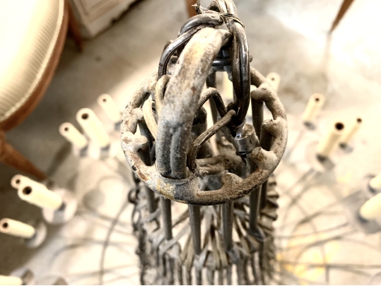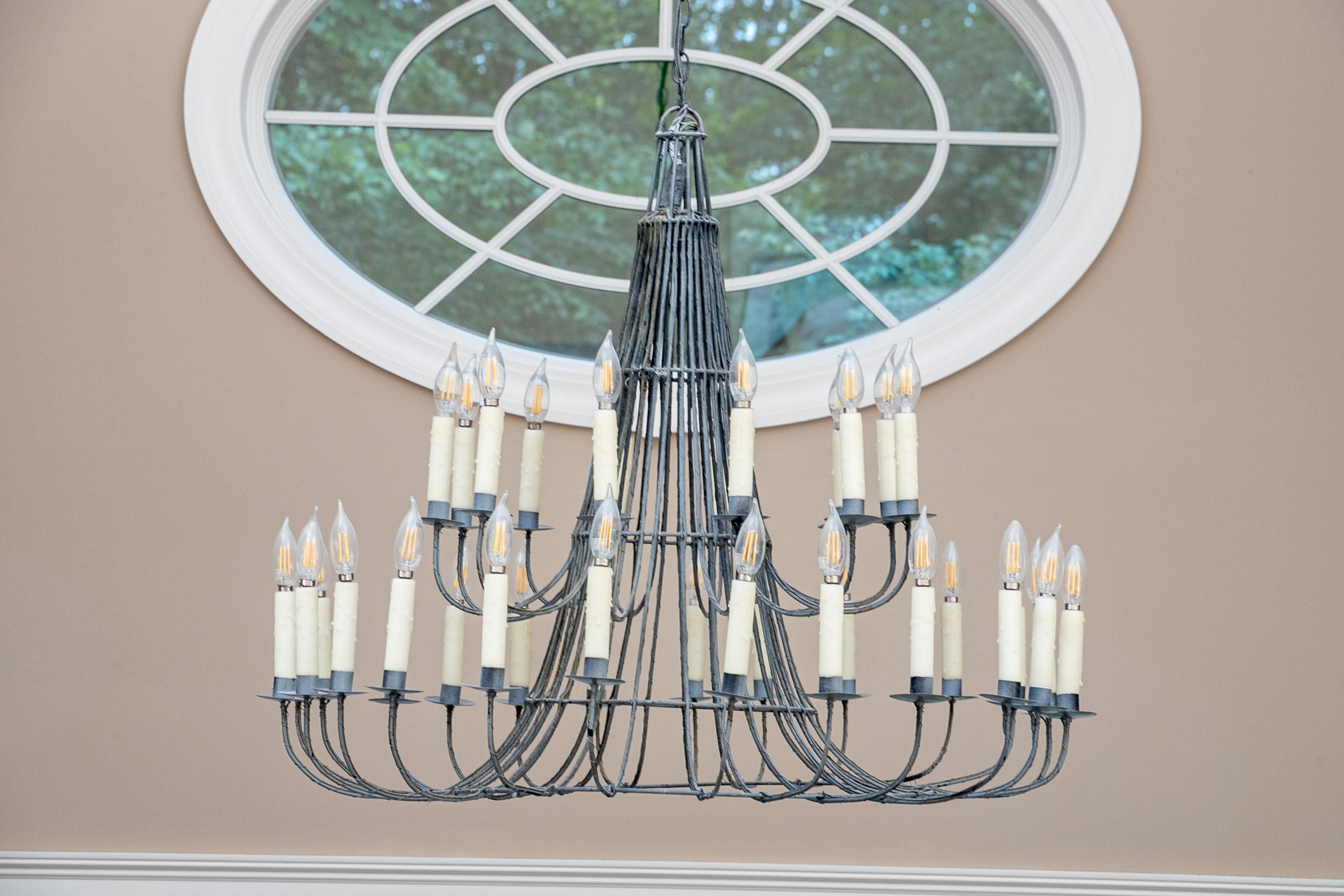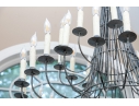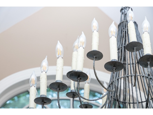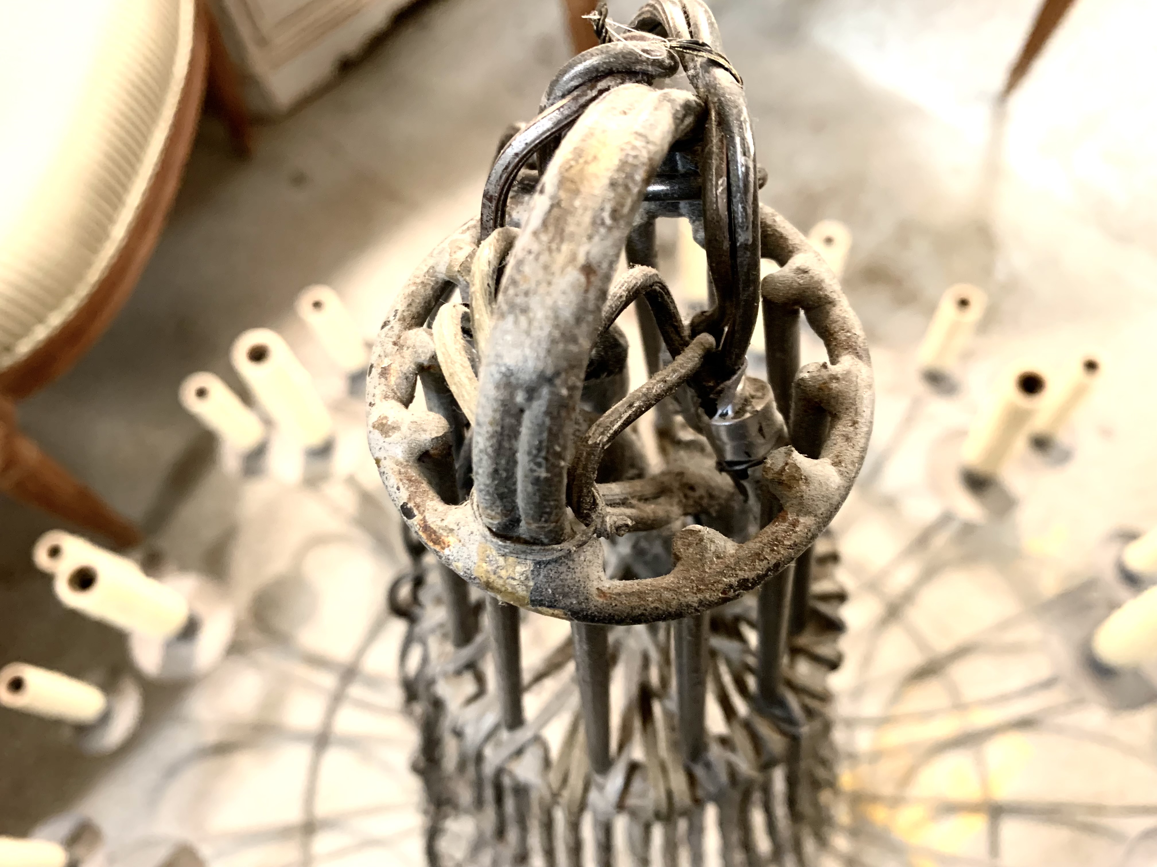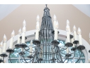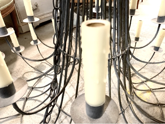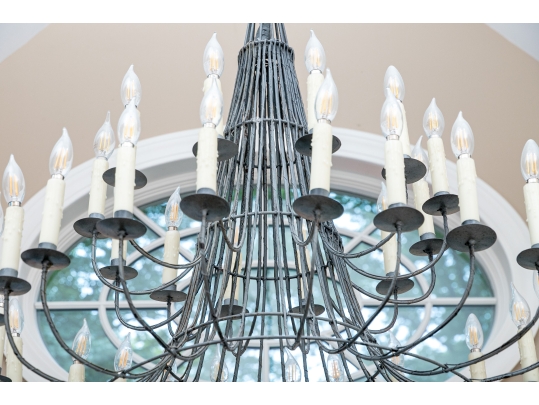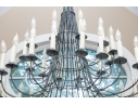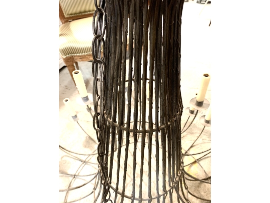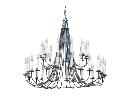 Wire and iron chandelier with 12 lights over 24 lights with wax candles on tiers of swan-necked iron stems.. Perfect for large rooms with high ceilings, this would be the ultimate solution for providing both amazing illumination and enchanting style.