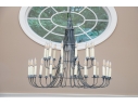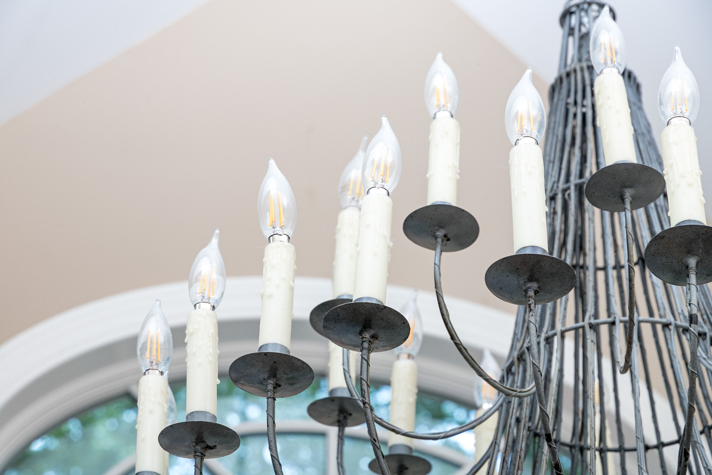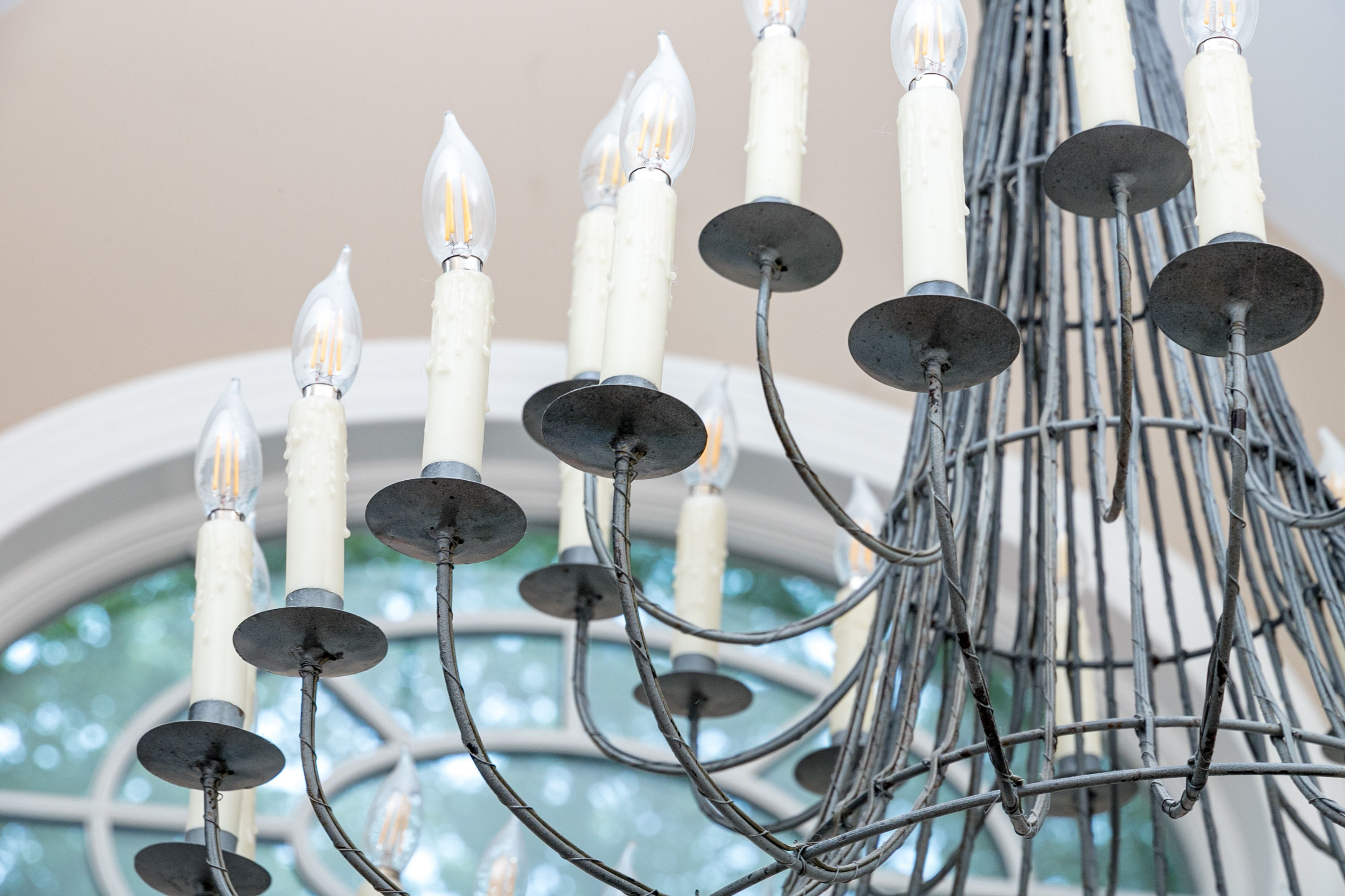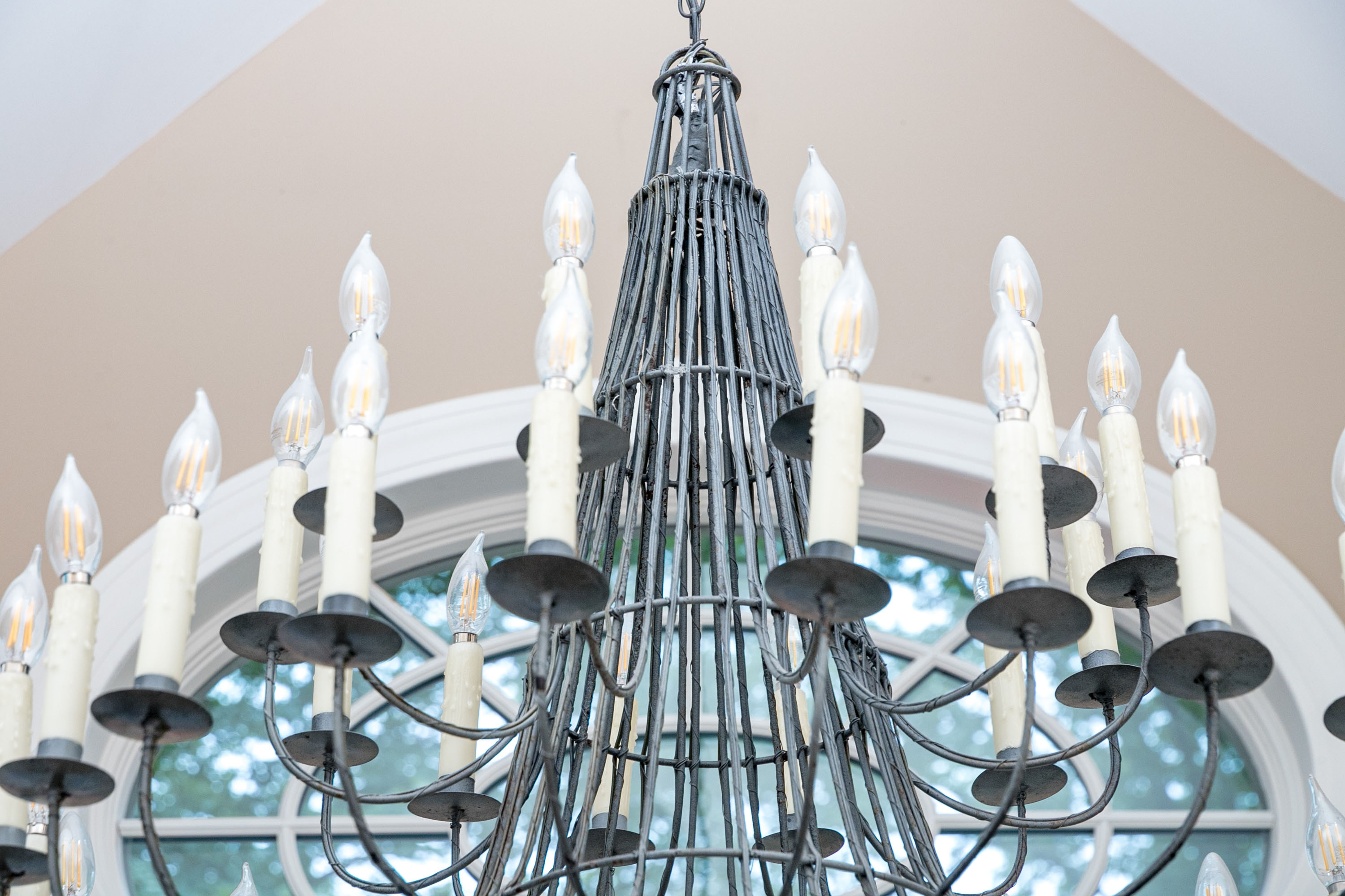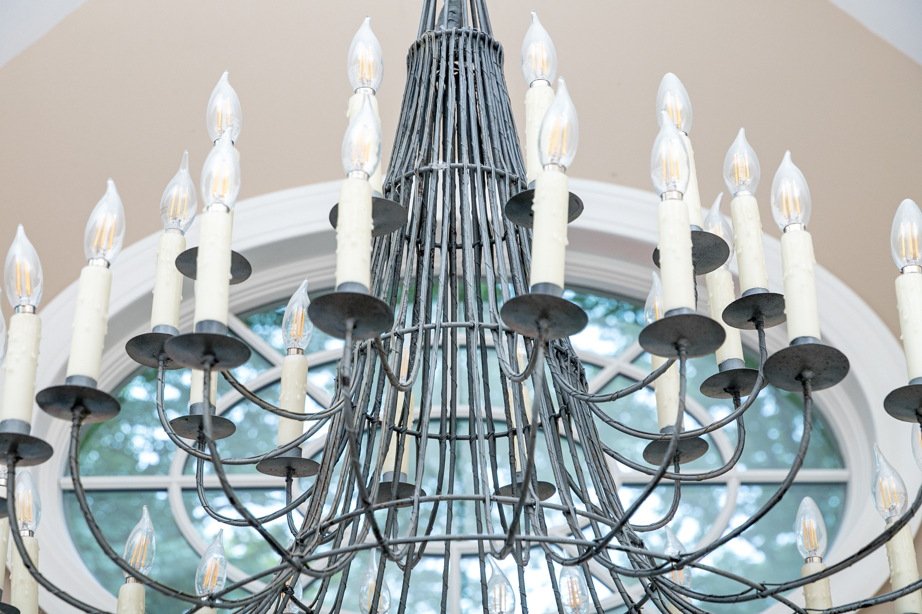 Wire and iron chandelier with 12 lights over 24 lights with wax candles on tiers of swan-necked iron stems.. Perfect for large rooms with high ceilings, this would be the ultimate solution for providing both amazing illumination and enchanting style.
