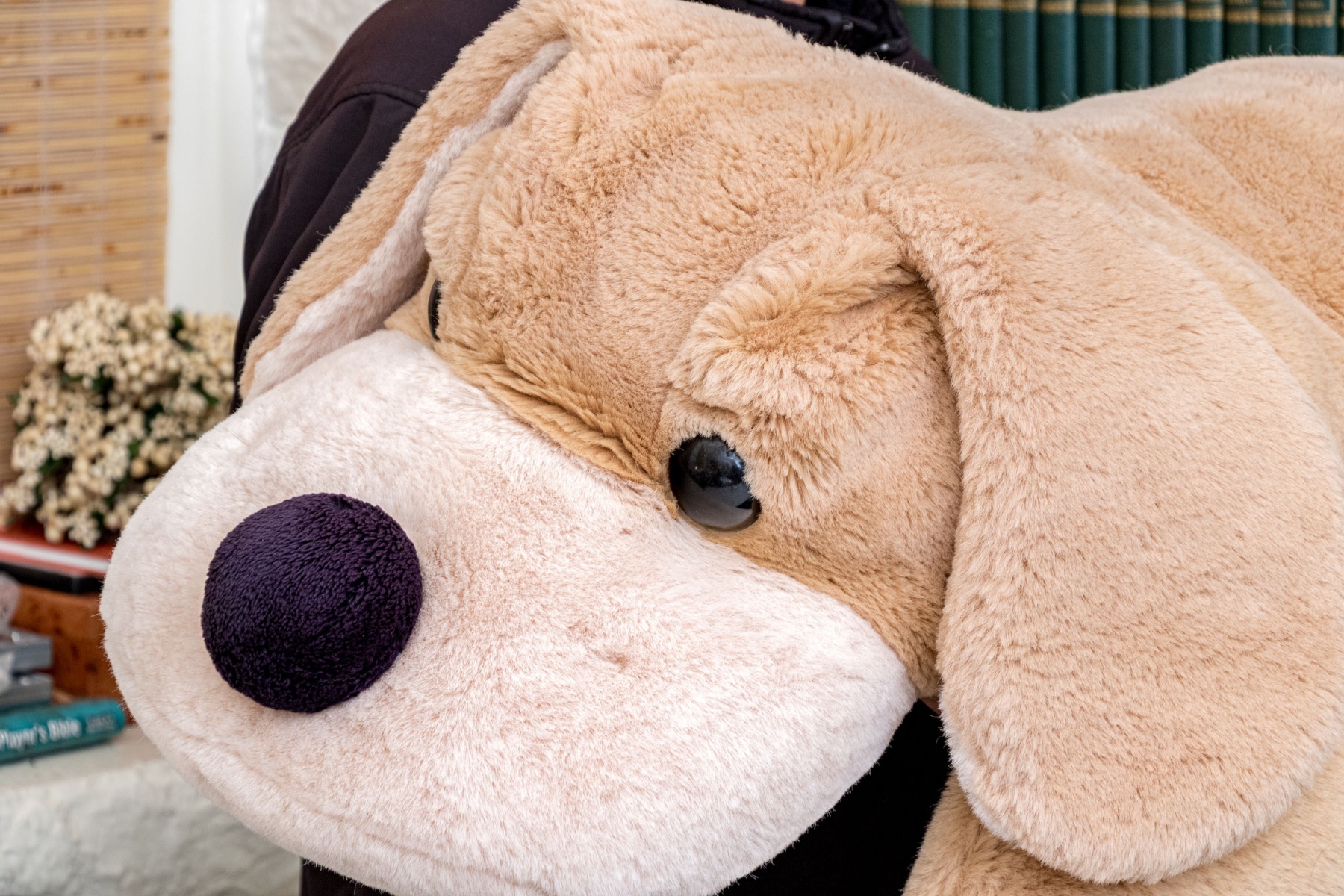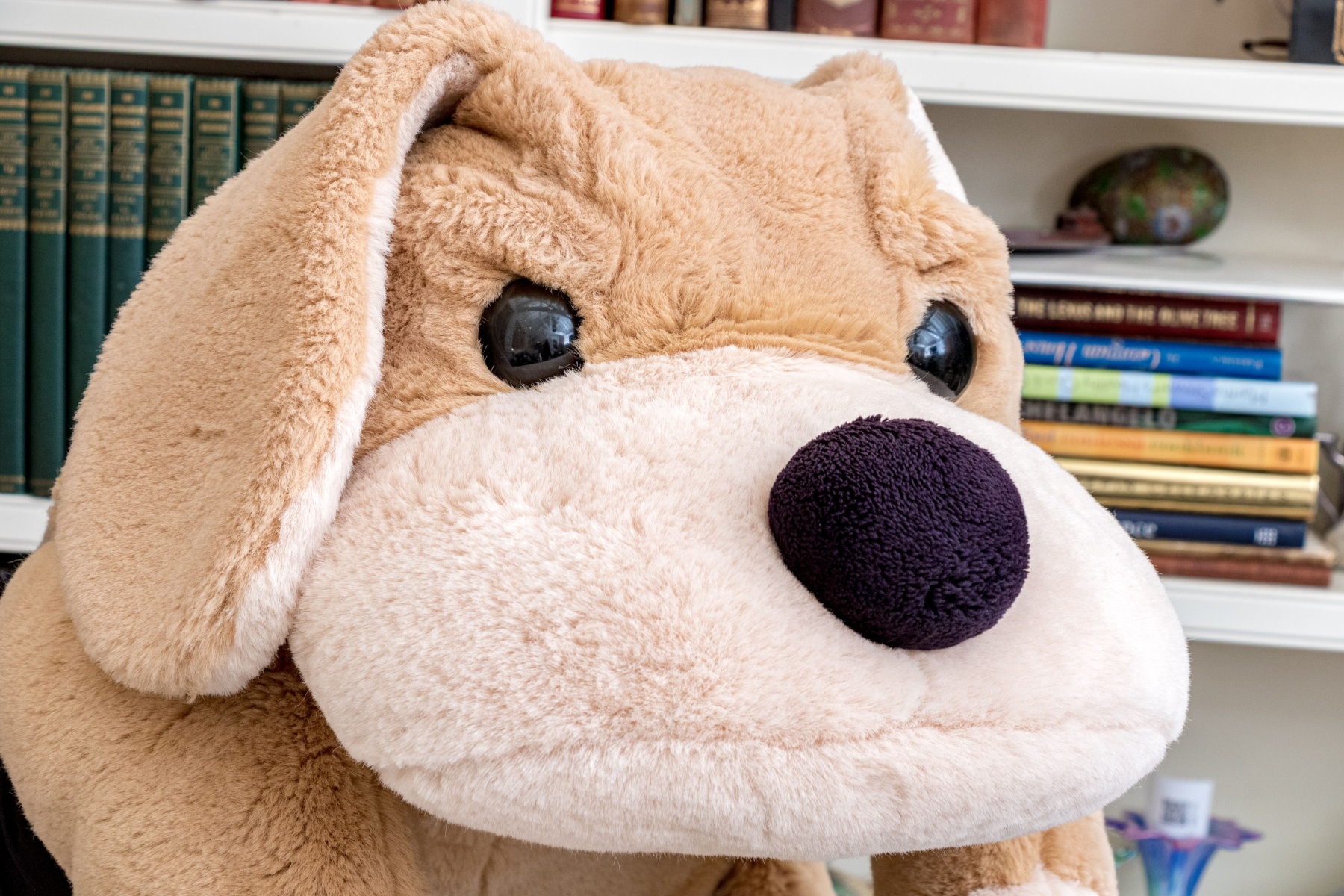 A delightful FAO Schwarz "Patrick the Pup" oversized dog plush in light latte brown with a large, dark nose, acrylic eyes, and a cream muzzle and paws. The dog is soft and adorable with large ears and a wedged tail.