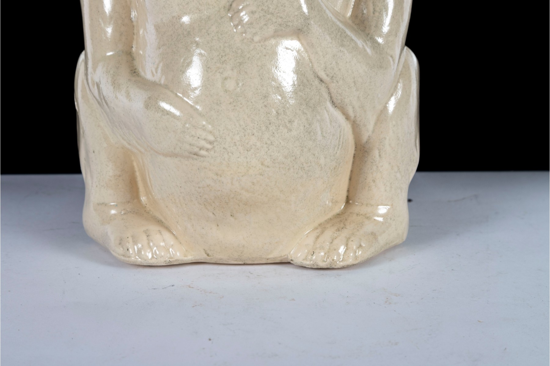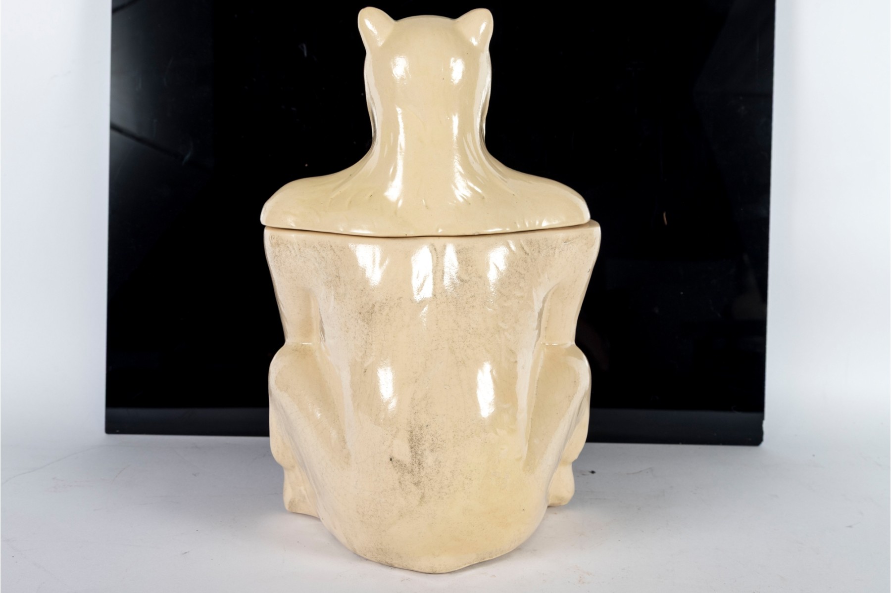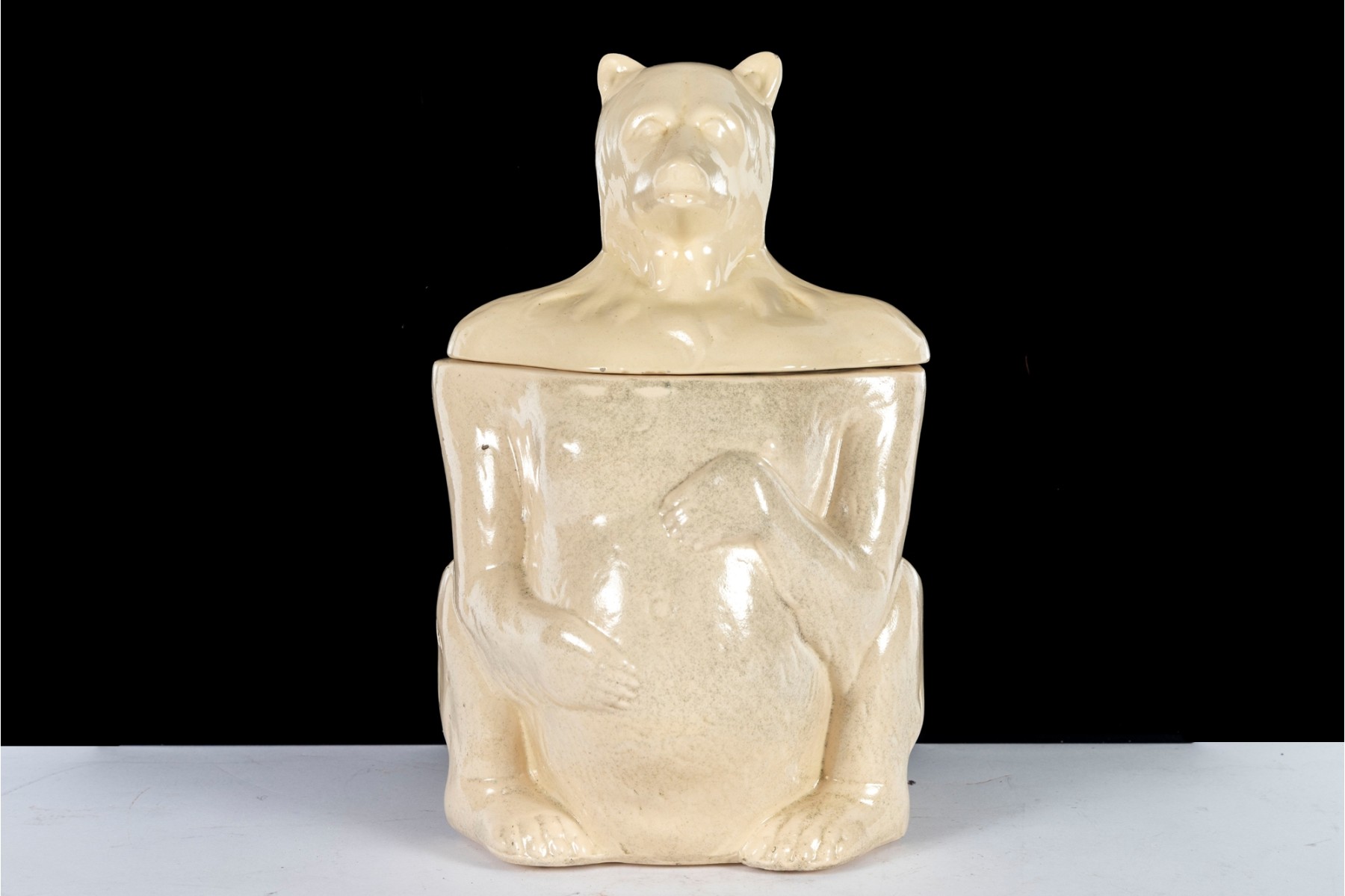 Charming ceramic cookie jar in the form of a seated bear, produced as a reproduction of FAPCO's 1940's mid-20th century model American cookie jars.