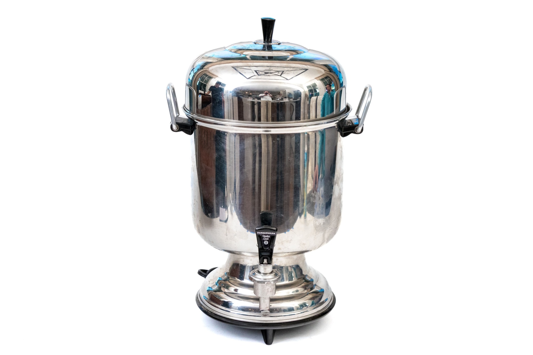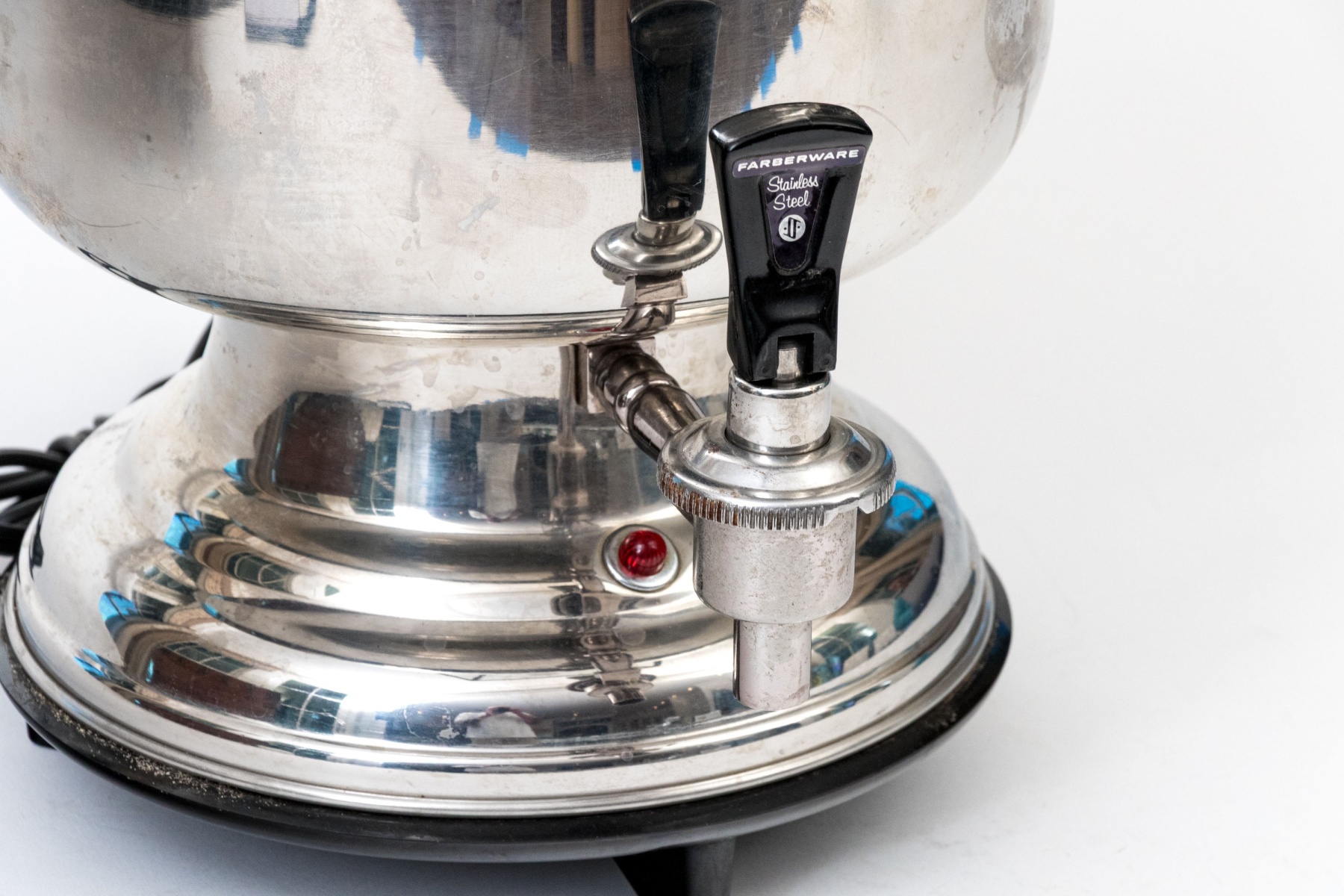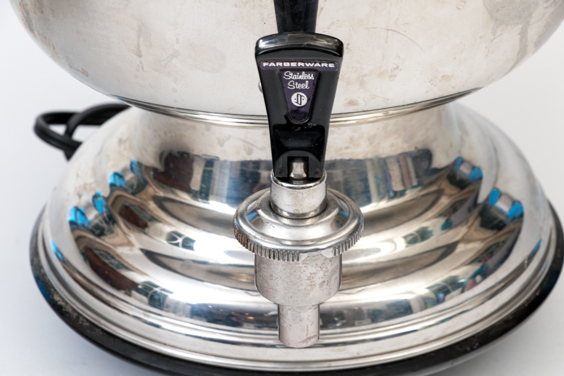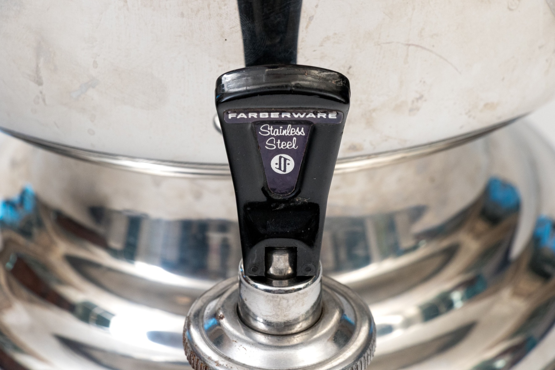 A handy Farberware stainless steel coffee urn designed with twin handles and a spout and lever, raised on a footed base with a lid and finial.