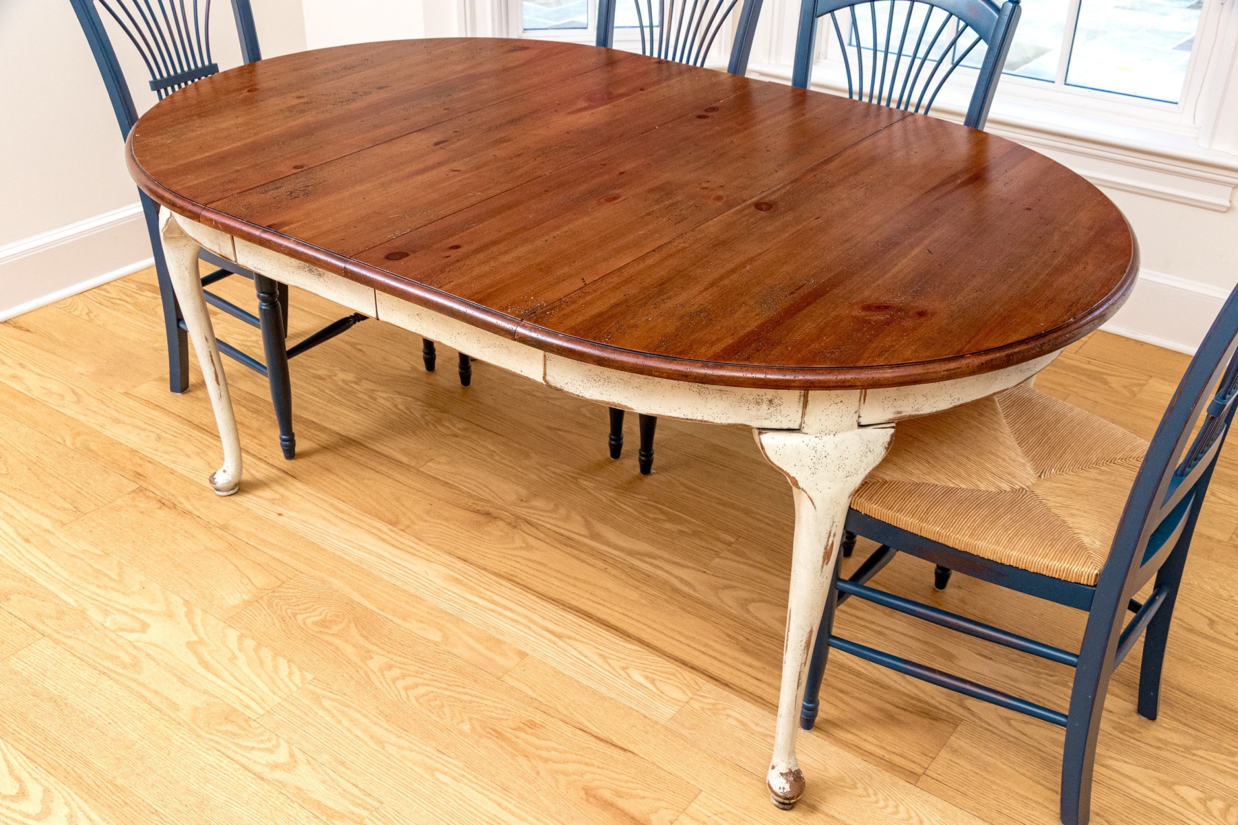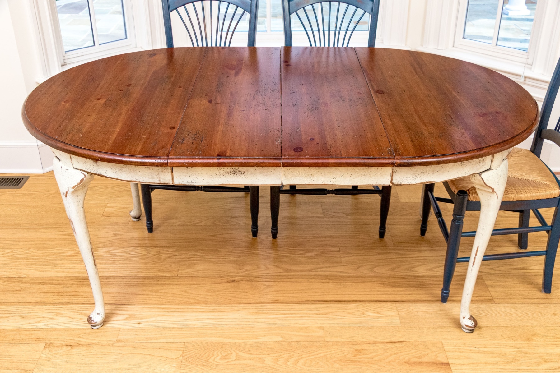 A fabulous extension breakfast table with great farmhouse chic and French country charm, well crafted with an extension top in a rich, warm-toned brown walnut finish including two leaves. Without the leaves the table sports a circular top, or is oval with the leaves in place. The lower frame is painted in distressed cream white for a wonderful rustic flair, raised on gently curved cabriole legs on slipper feet.