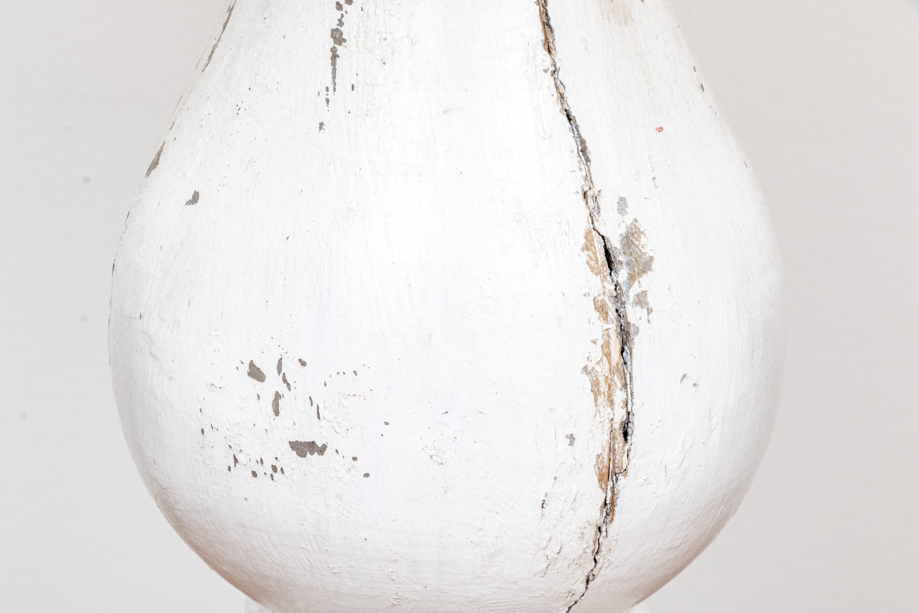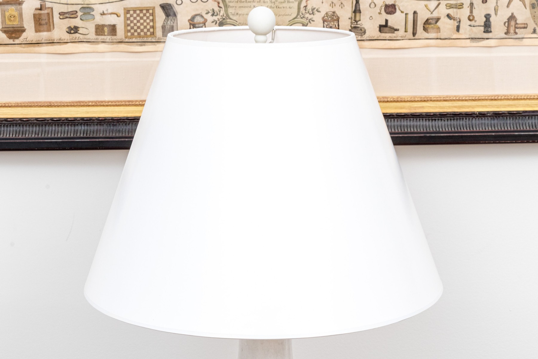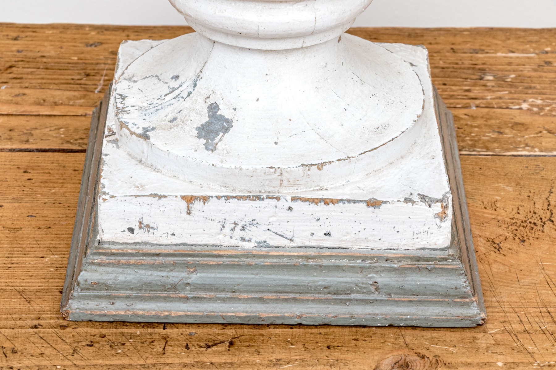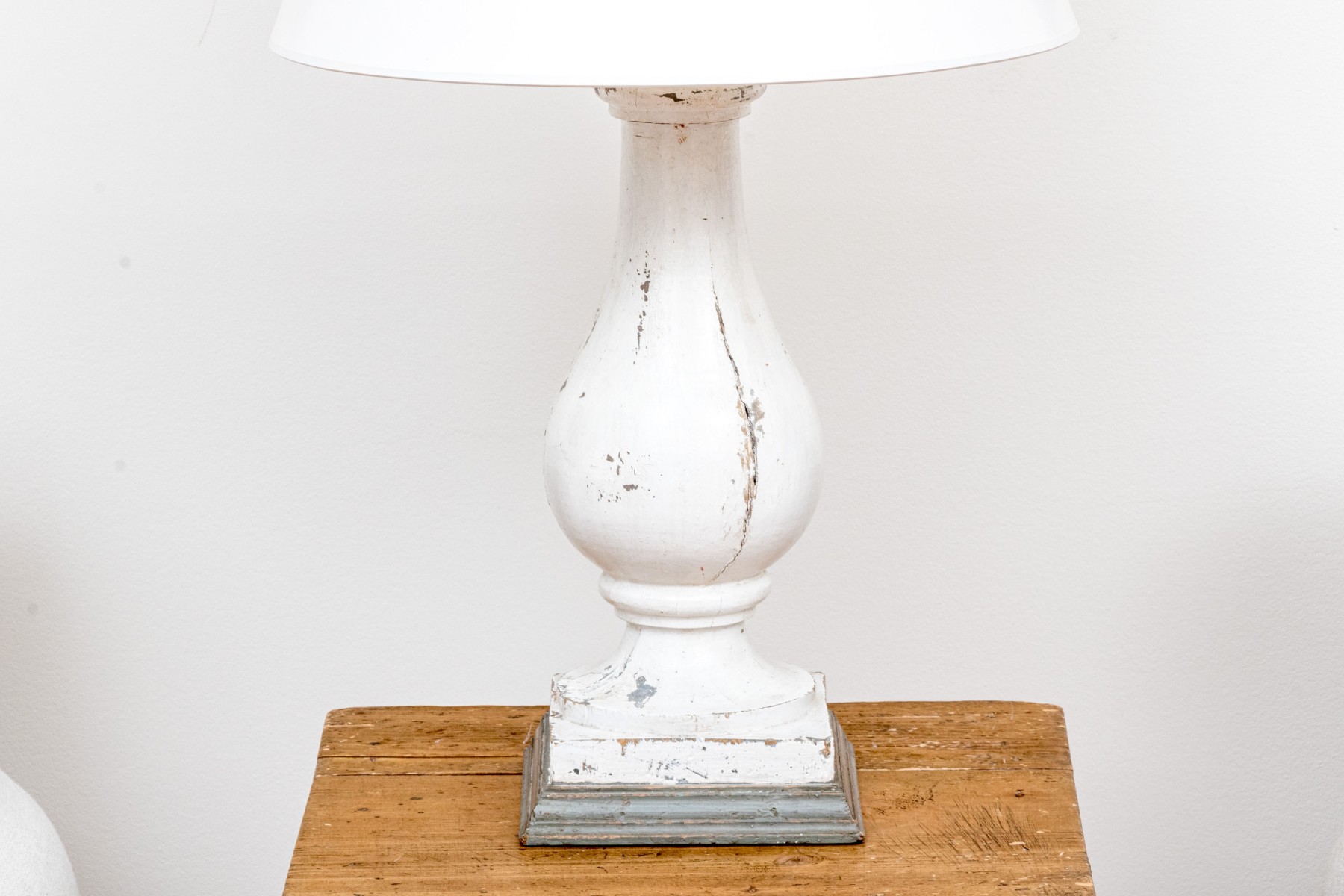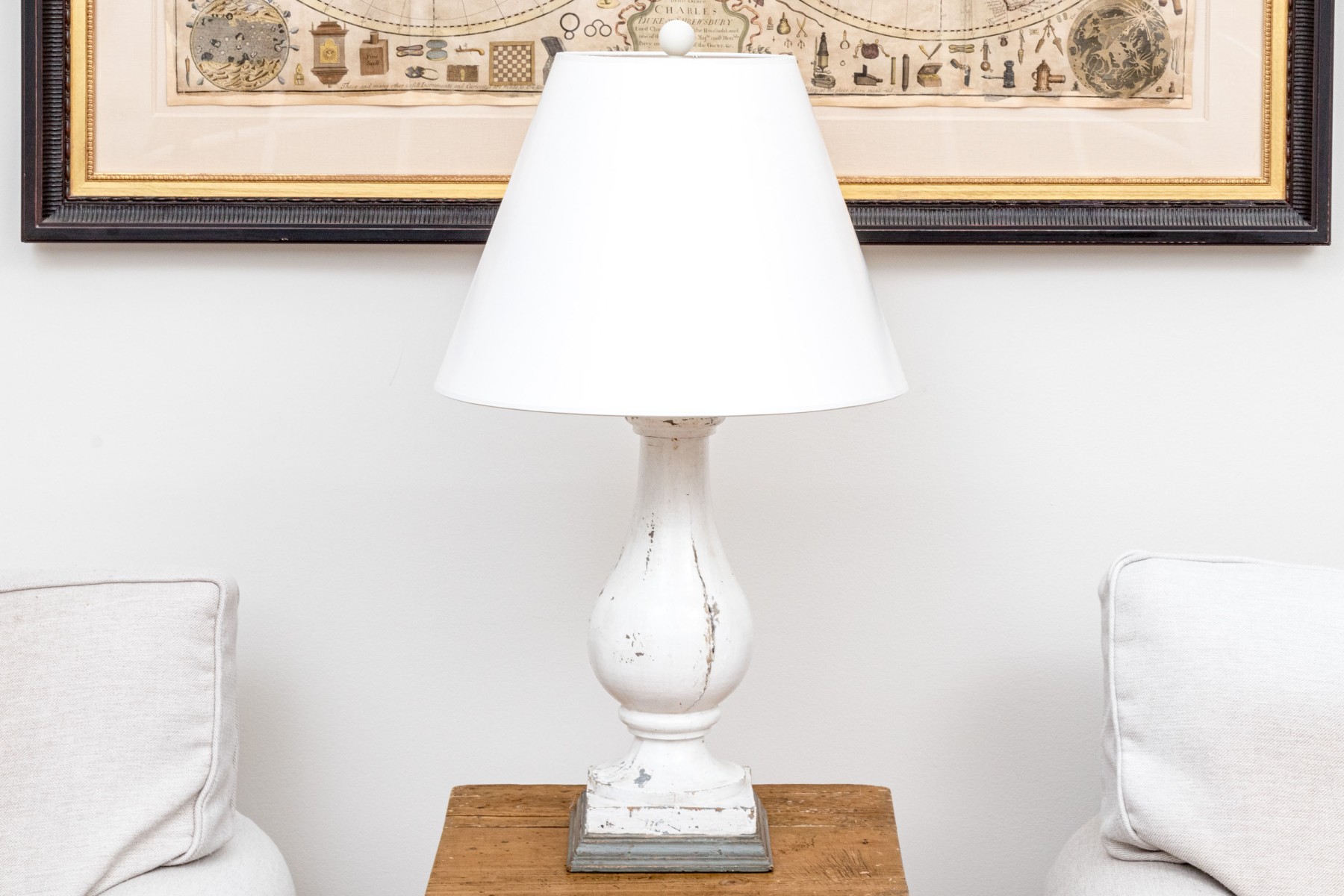 A fabulous table lamp exuding farmhouse and shabby chic appeal with an elegant pear-shaped baluster form body in a rustic, antiqued white painted finish over a tapered and beveled gray square base. surmounted with a white empire shade adorned with a spherical finial