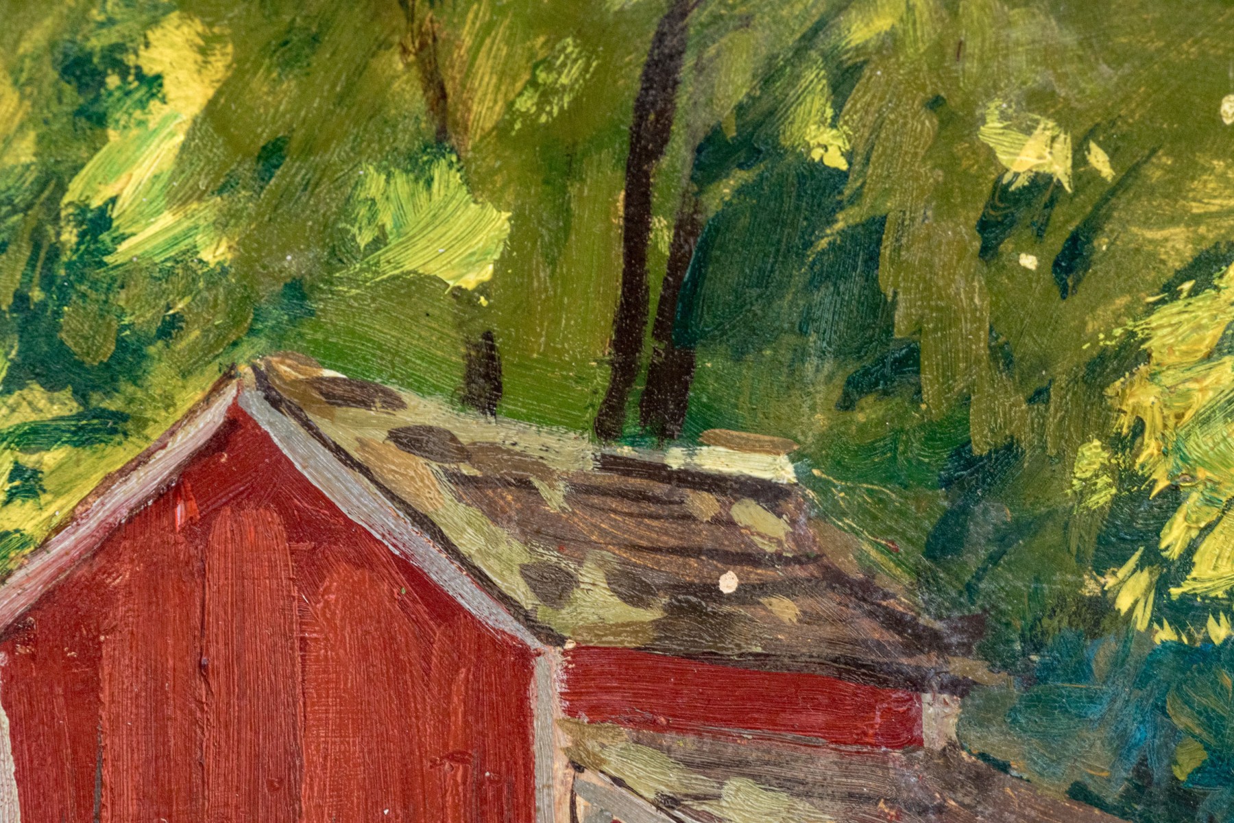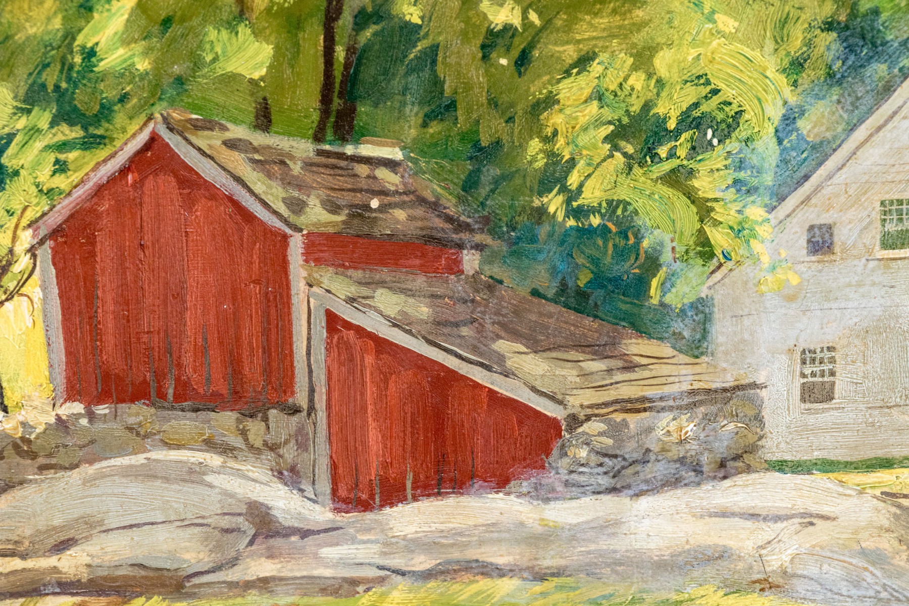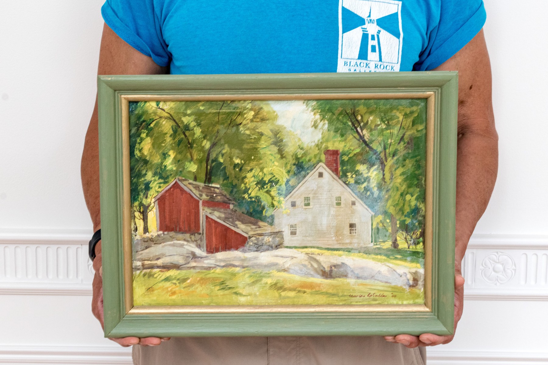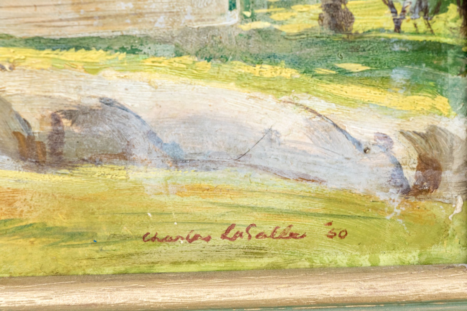 Circa 1950, handsome oil on board depicting farmhouse in woods with barns, signed lower right, Charles LaSalle ‘50. Within a painted wood frame.
