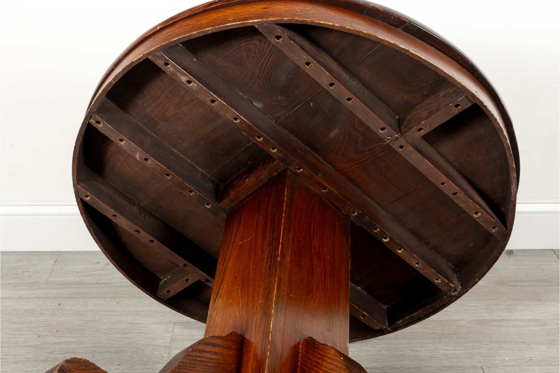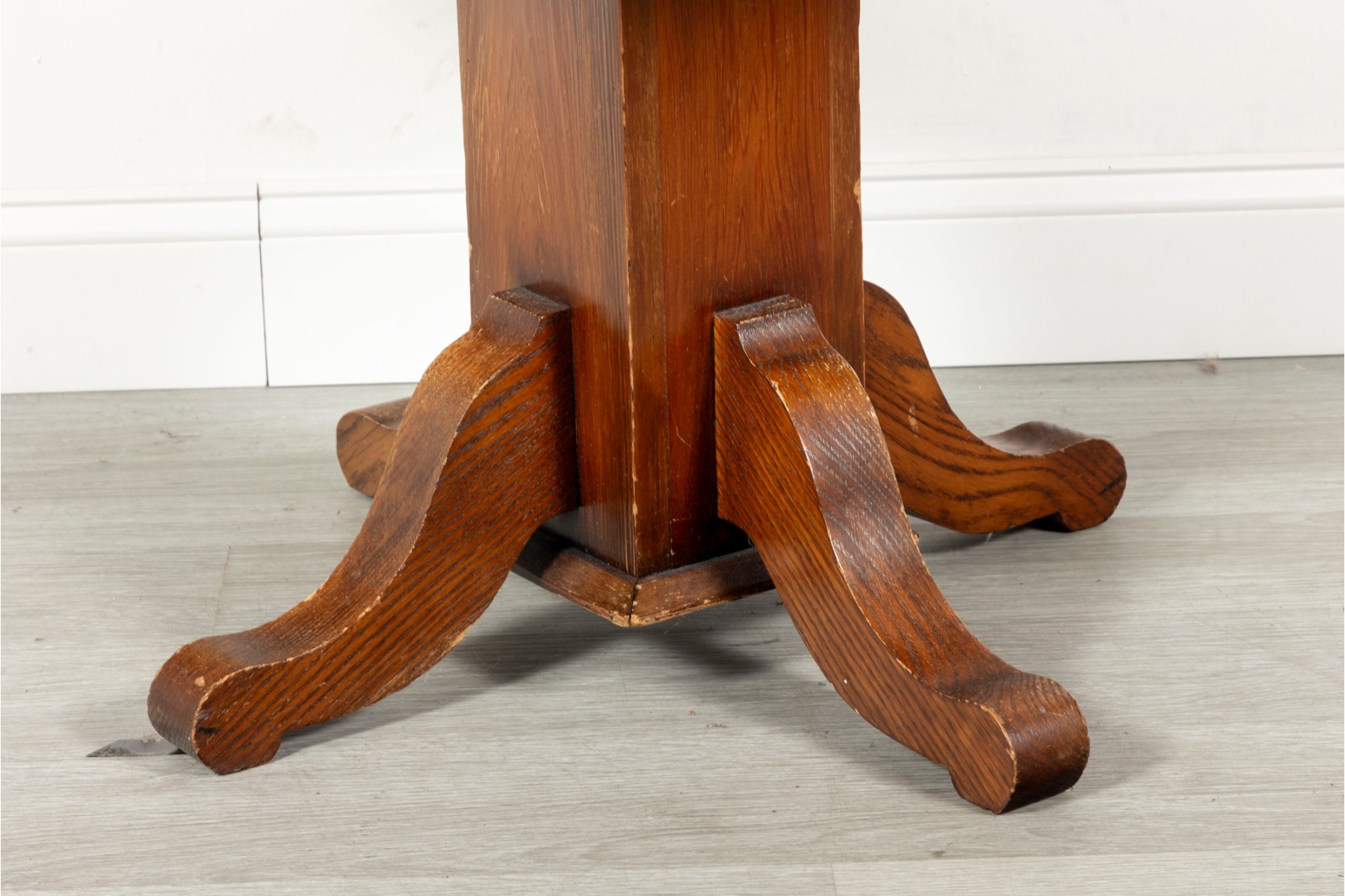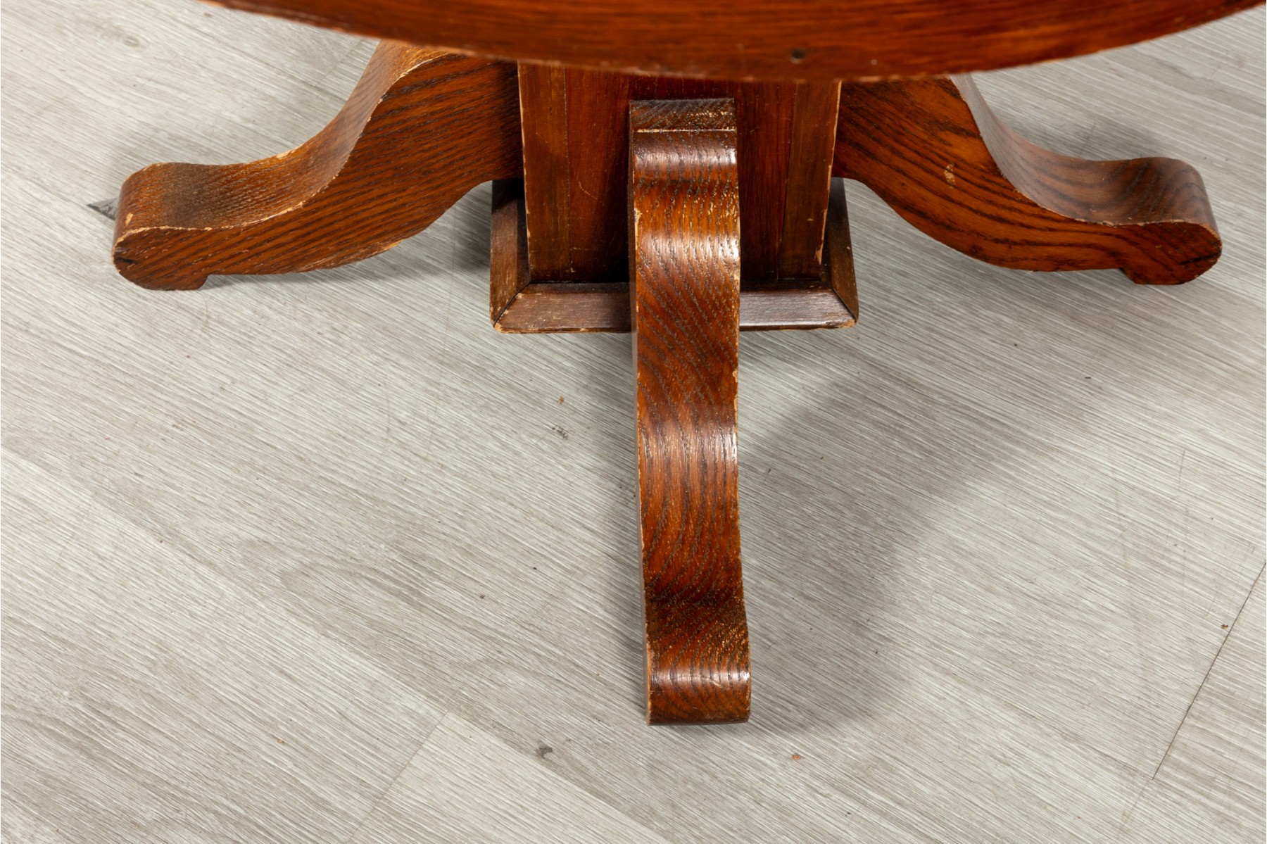 An oak farmhouse-style round coffee table with a square pedestal base supported on four scrolled legs.
