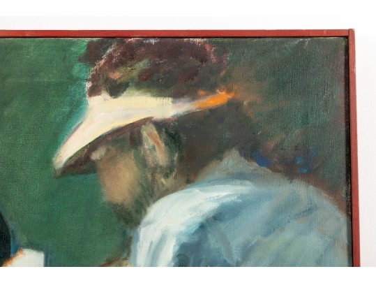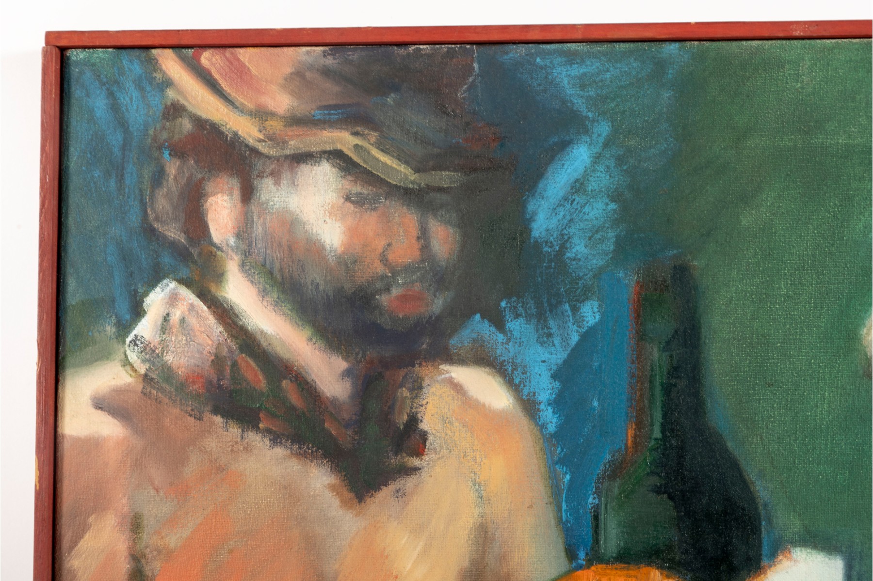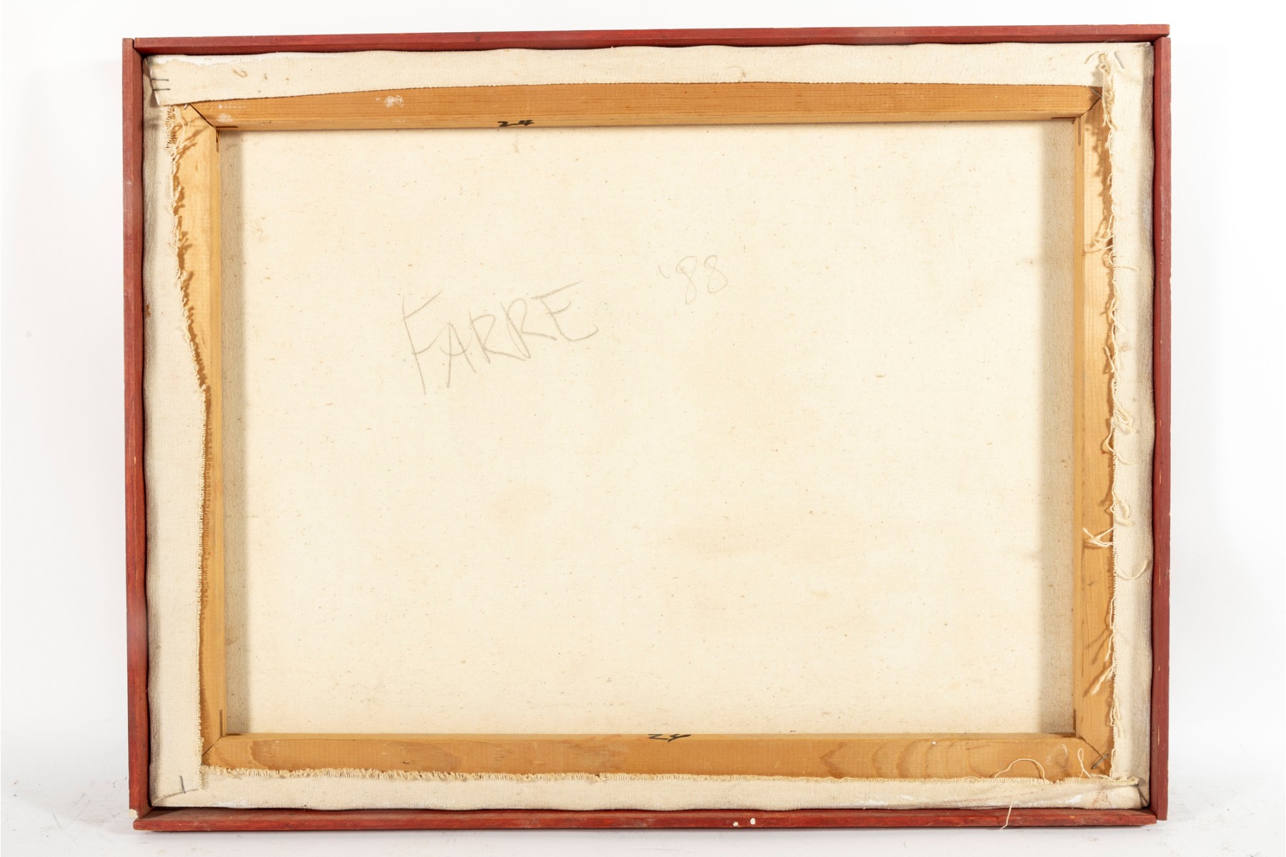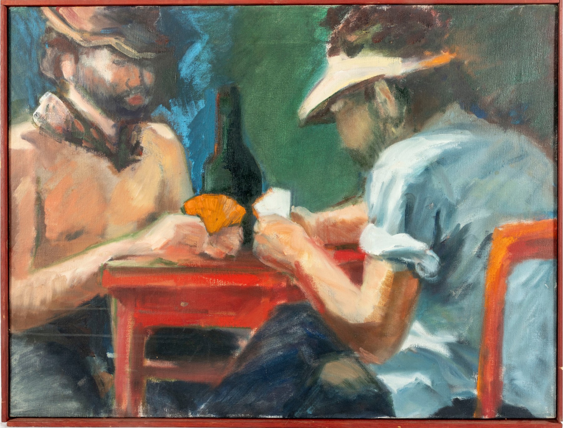 A vintage oil on canvas painting depicting to western men playing cards. En verso, the painting is signed "Farre" — unknown artist, dated 1988. The piece is presented openly within a simple wood frame, painted red.