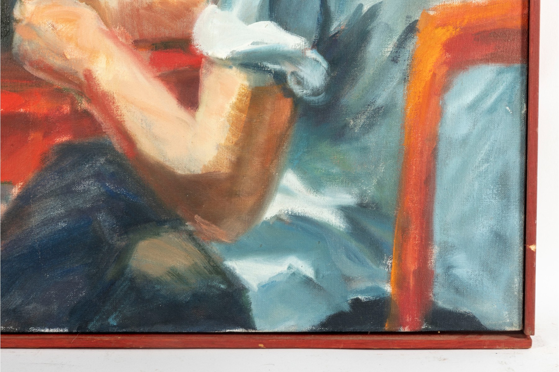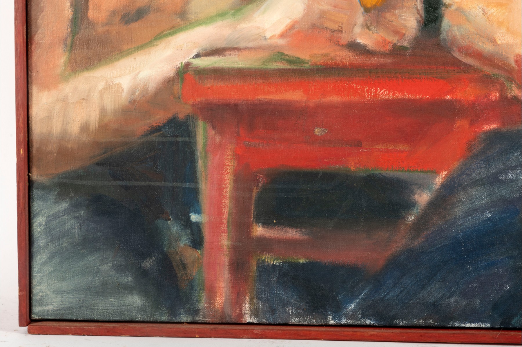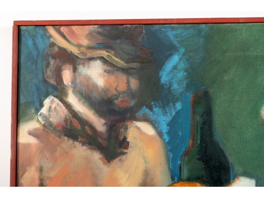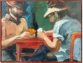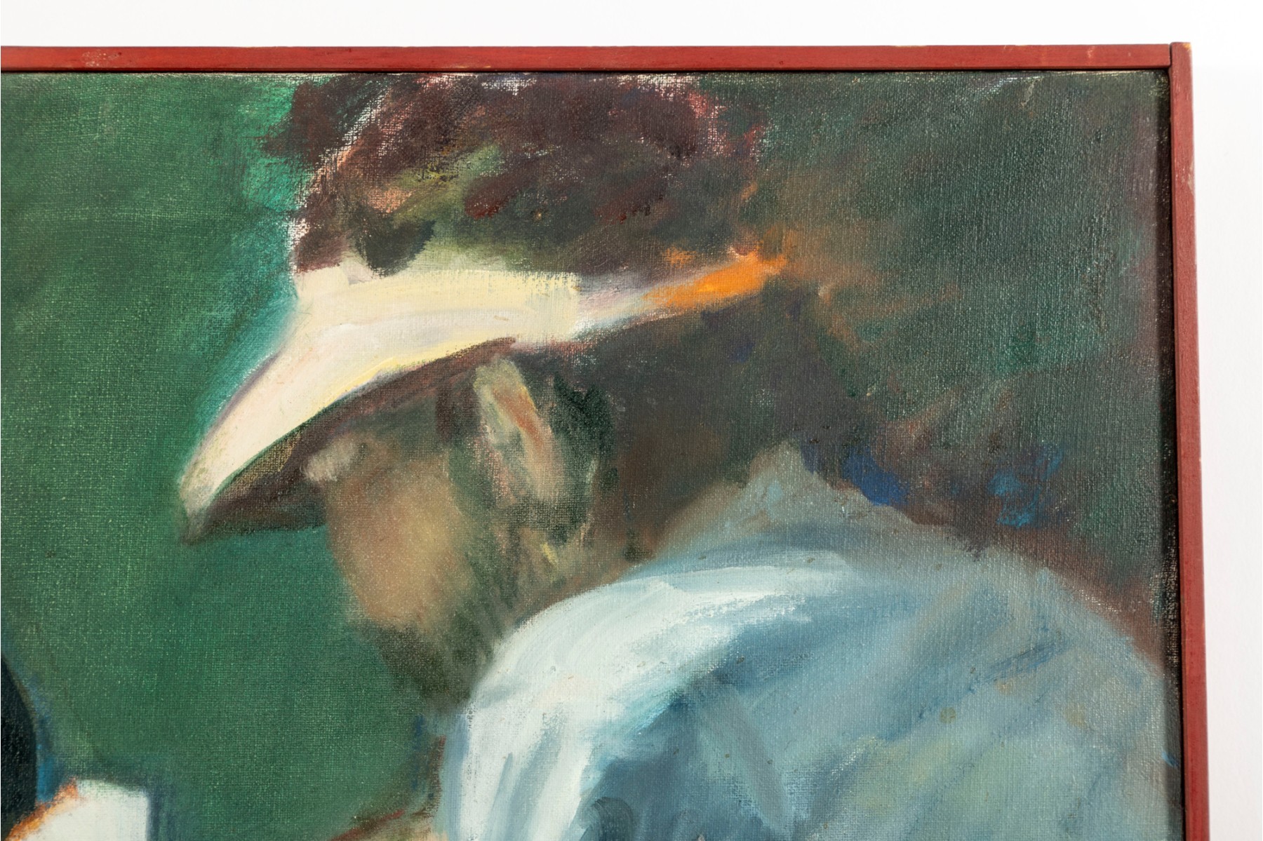 A vintage oil on canvas painting depicting to western men playing cards. En verso, the painting is signed "Farre" — unknown artist, dated 1988. The piece is presented openly within a simple wood frame, painted red.