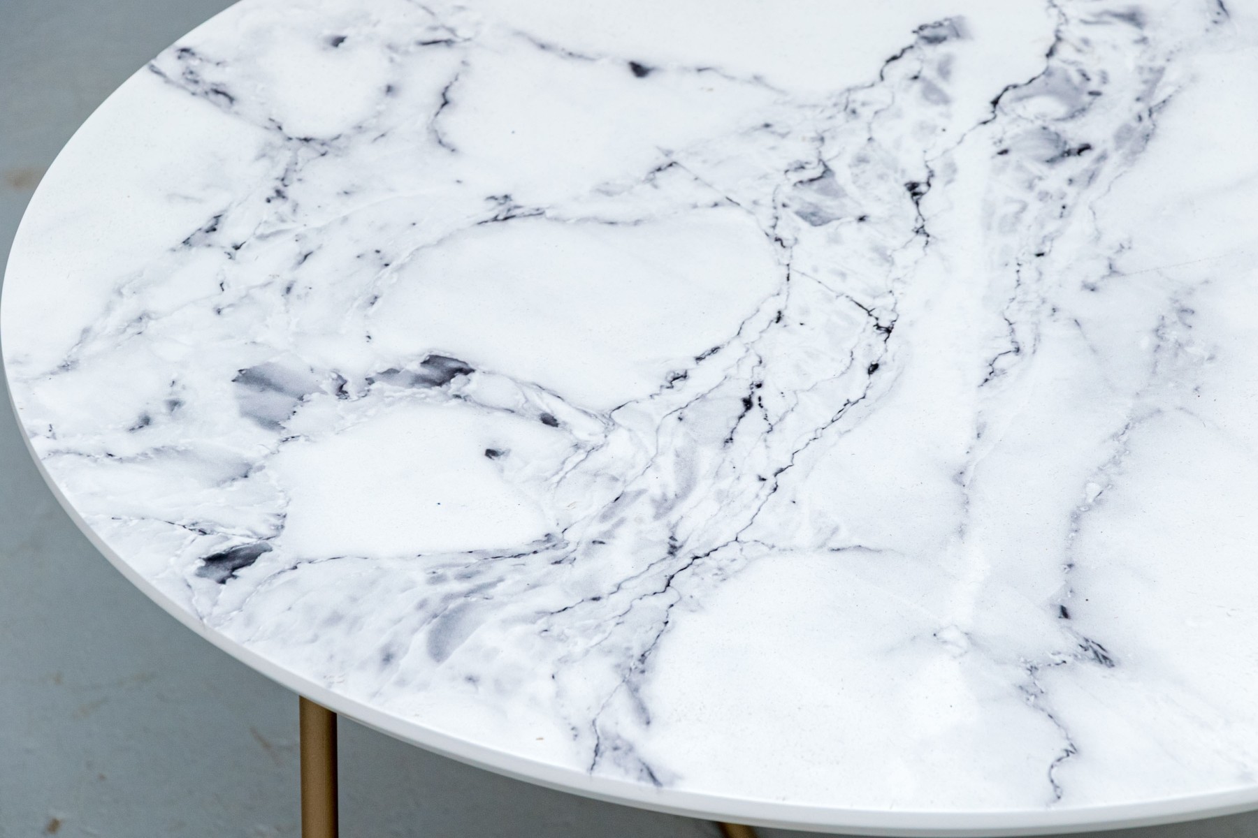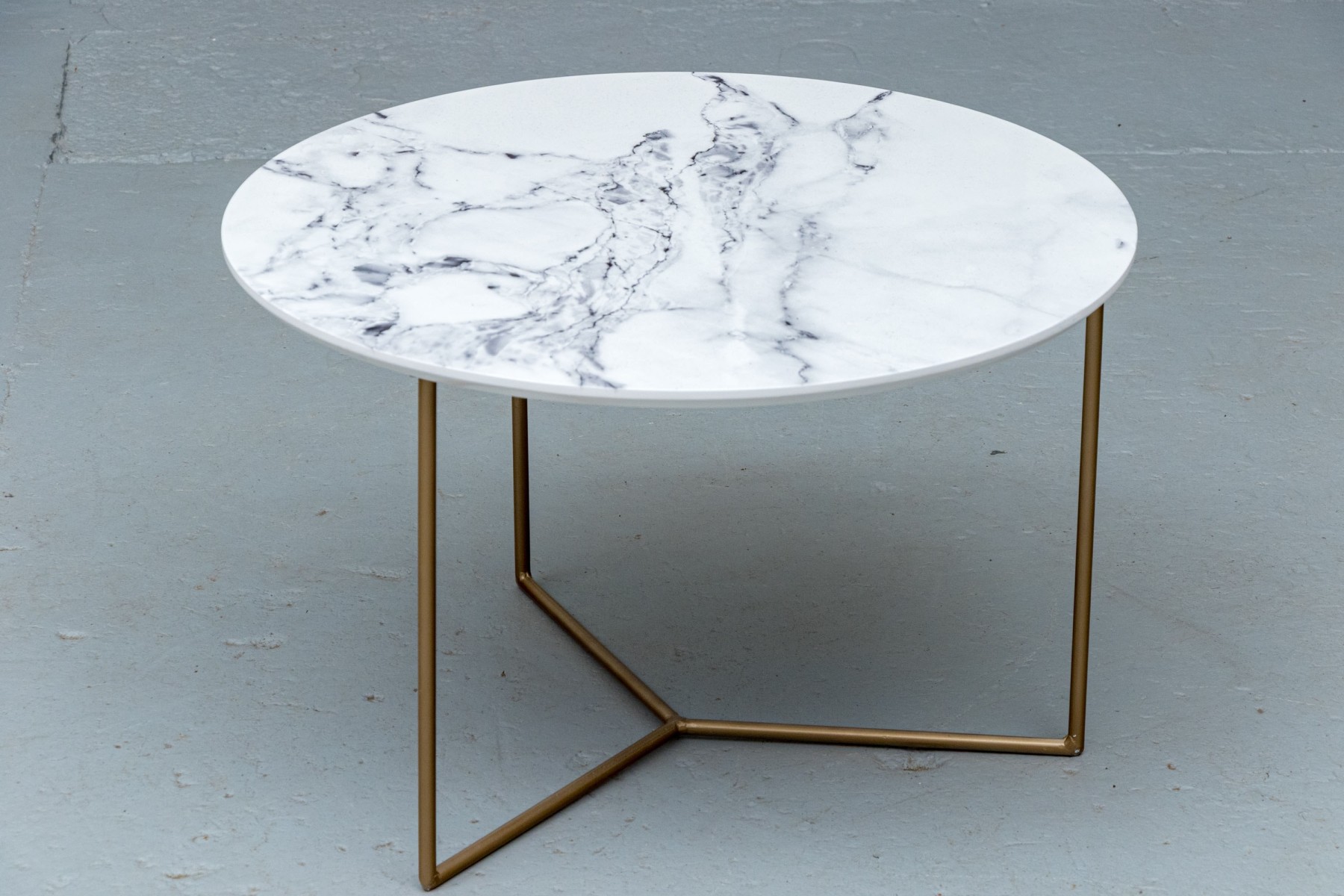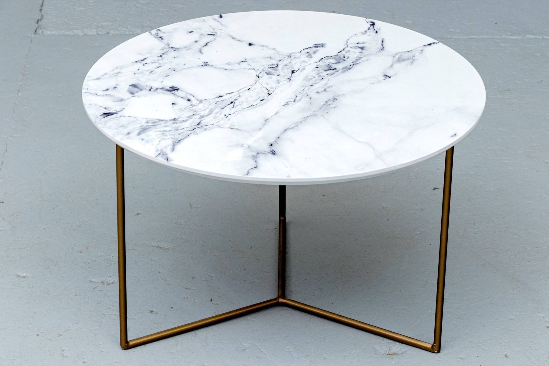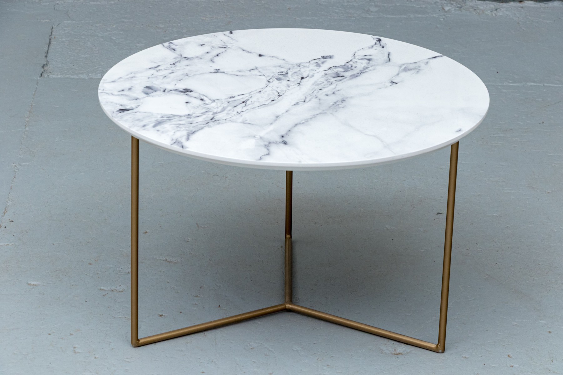 On three brass finished supports with peace sign form stretcher supports with faux marble circular table top.