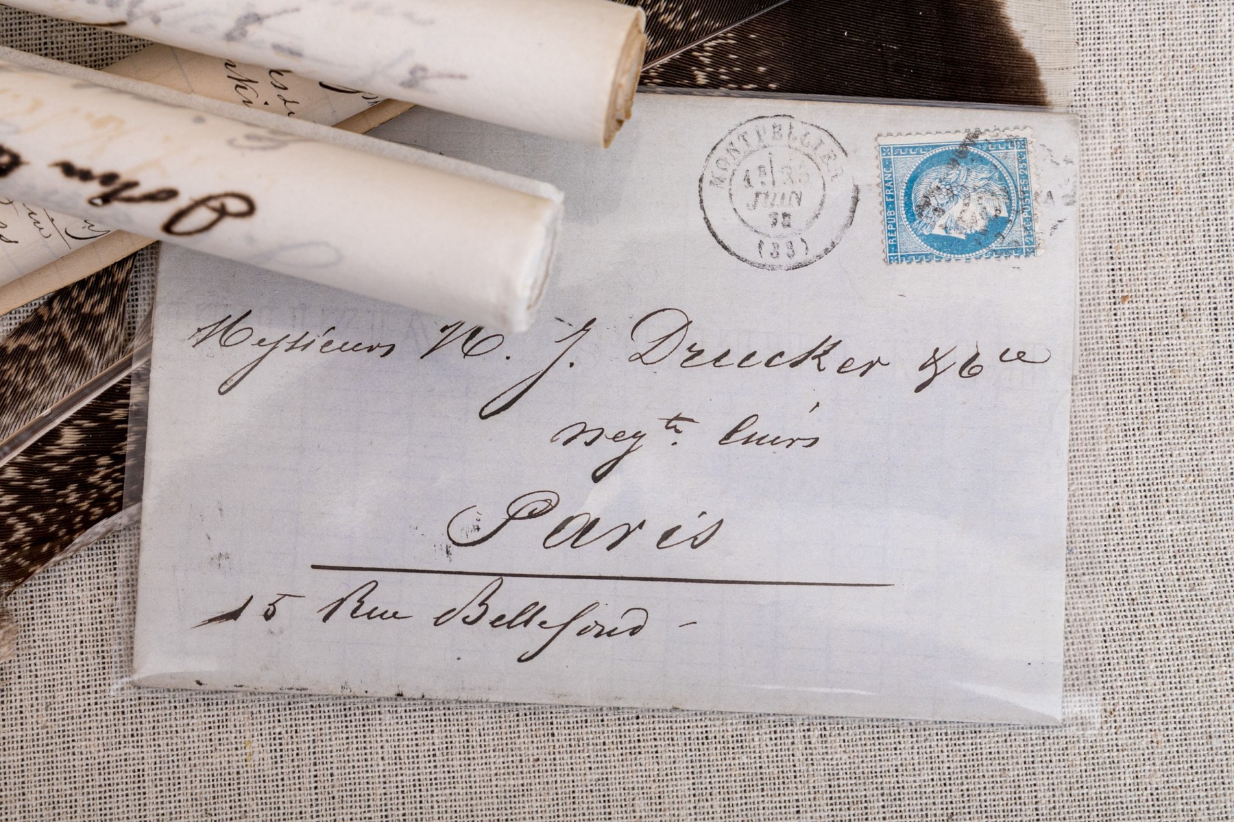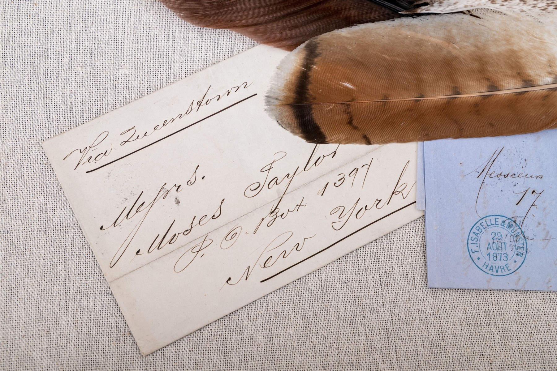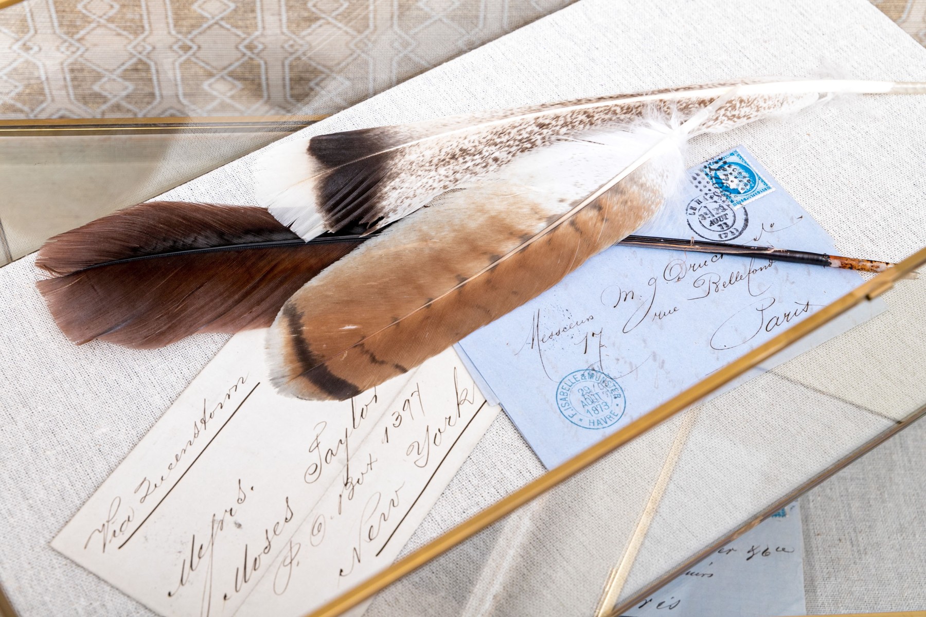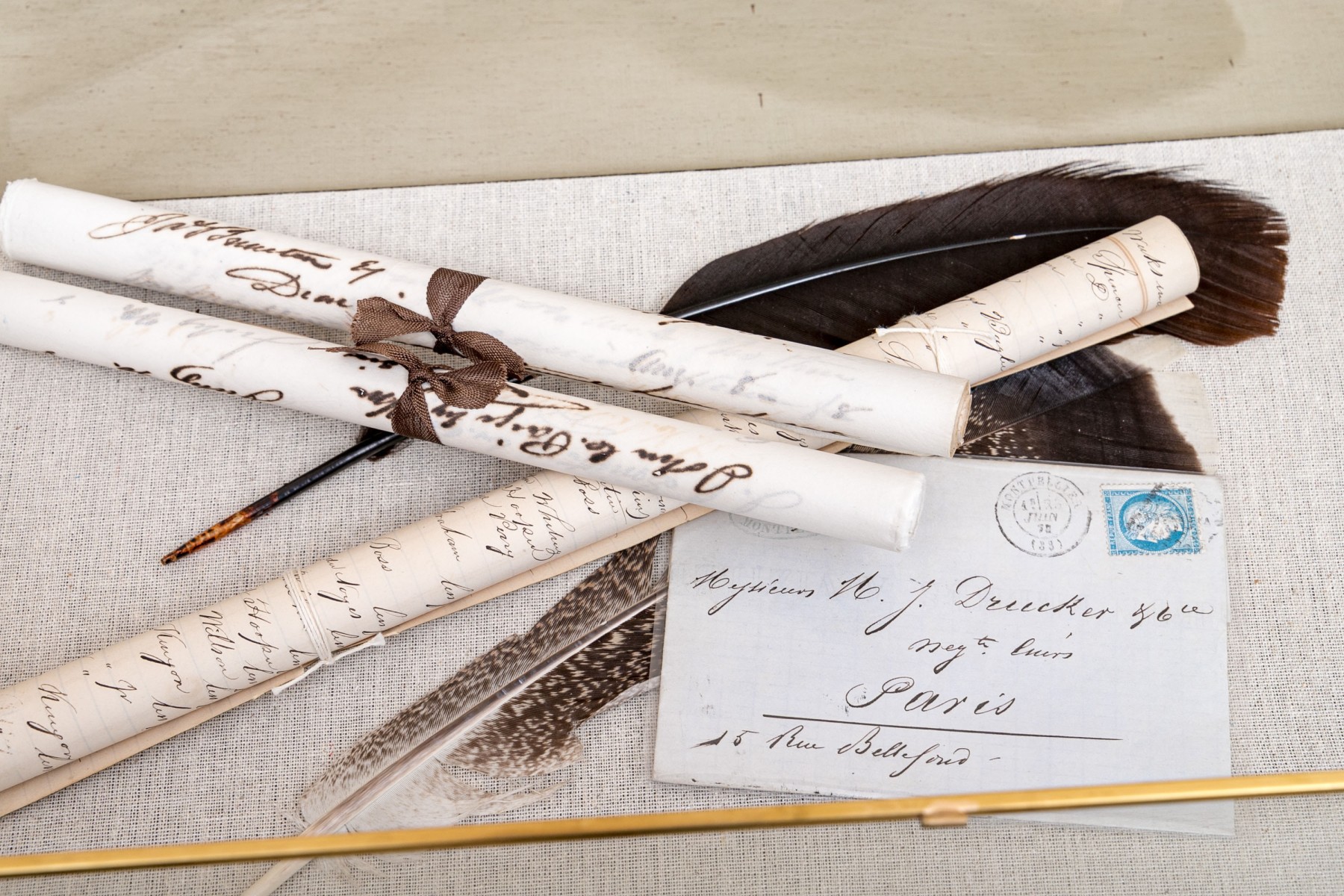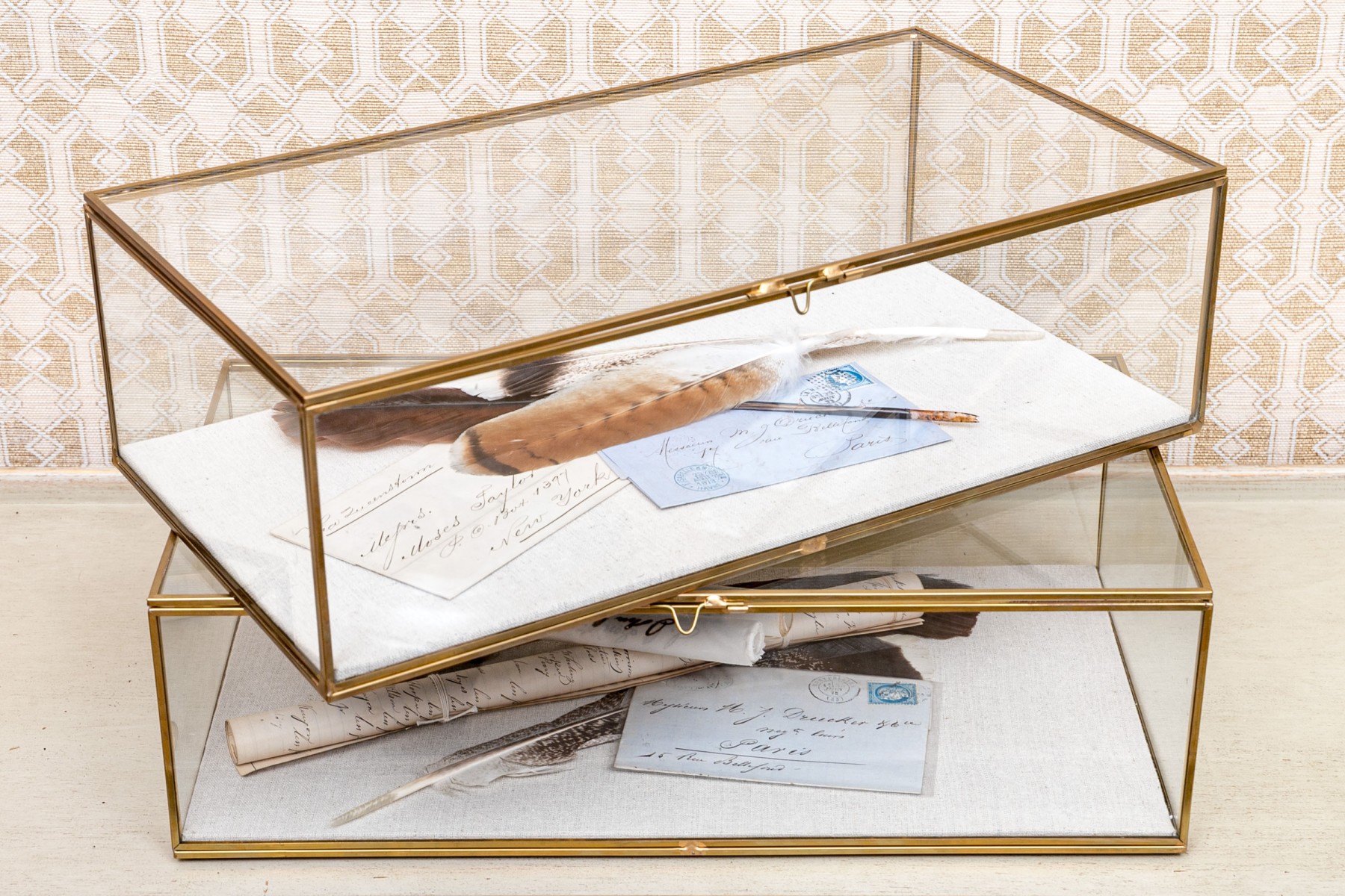 19th Century letters and other objet's d'art glass and brass boxes.