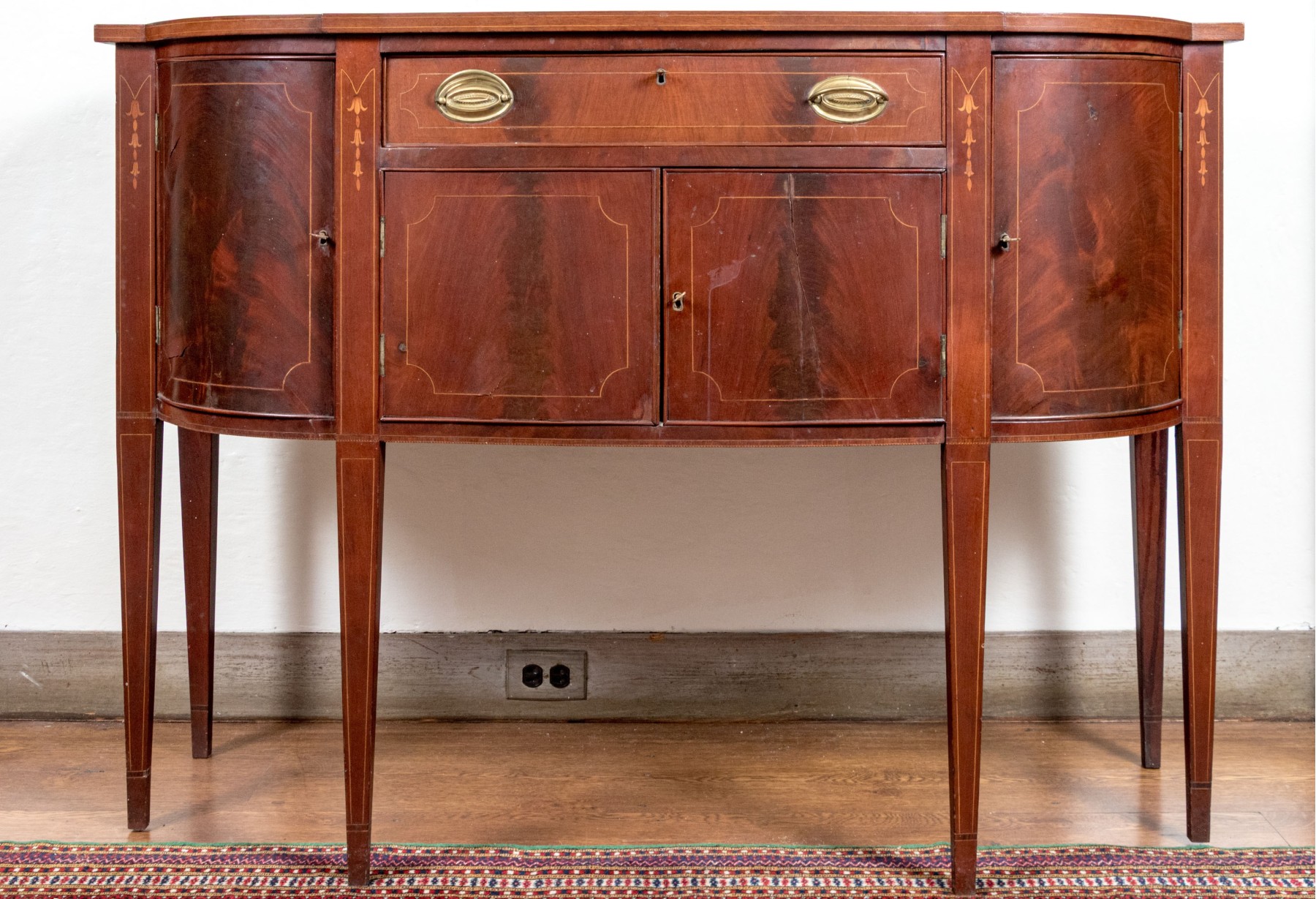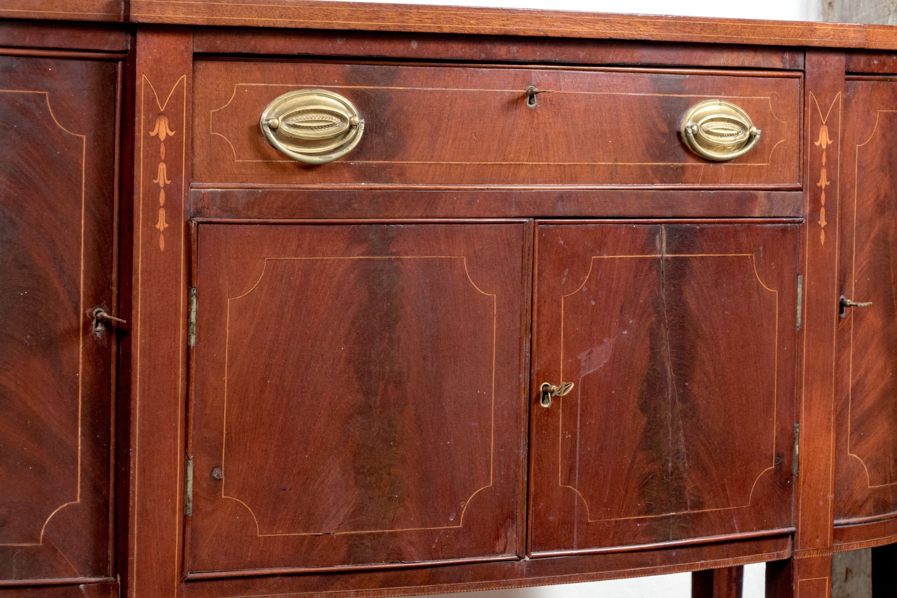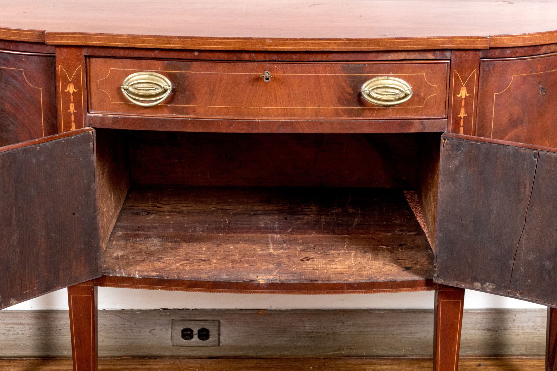 A gorgeous classic Federal sideboard, showcasing a bowfront form veneered in beautifully figured red-brown mahogany and detailed with shoestring inlaid borders. The sideboard features rounded cabinet doors on either side of a central single drawer and double door cabinet. Raised on straight, tapered legs.