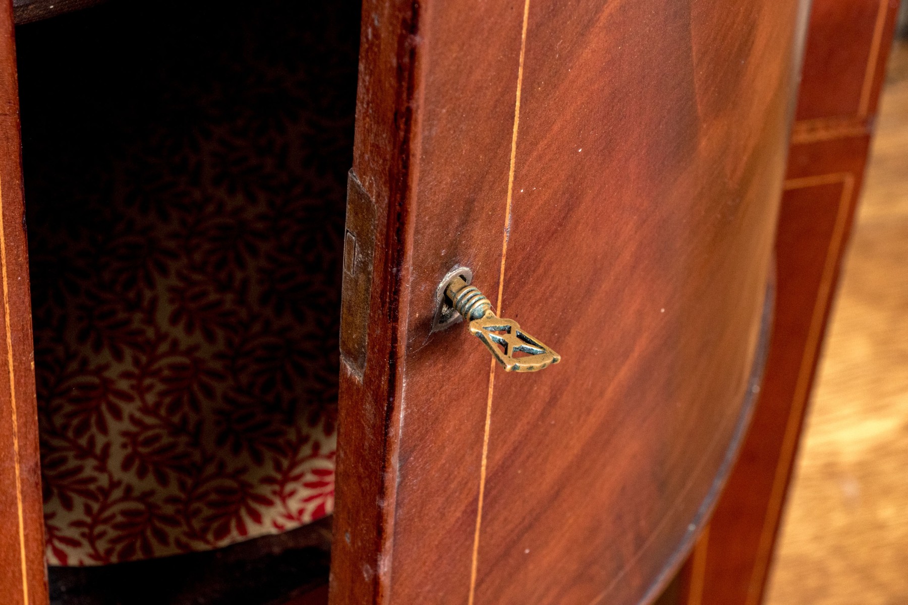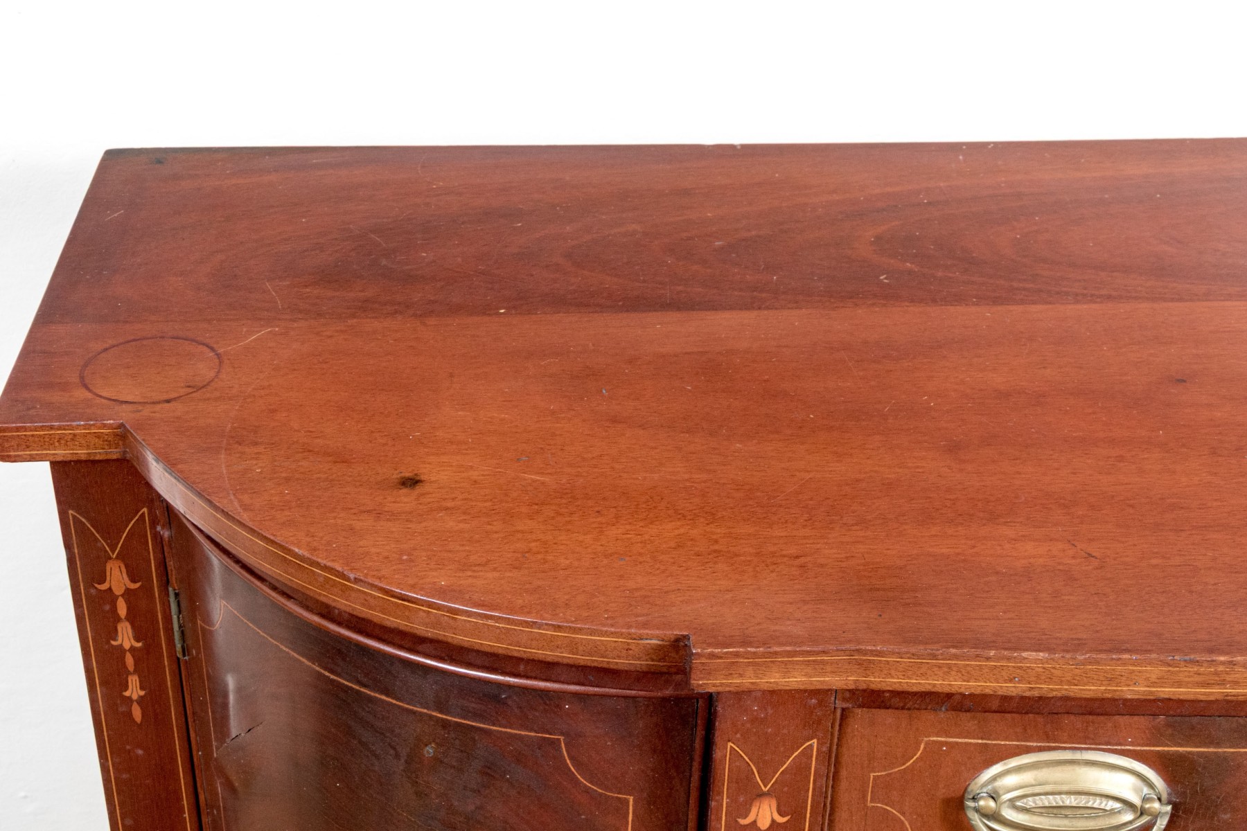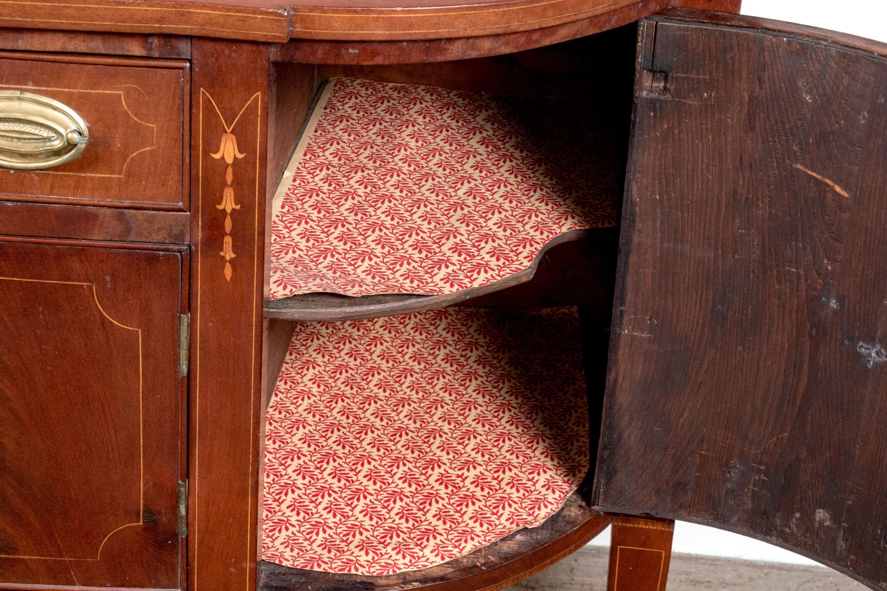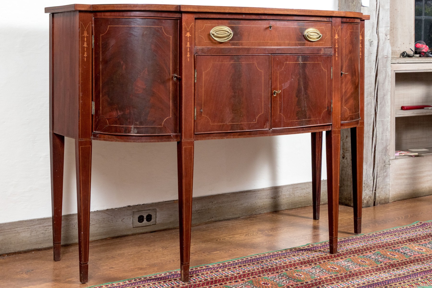 A gorgeous classic Federal sideboard, showcasing a bowfront form veneered in beautifully figured red-brown mahogany and detailed with shoestring inlaid borders. The sideboard features rounded cabinet doors on either side of a central single drawer and double door cabinet. Raised on straight, tapered legs.