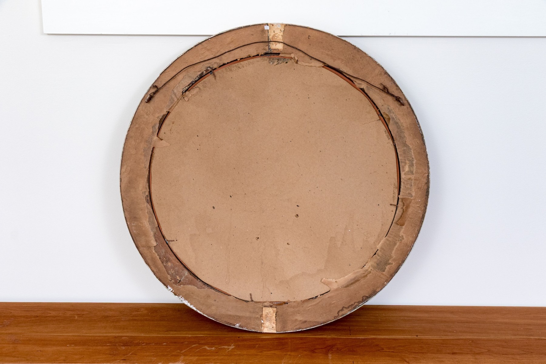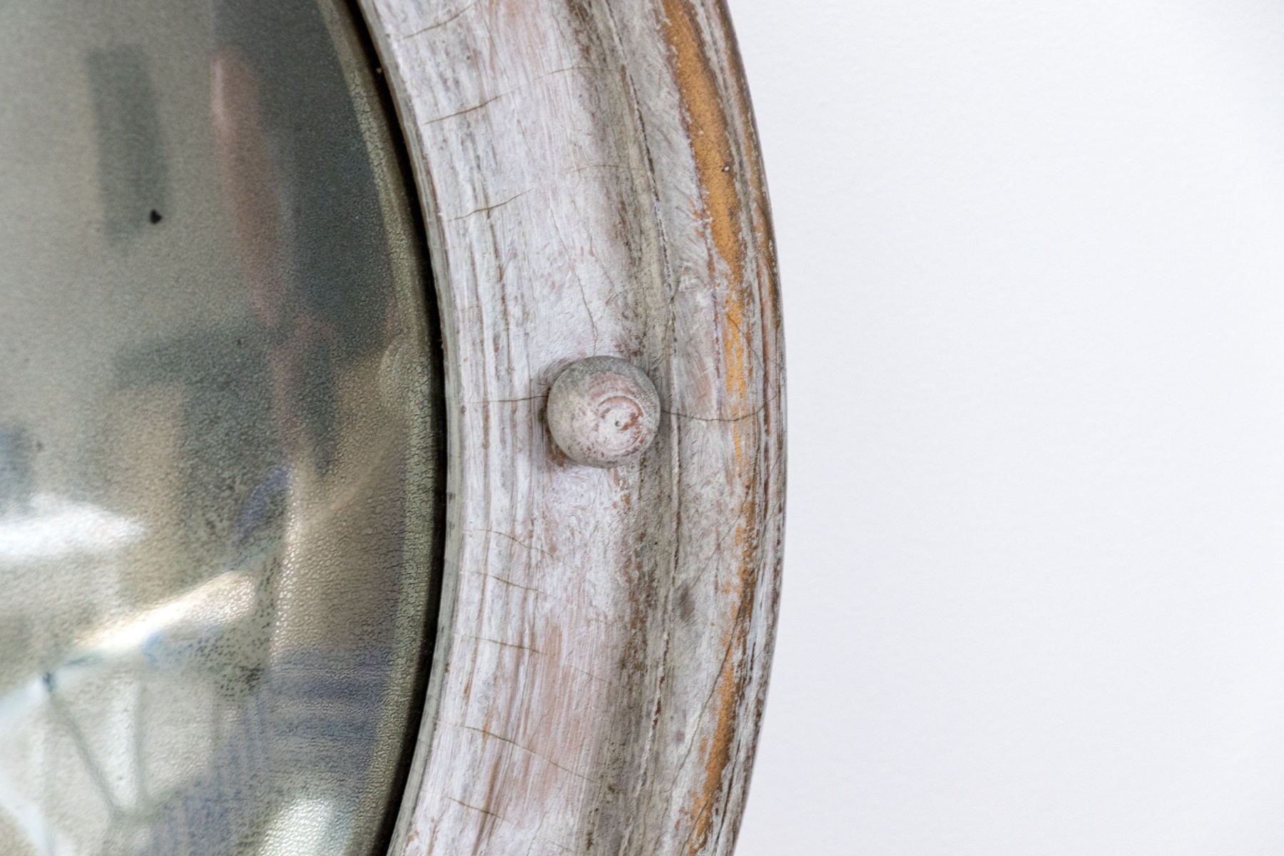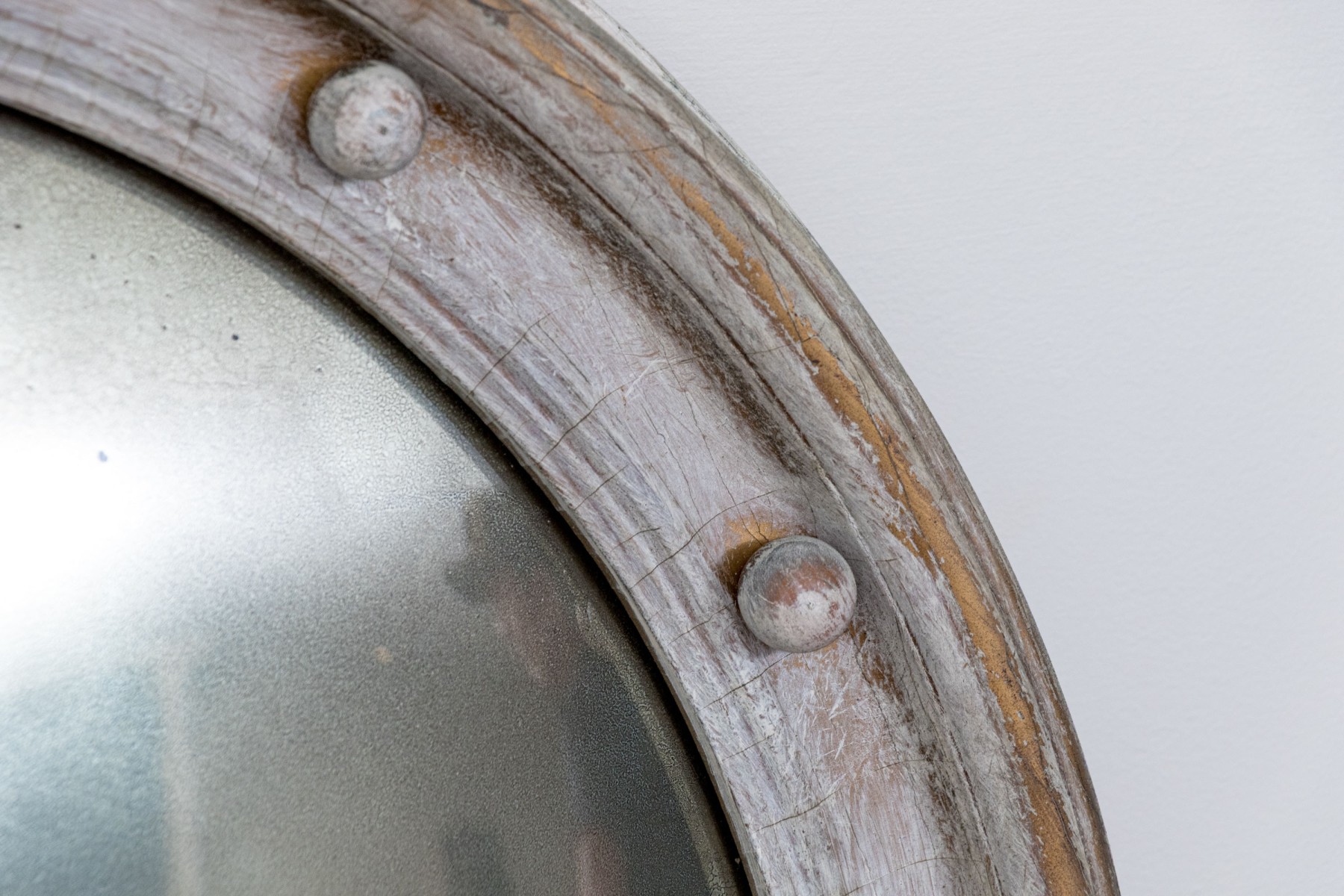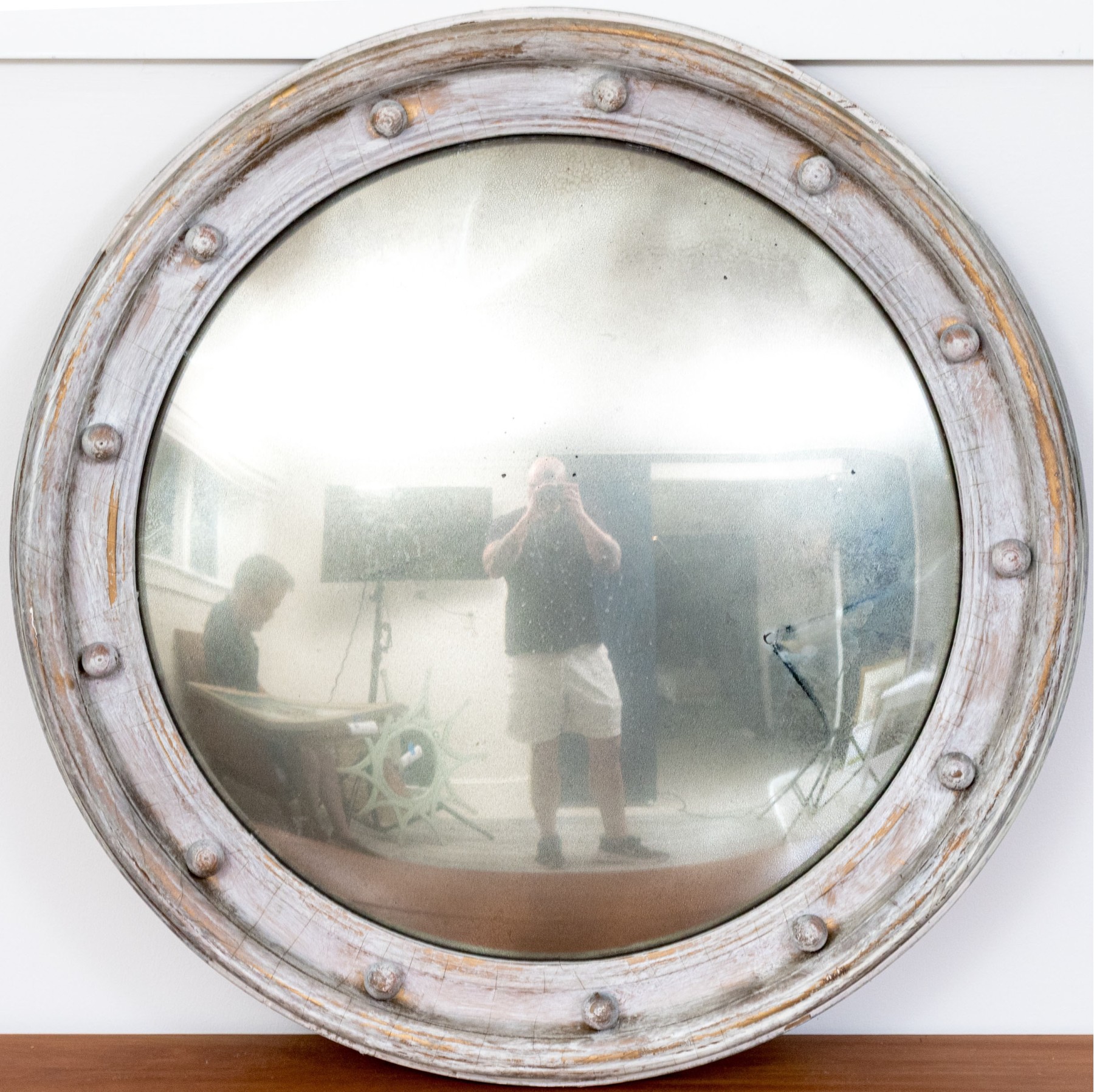 A handsome convex mirror with a classic Federal style in a rustic silvered finish for a touch of industrial chic porthole inspiration. The bullseye mirror features a convex form with a beaded trim on the frame.