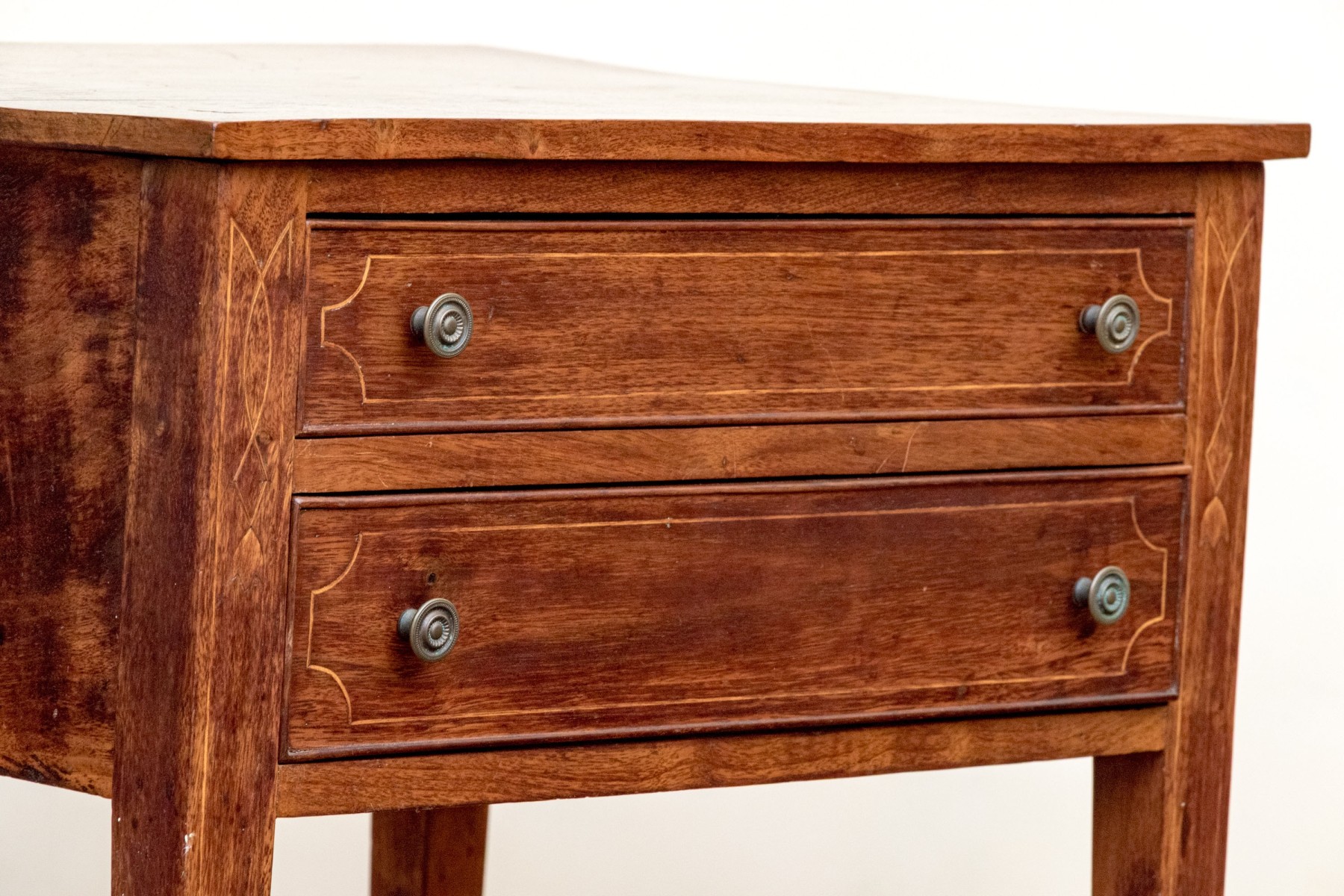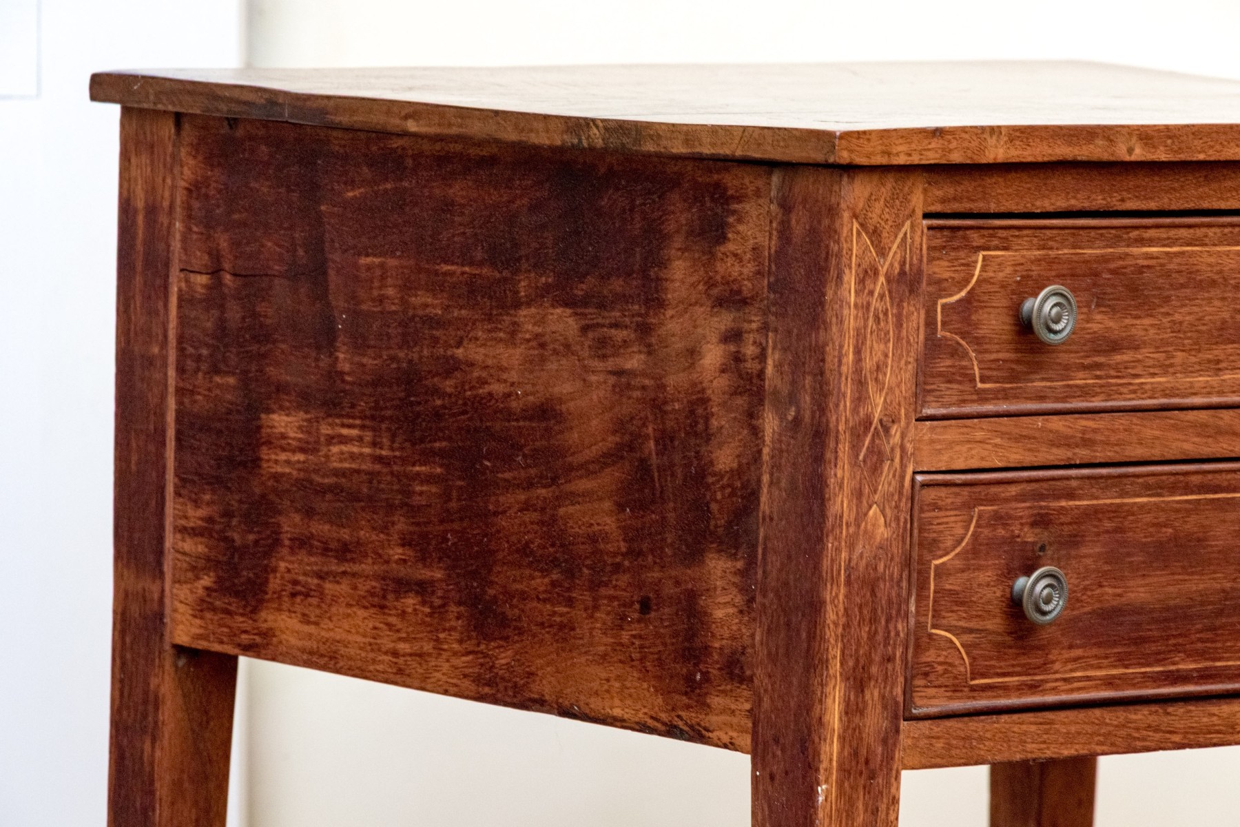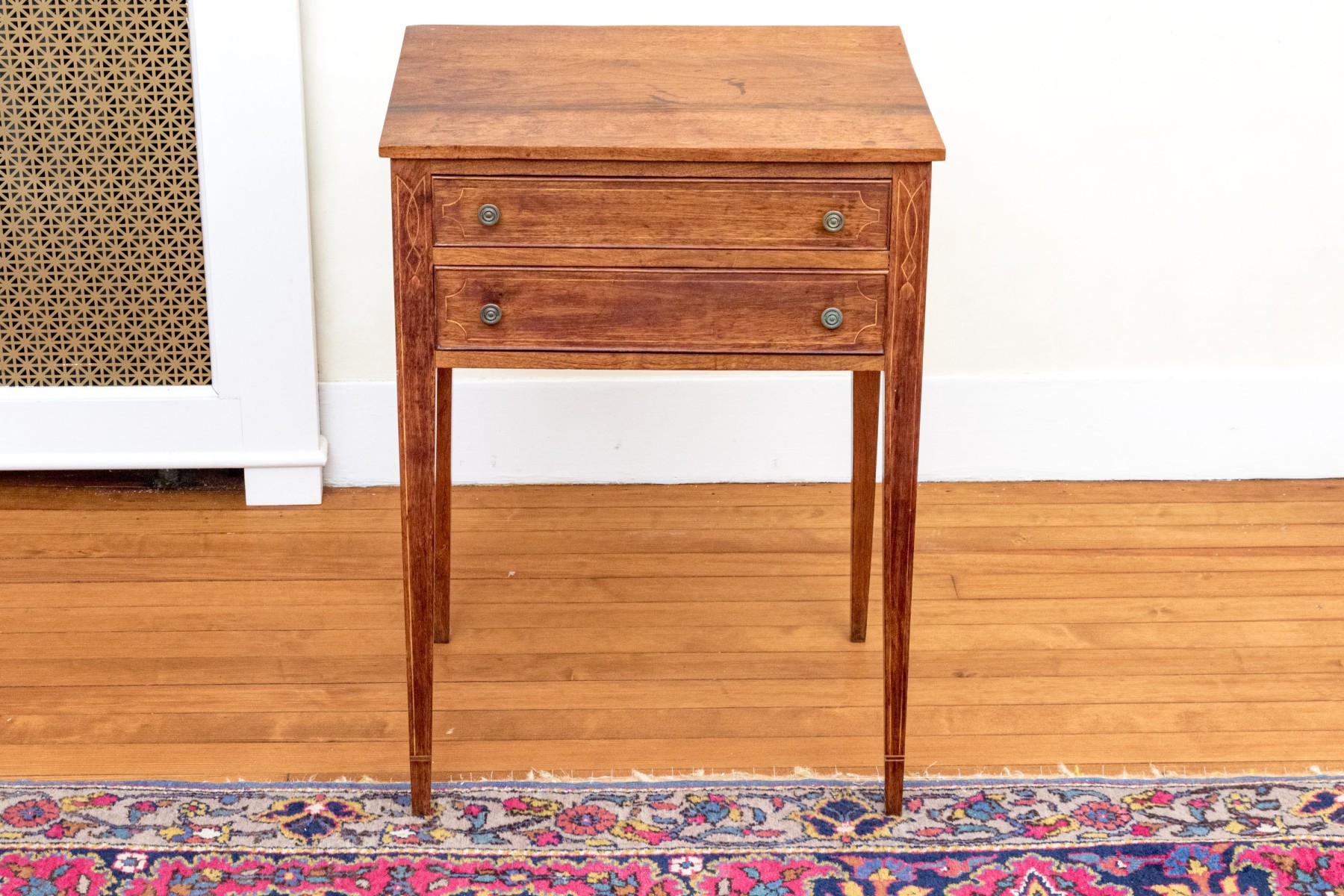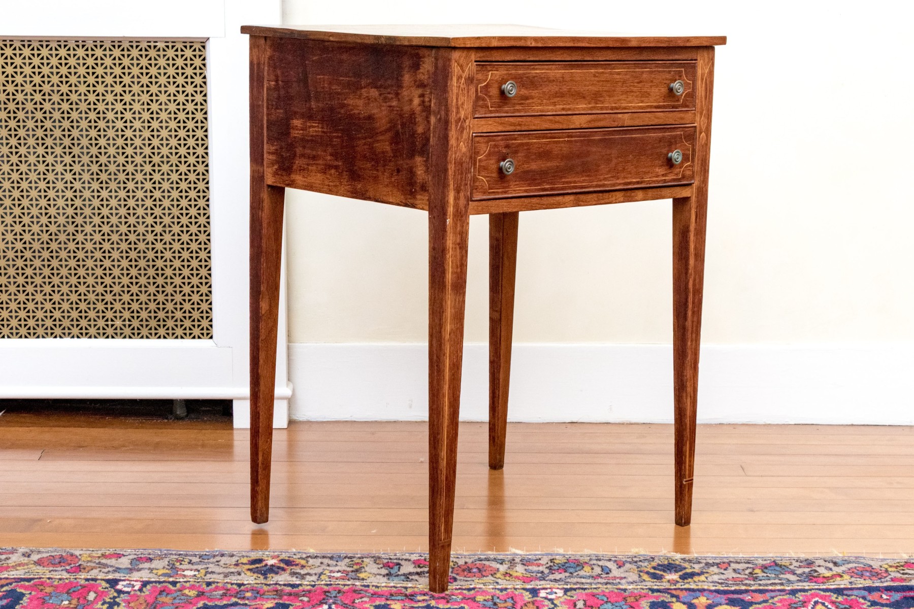 A lovely antique bedside end table exuding sleek Federal charm with a simple square top over two drawers detailed with string inlays and small double knob handles. Raised on simple, straight tapered legs.