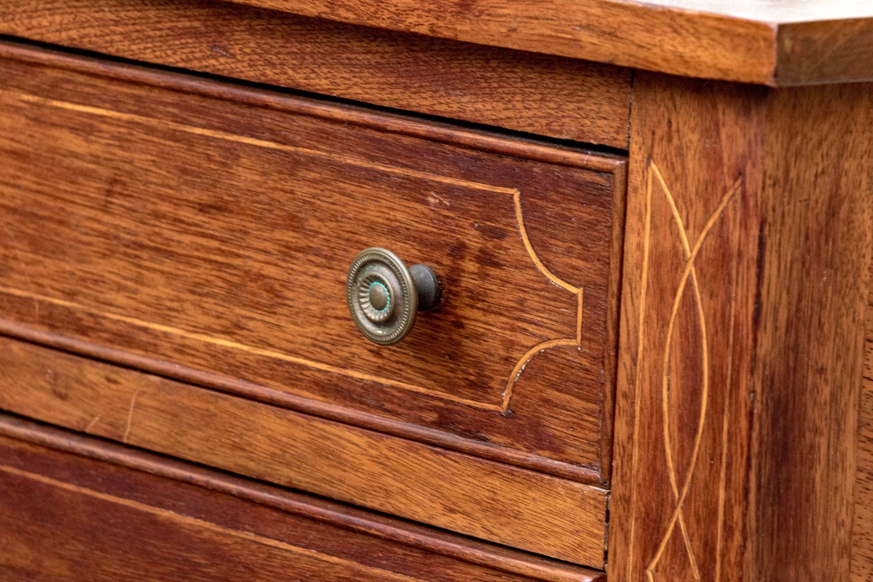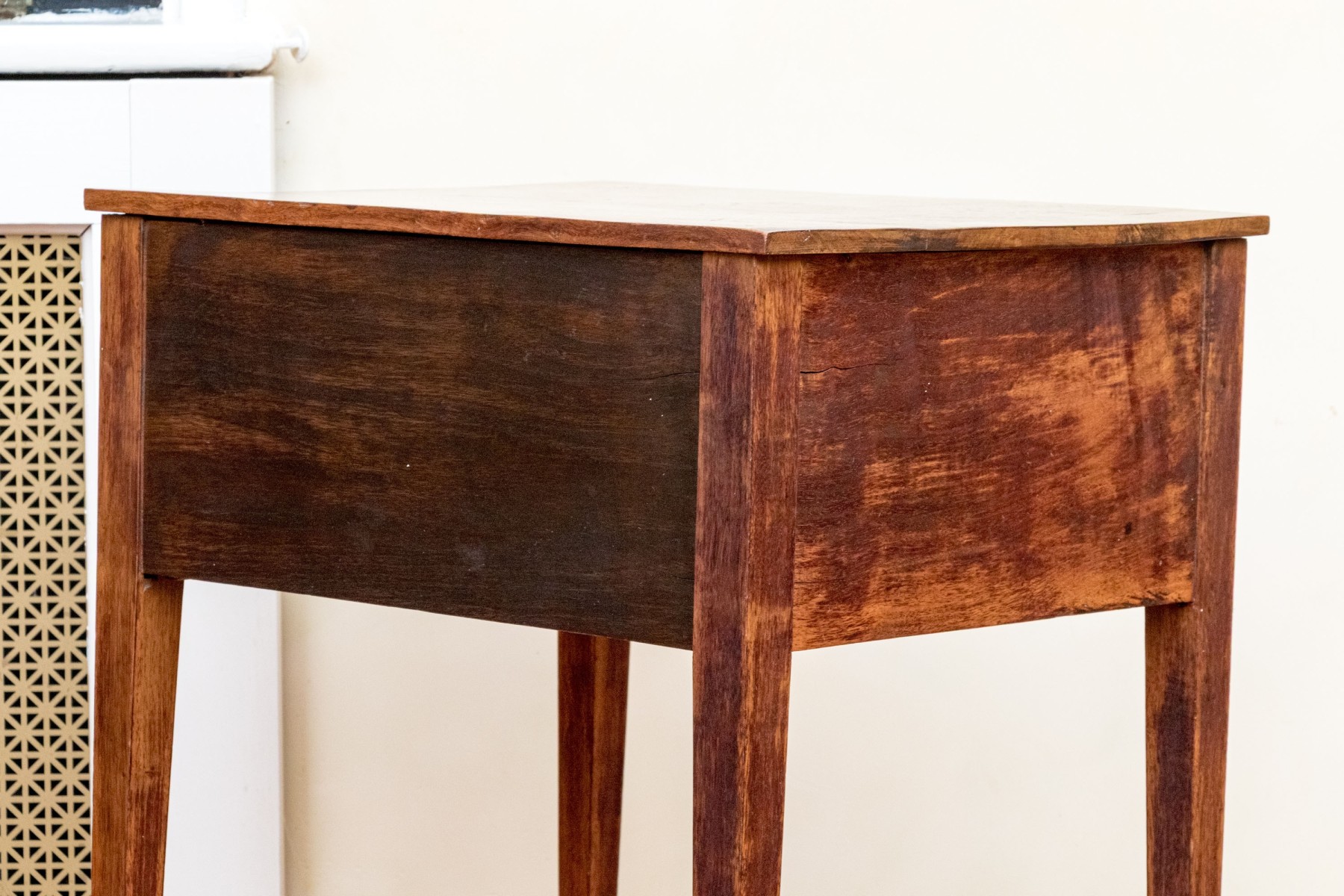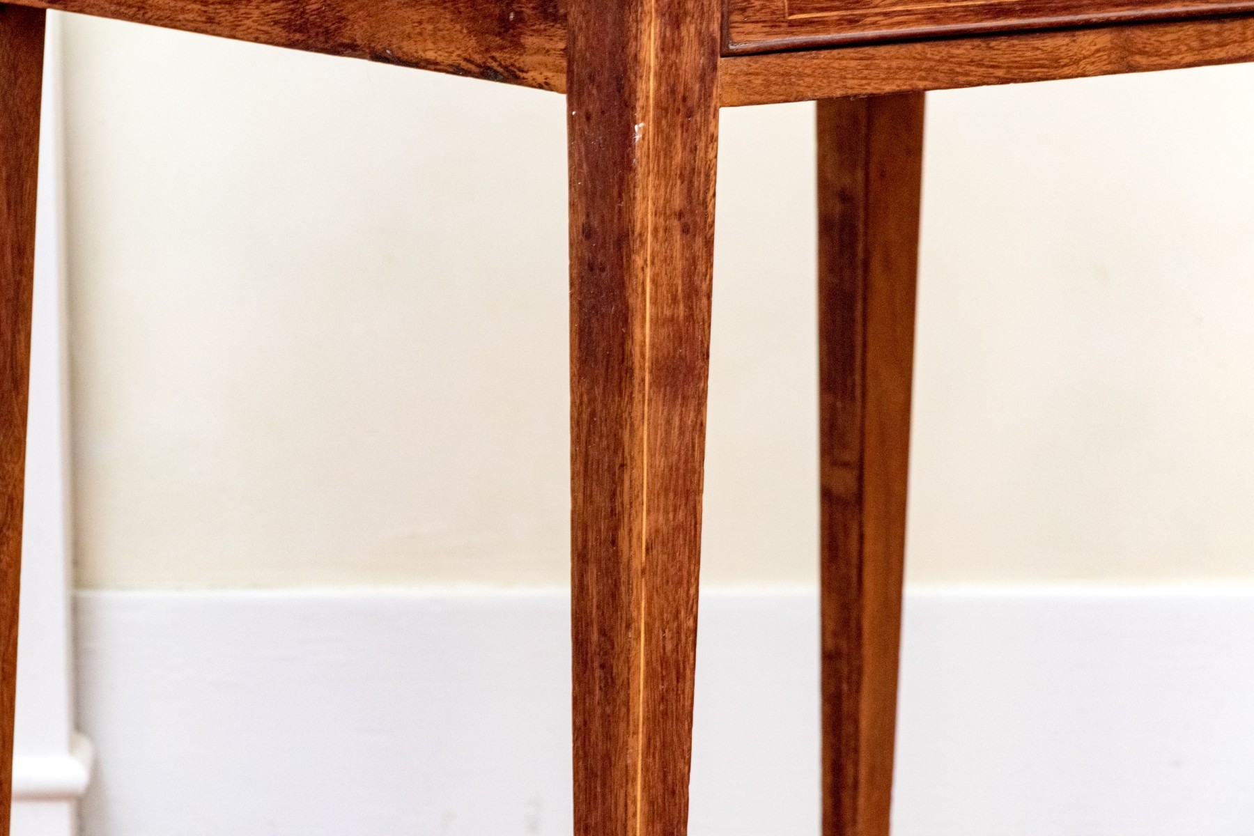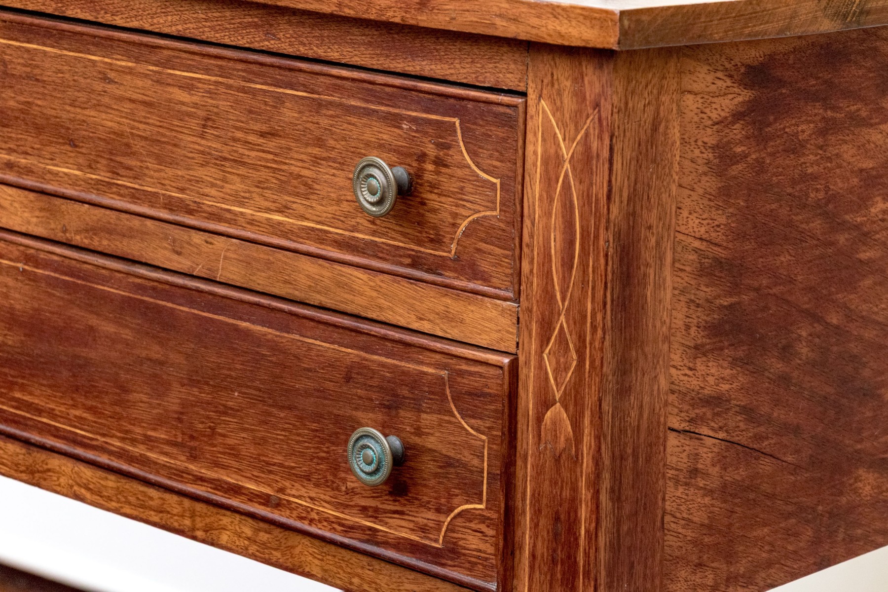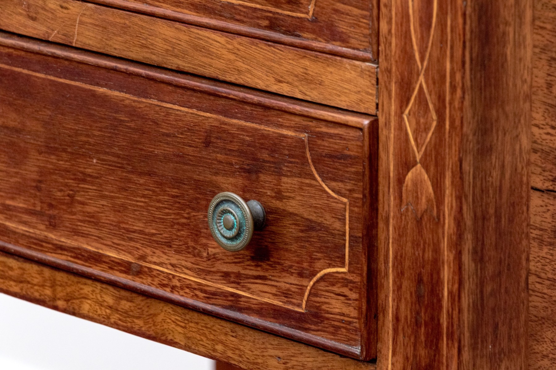A lovely antique bedside end table exuding sleek Federal charm with a simple square top over two drawers detailed with string inlays and small double knob handles. Raised on simple, straight tapered legs.