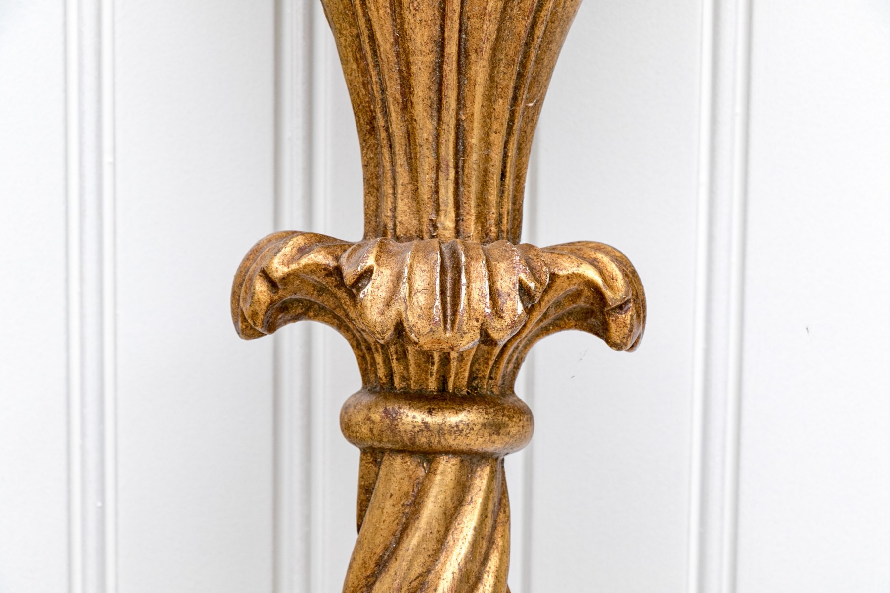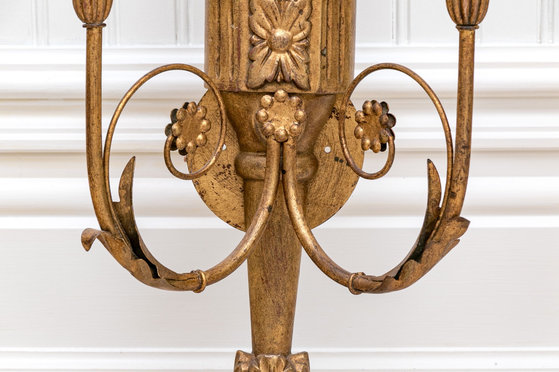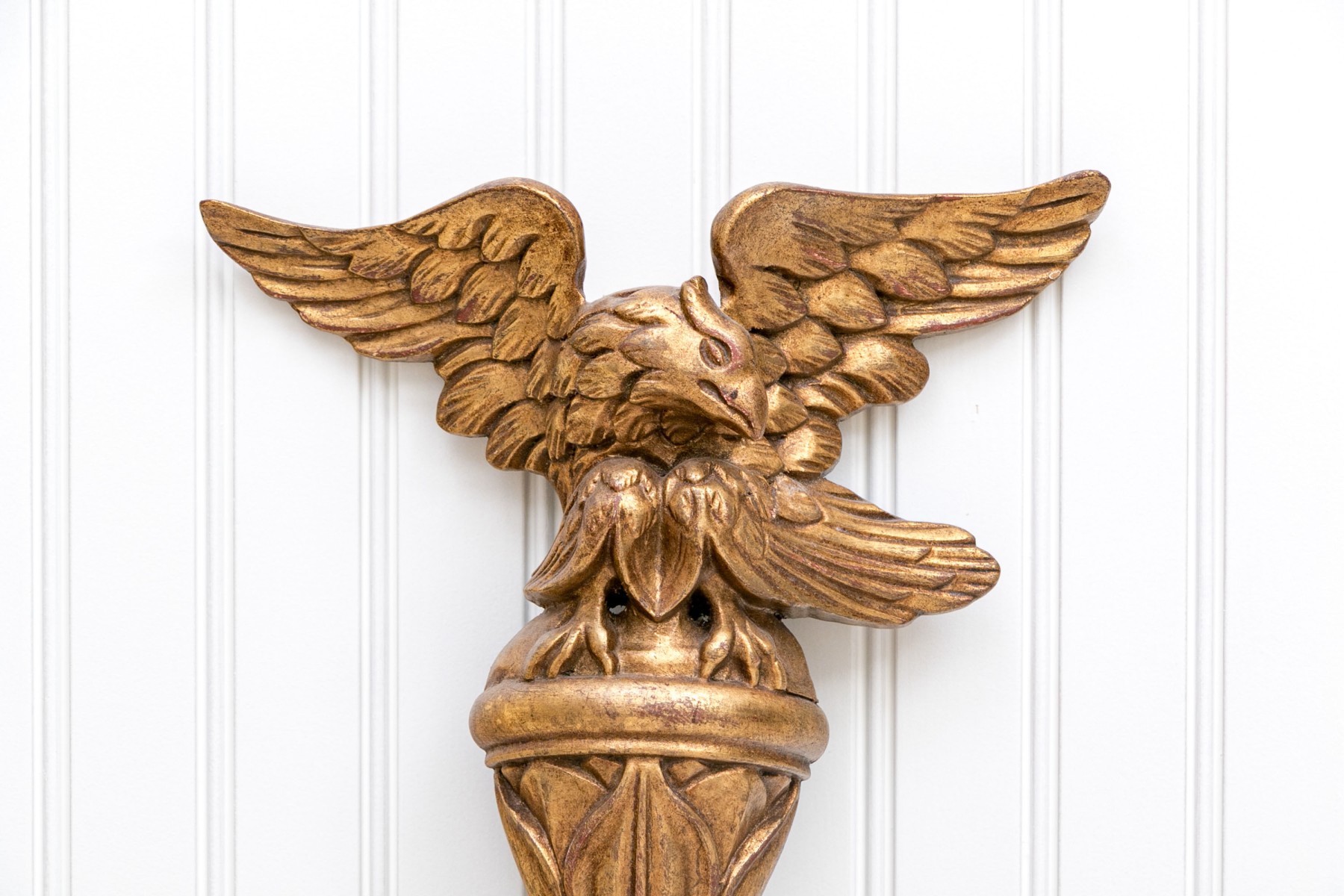 Federal style opposing eagle gilt twin-light wall sconces. Tall twin-light wall sconces in the Federal style, now electrified. Each sconce features two arms, with an opposing eagle finial positioned above a barley twist design standard, embellished with floral and waterleaf motifs. Finished in an antiqued gilt finish.