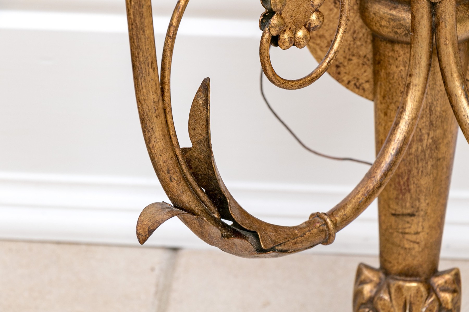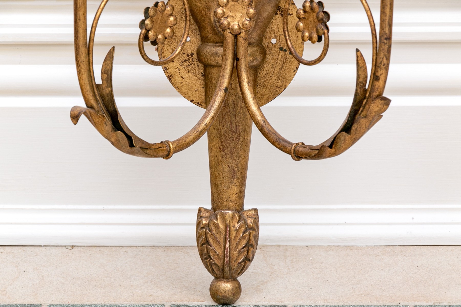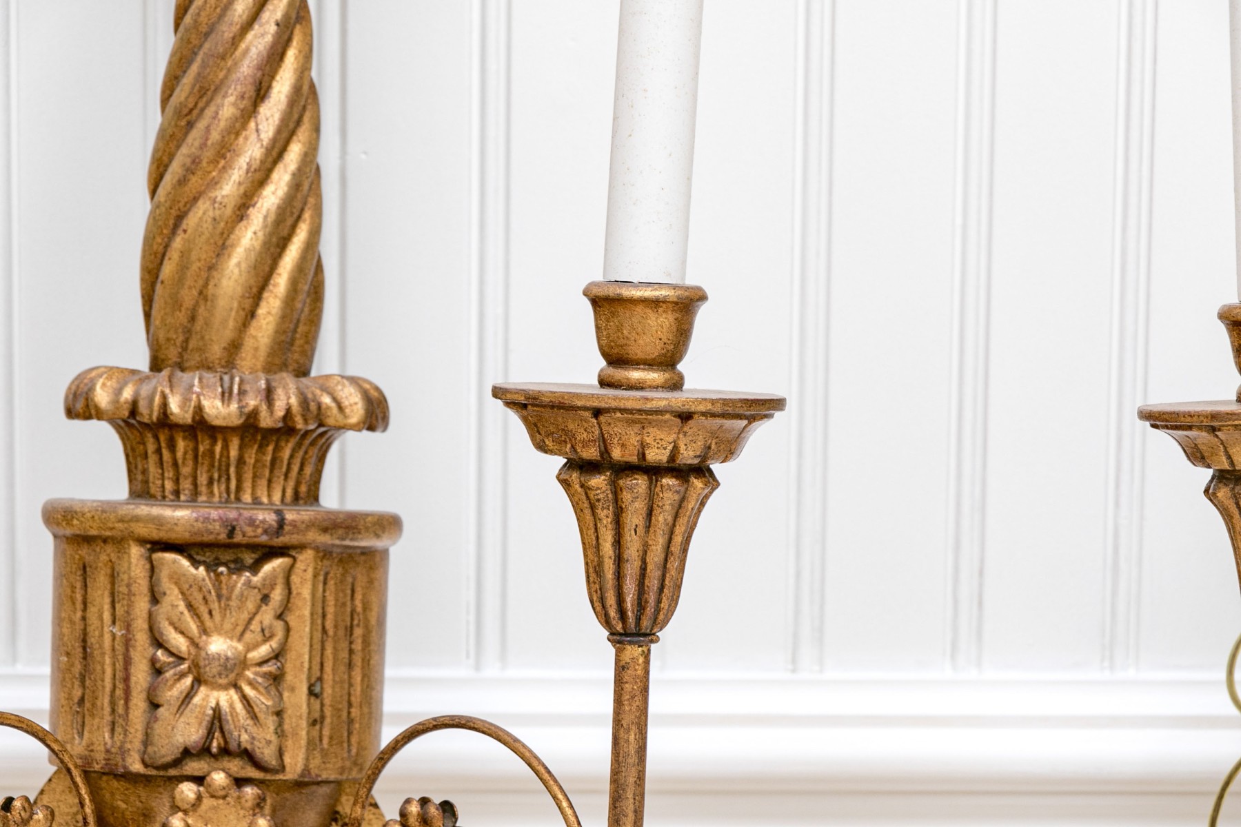 Tall twin-light wall sconces in the Federal style, now electrified. Each sconce features two arms, with an opposing eagle finial positioned above a barley twist design standard, embellished with floral and waterleaf motifs. Finished in an antiqued gilt finish.