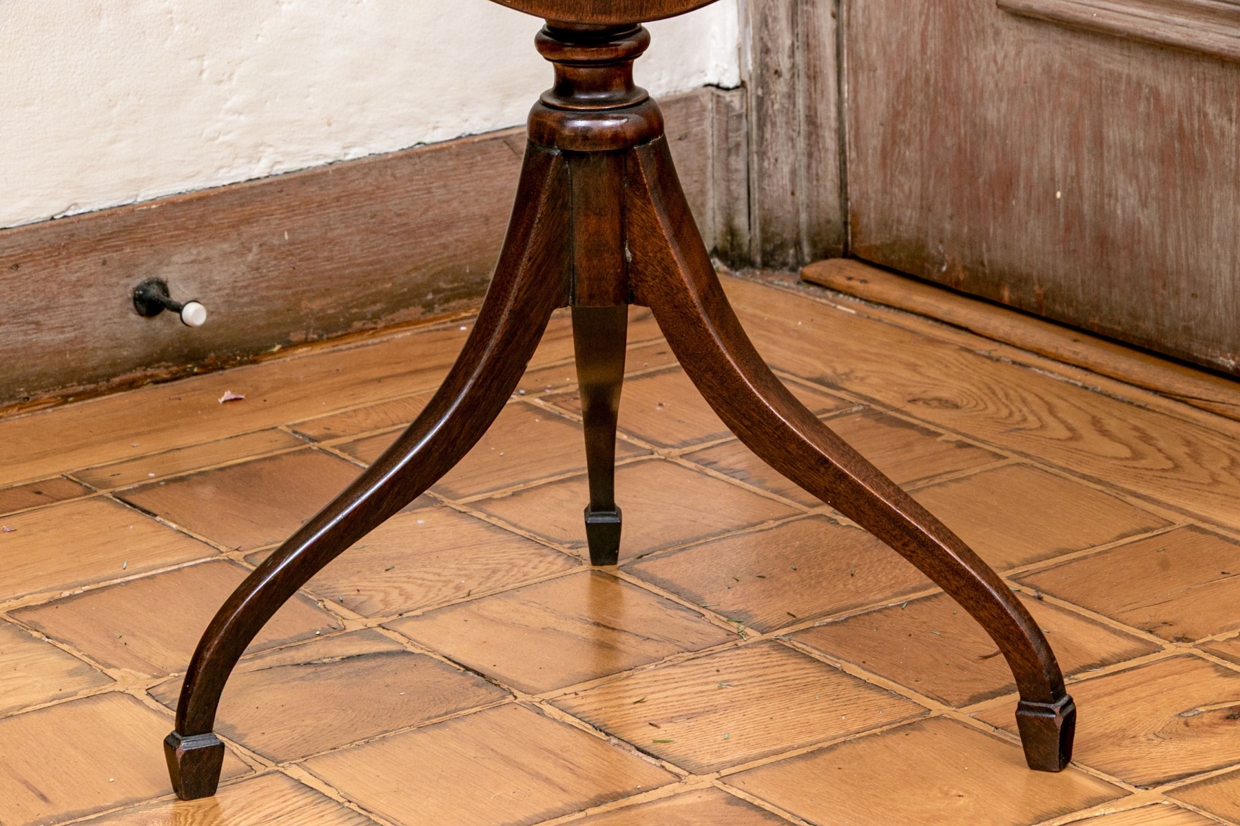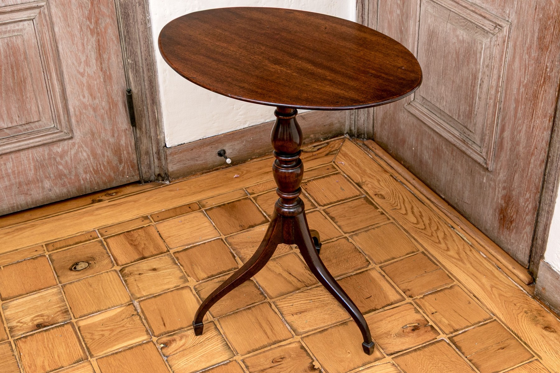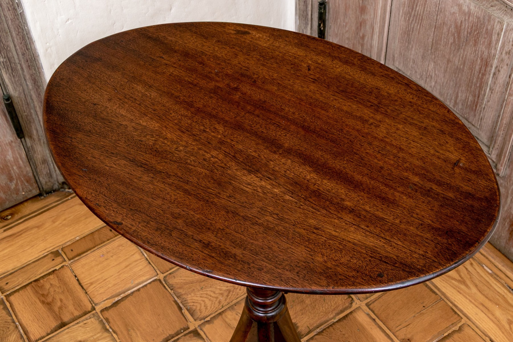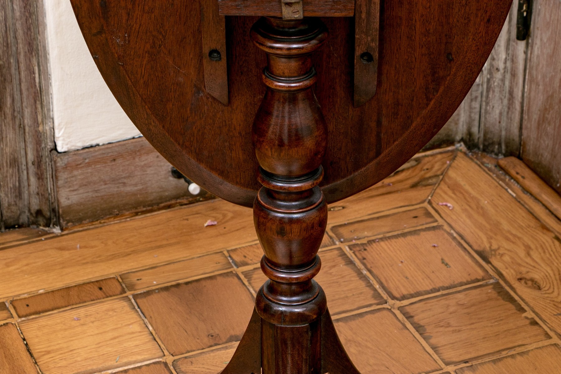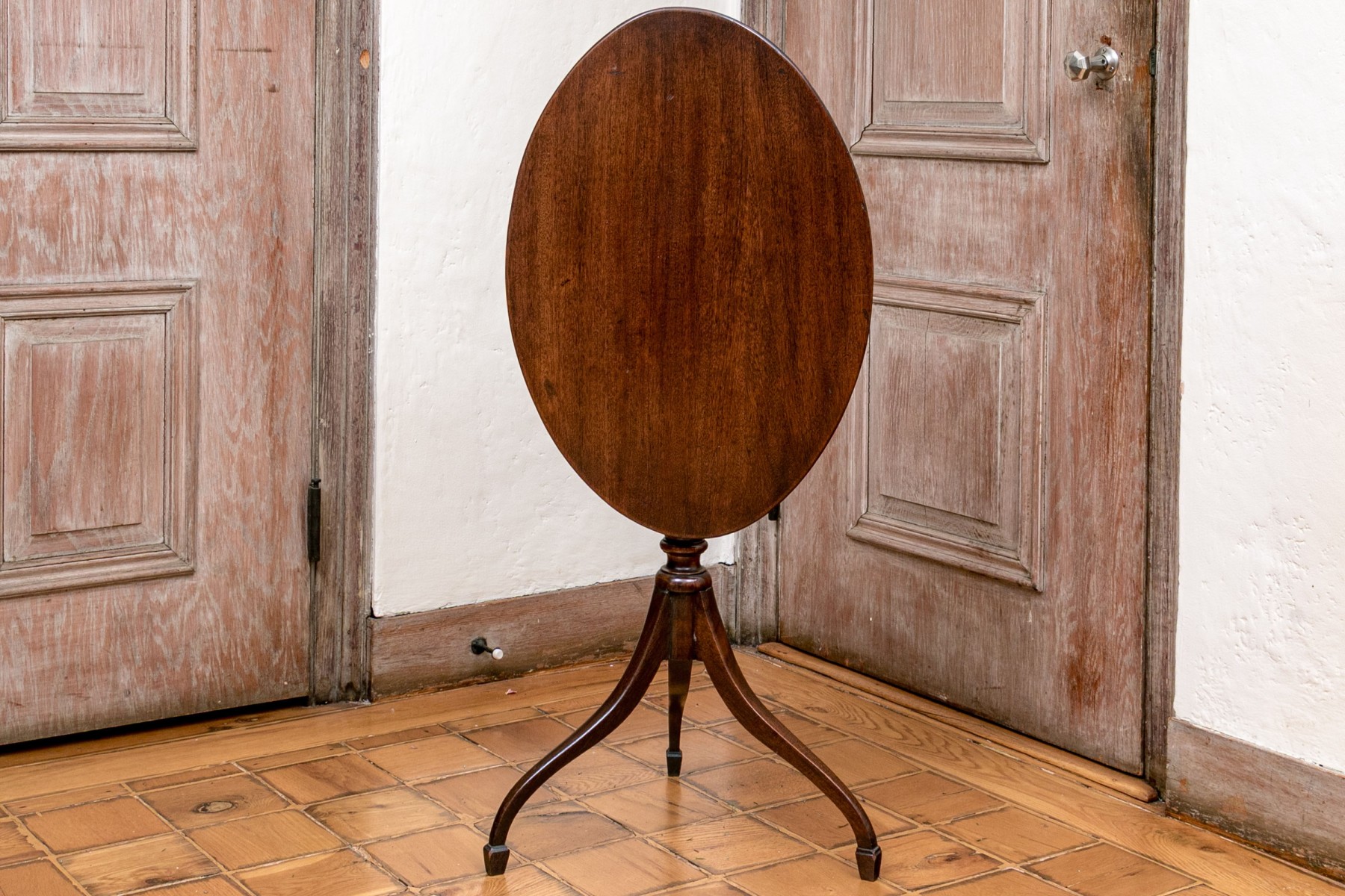 A delightful Federal gueridon perfect for versatile use as a candle stand, plant stand, lamp table, or wine table. The table is beautifully constructed with a rich, dark brown finish, showcasing a sleek oval tilt top supported by a shapely baluster column raised on a tripod of elegantly curved legs on spade feet.
