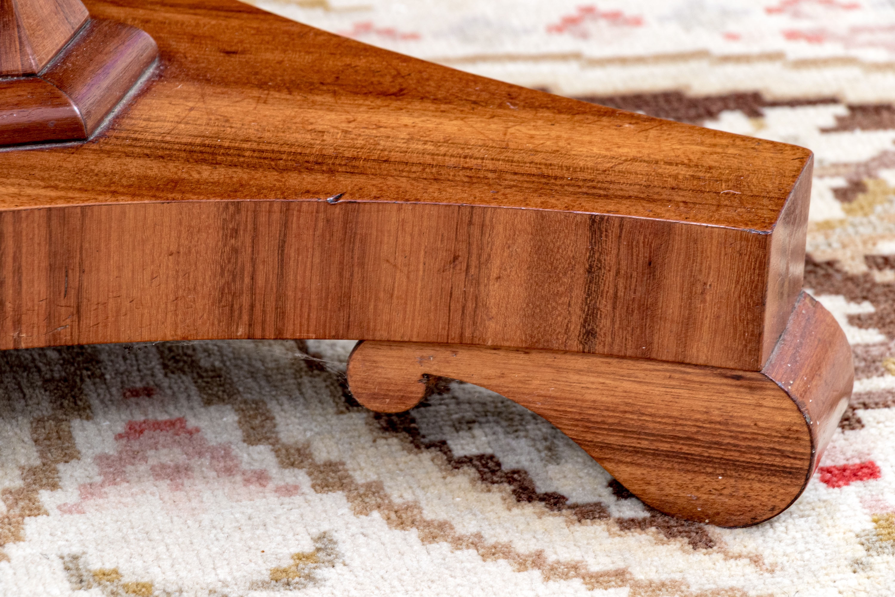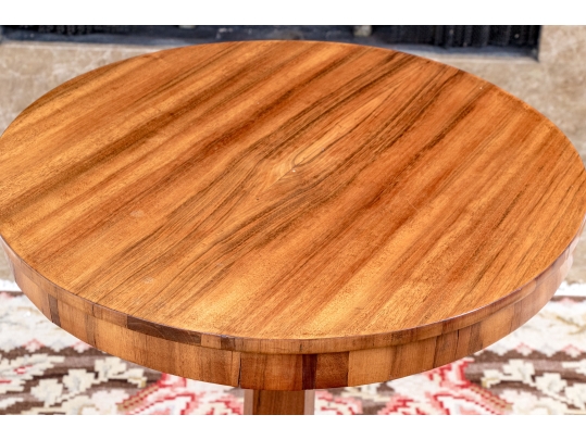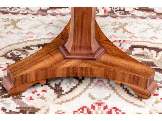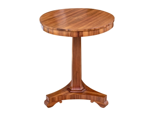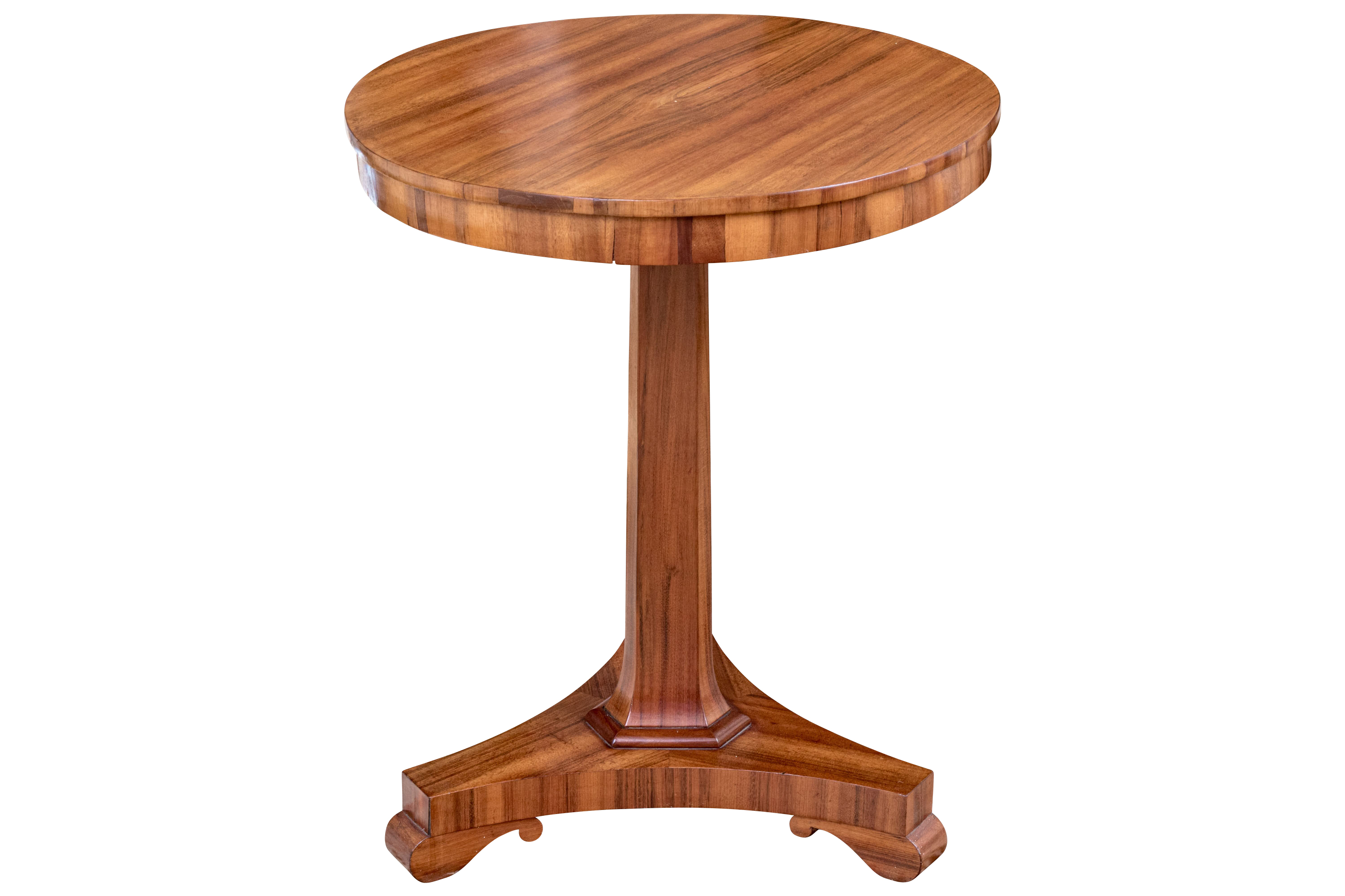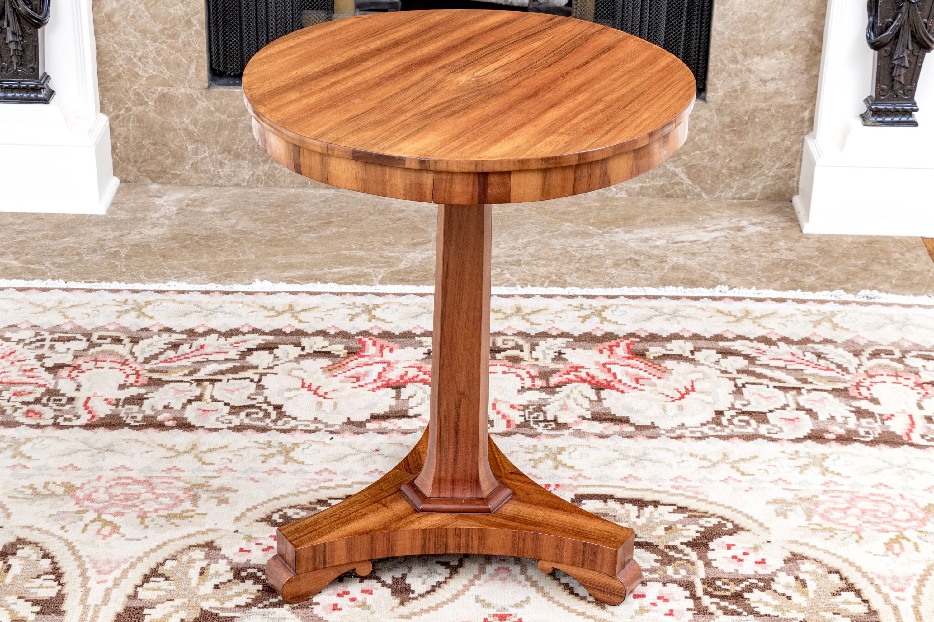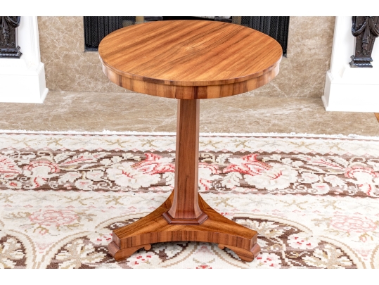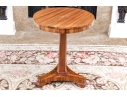 An Antique Mahogany Pedestal Side Table finely graining and color. The Table on three feet with trefoil form base with cylindrical columnar support and circular table top.